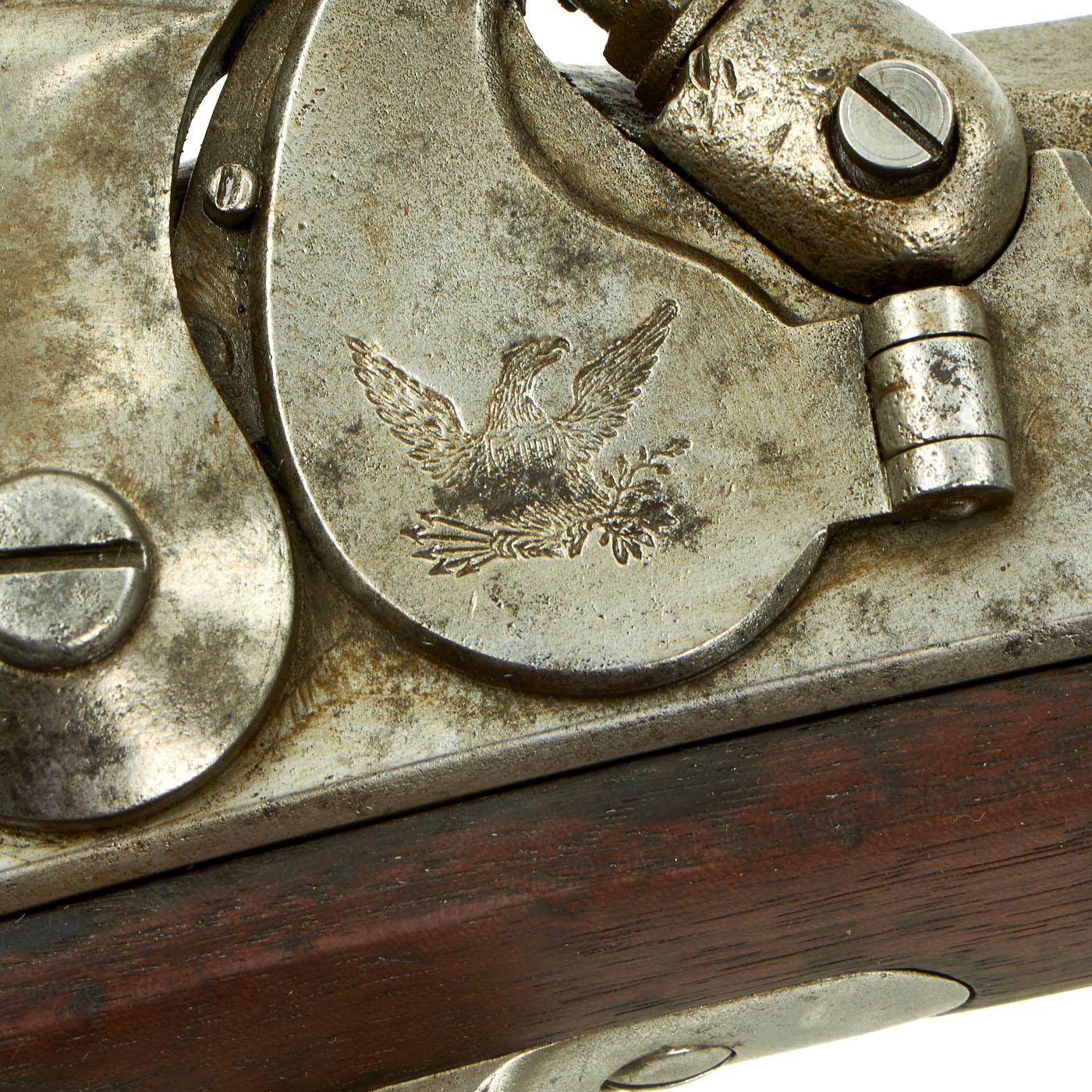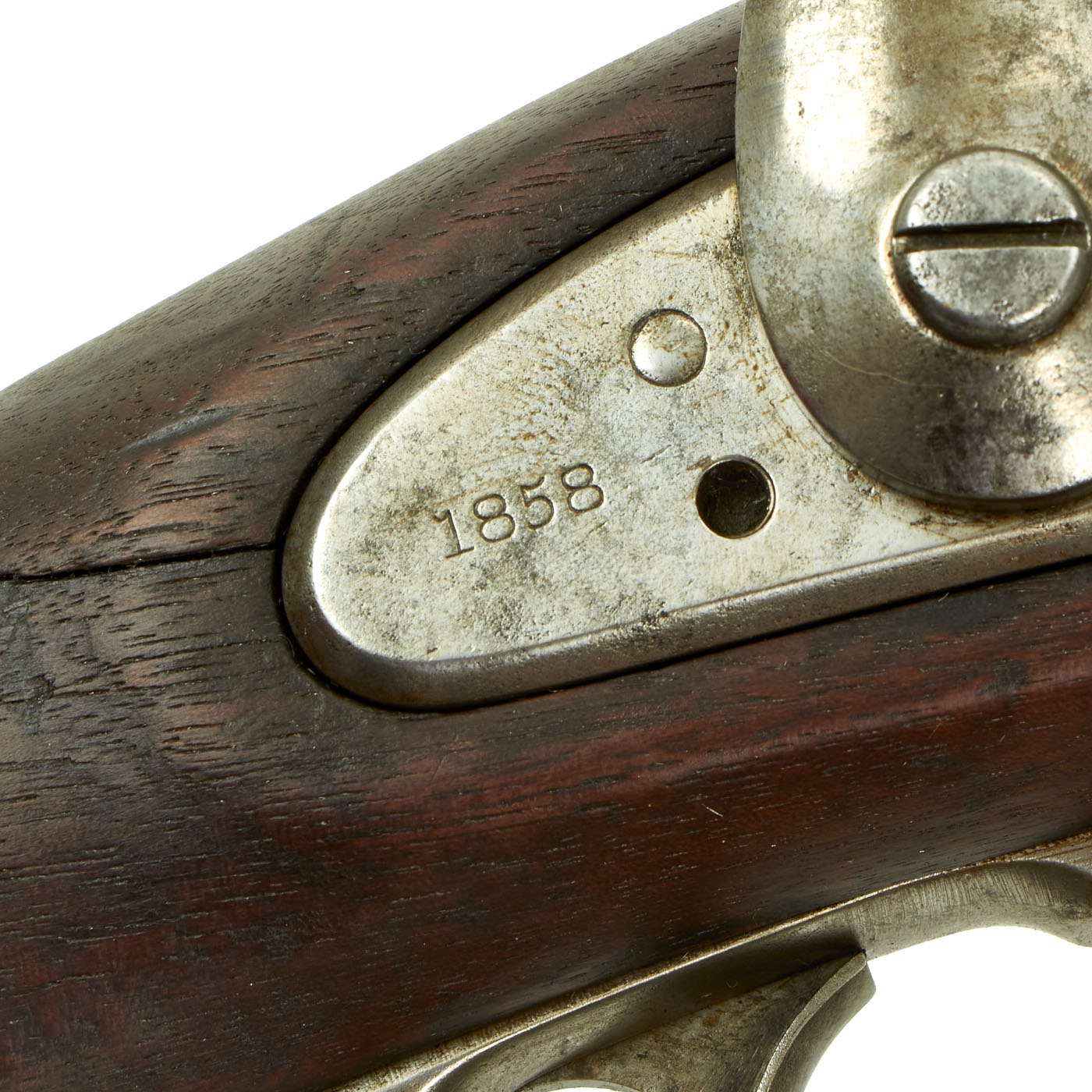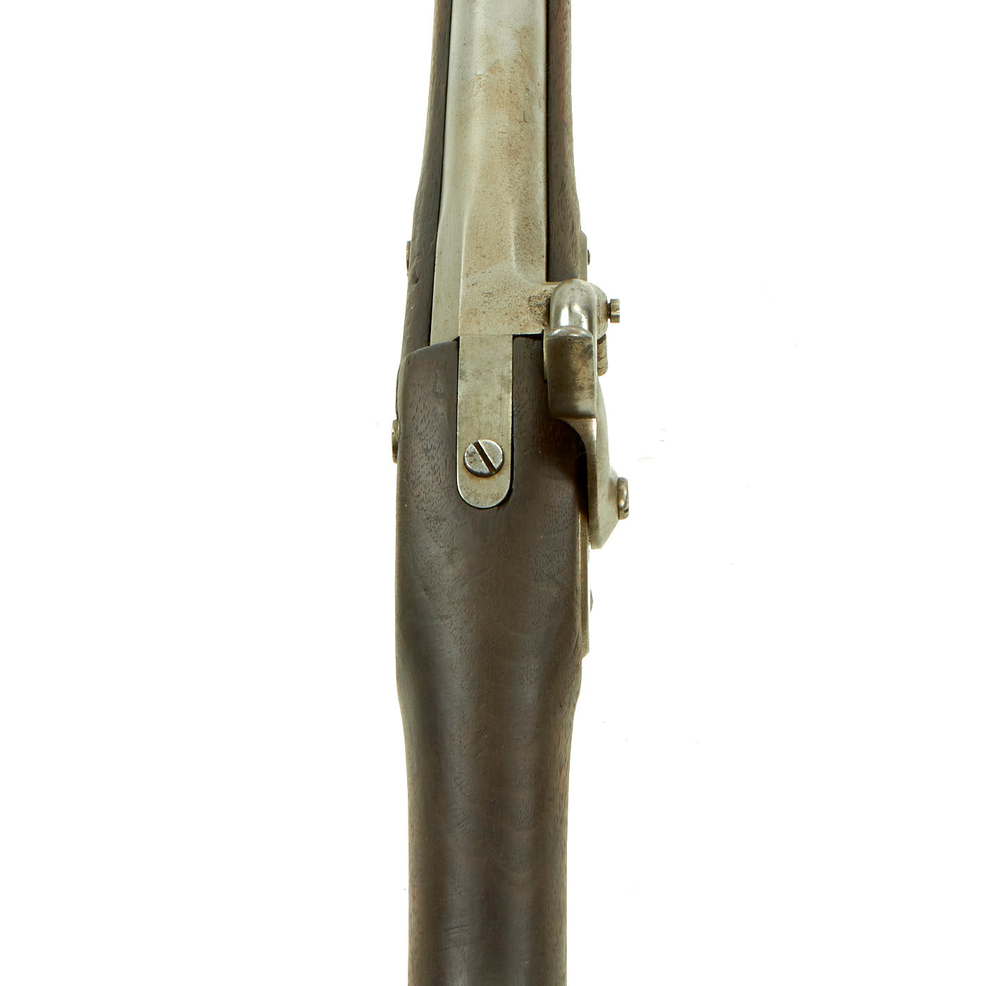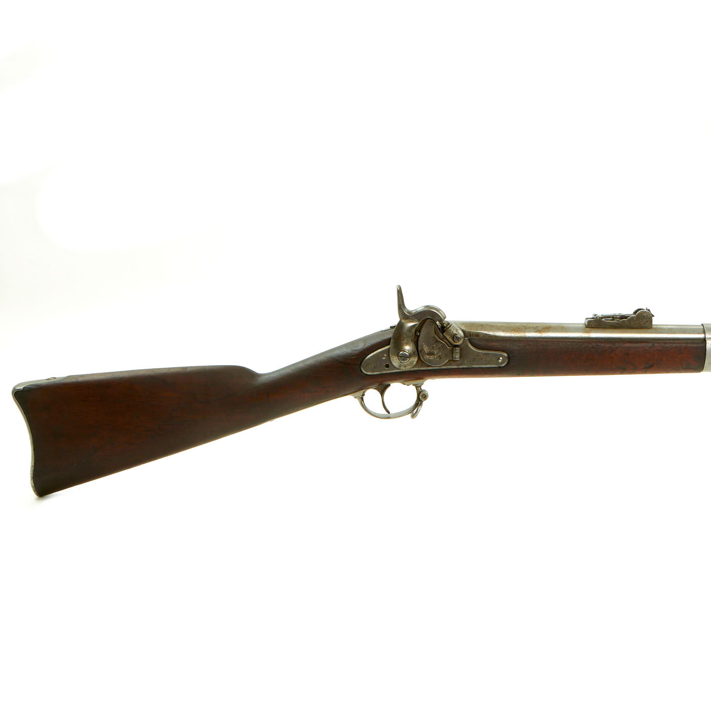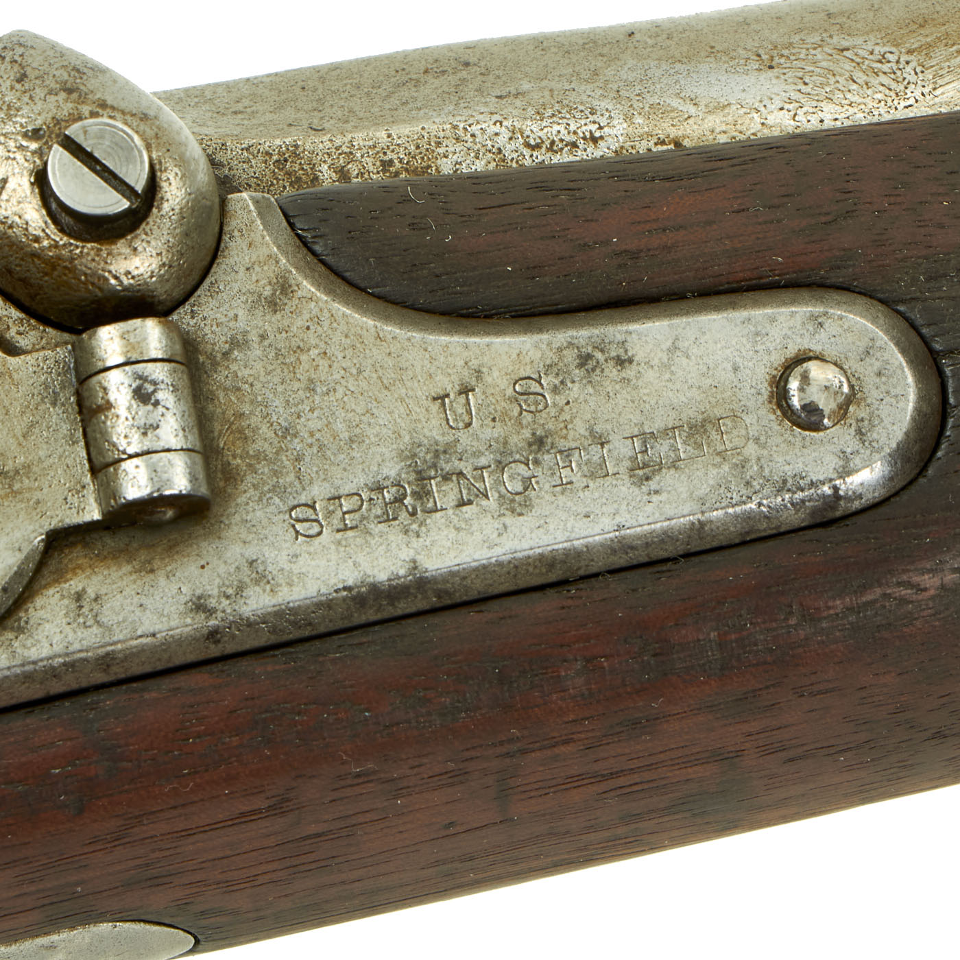 The Lock is on this example marked U.S. / SPRINGFIELD with a Spread Eagle stamped into the Maynard tape primer's steel cover. It is dated 1858 on the lock plate tail, the year of production at the United States Armory and Arsenal at Springfield, located in the city of Springfield, Massachusetts. The first federal armory of any type, it was the primary center for the manufacture of United States military firearms from 1777 until its closing in 1968.