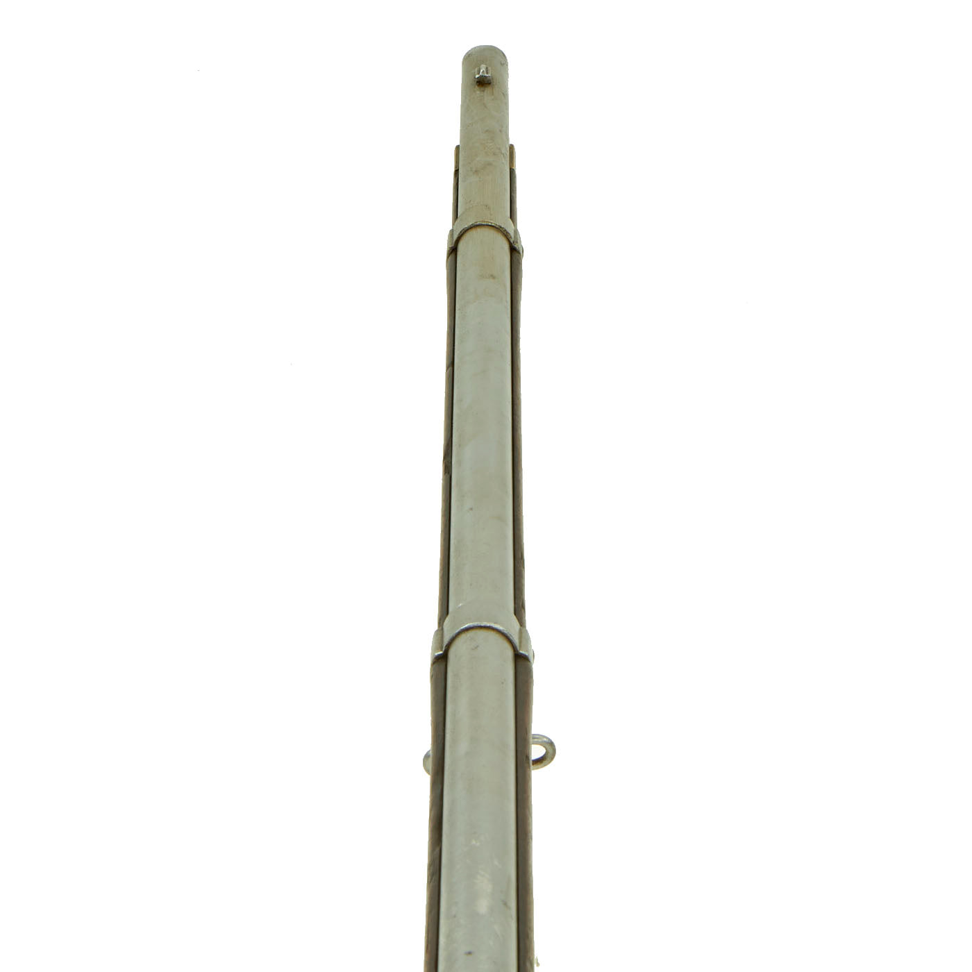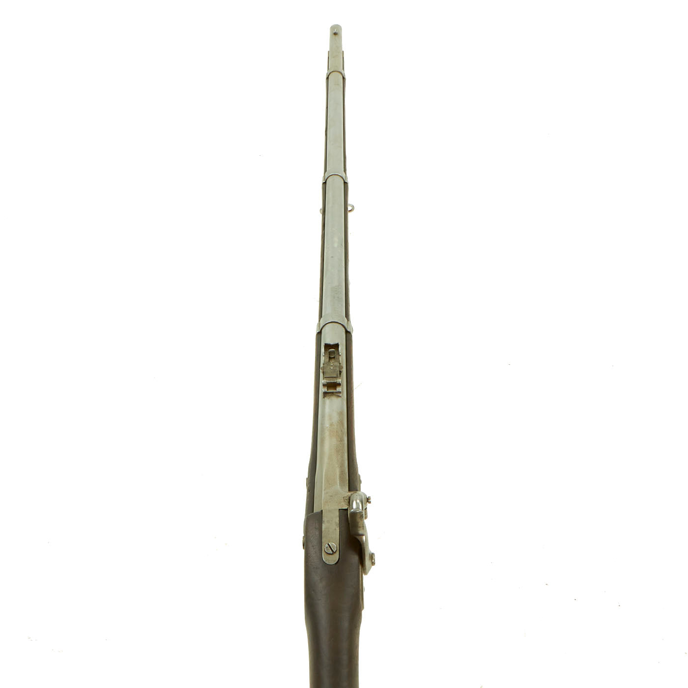 The metalwork overall has a polished matte patina from decades of gradual wear from cleaning and light oxidation. We checked the bore, and the rifling is still present, and in very good condition considering it is a muzzle loader from the black powder days. There are some areas of light pitting and fouling, but the three grooves are still clearly visible, and have some machining marks still visible. Both sling loops are present, without any issues, and the correct tulip headed cleaning rod is still present. All three barrel bands still show the correct U stamps on the right side, with a U.S. stamped on the butt plate.