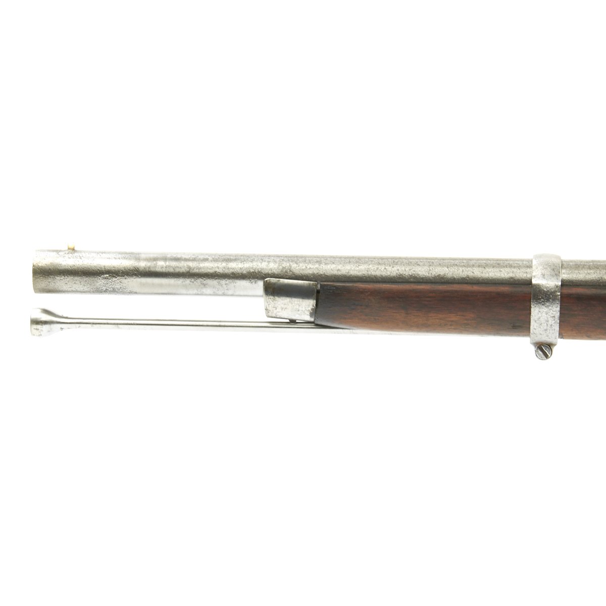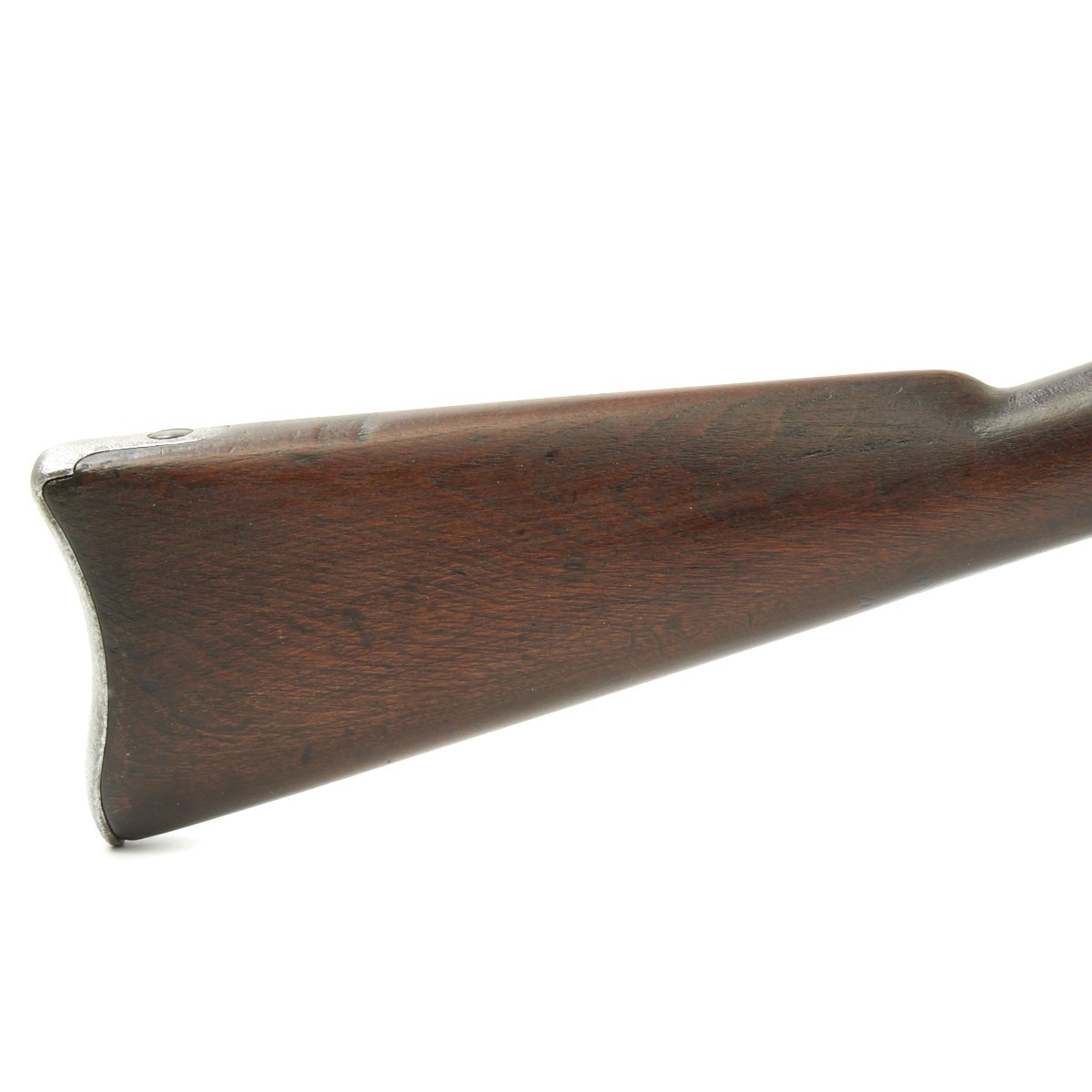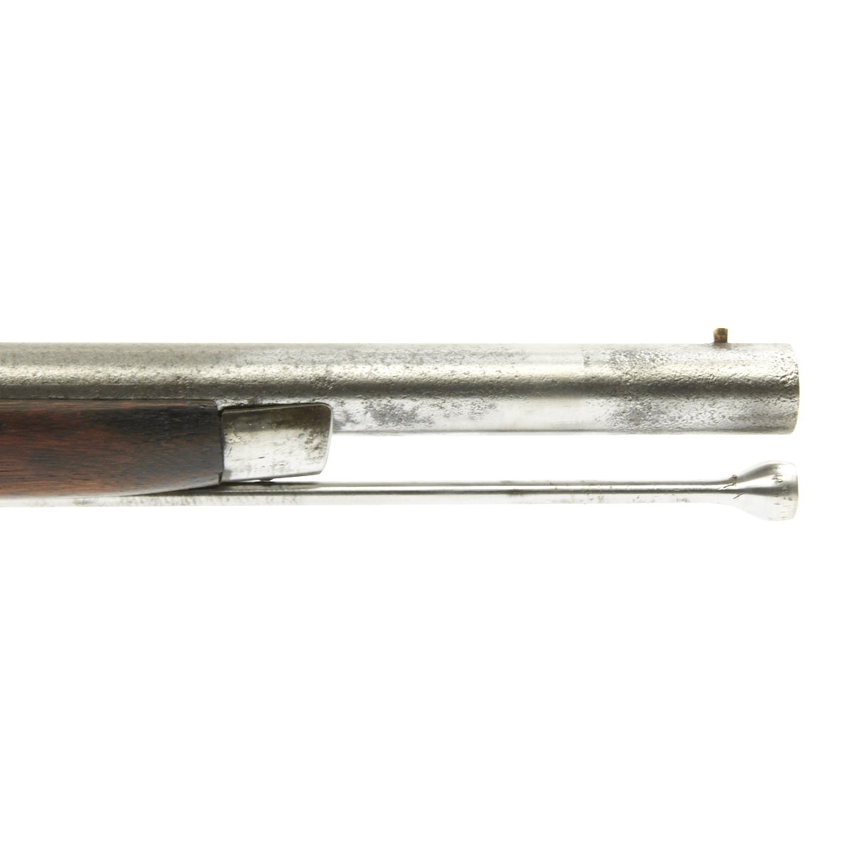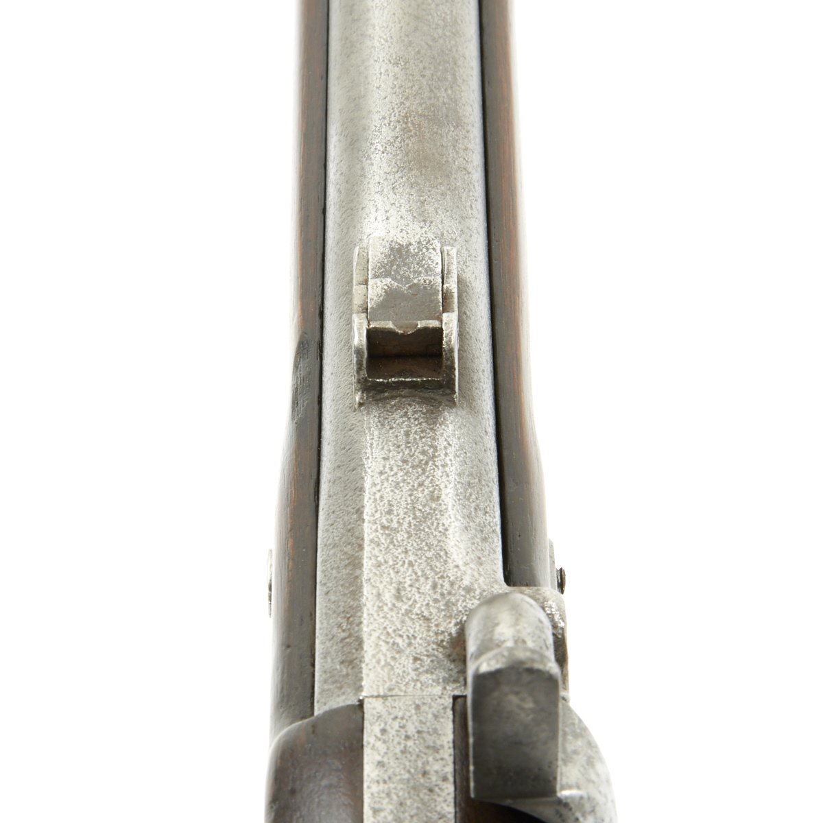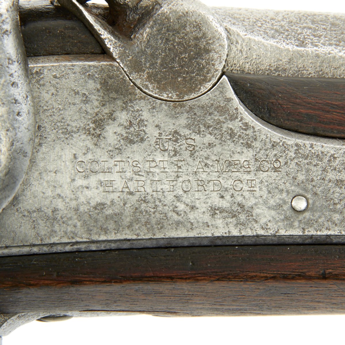 The metalwork overall shows peppering from past pitting, but it has been fullly cleaned and restored go put it in its best light. The area around the cap lock nipple has a lot of powder burn, which also has partly corroded through the nipple. It also has made the barrel markings somewhat hard to read, but under the right light the V / P / Eagle Head proofs can still be seen. The lock functions correctly, with a strong action, and it holds at half cock. This gun has the Colt Special double leaf rear sight, and both barrel bands still have their U markings, with a U.S. on the butt plate tang. The ramrod is the correct and original tulip type.