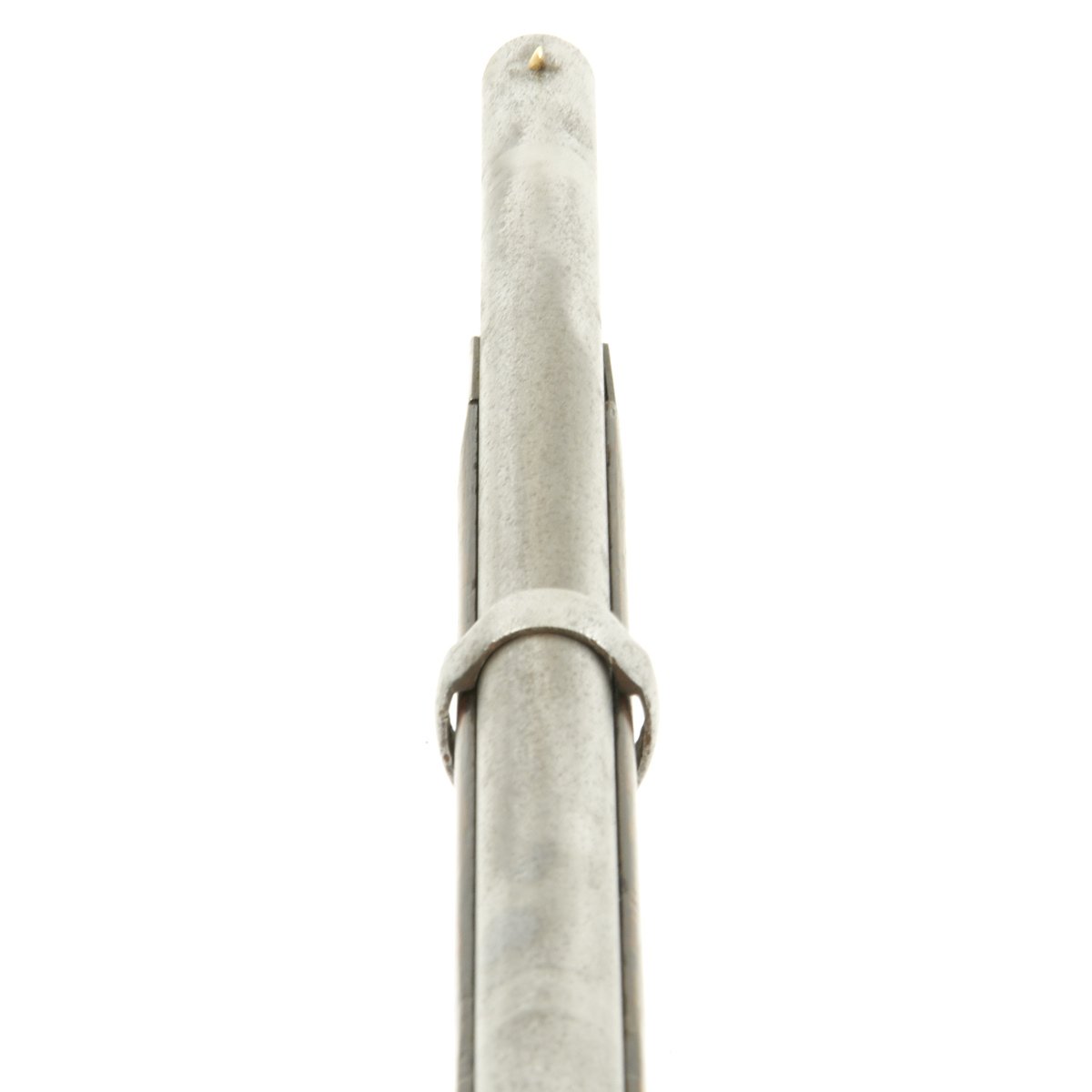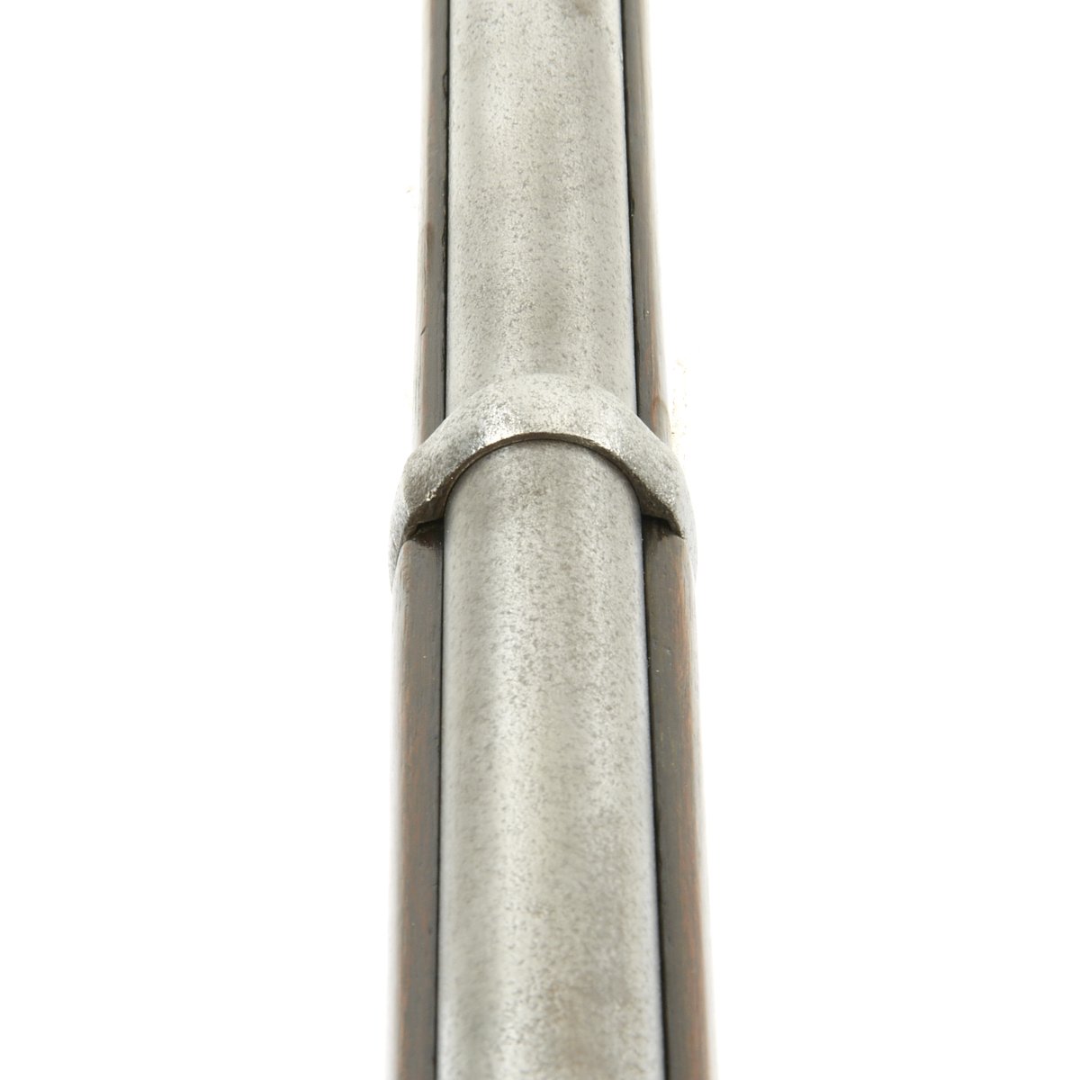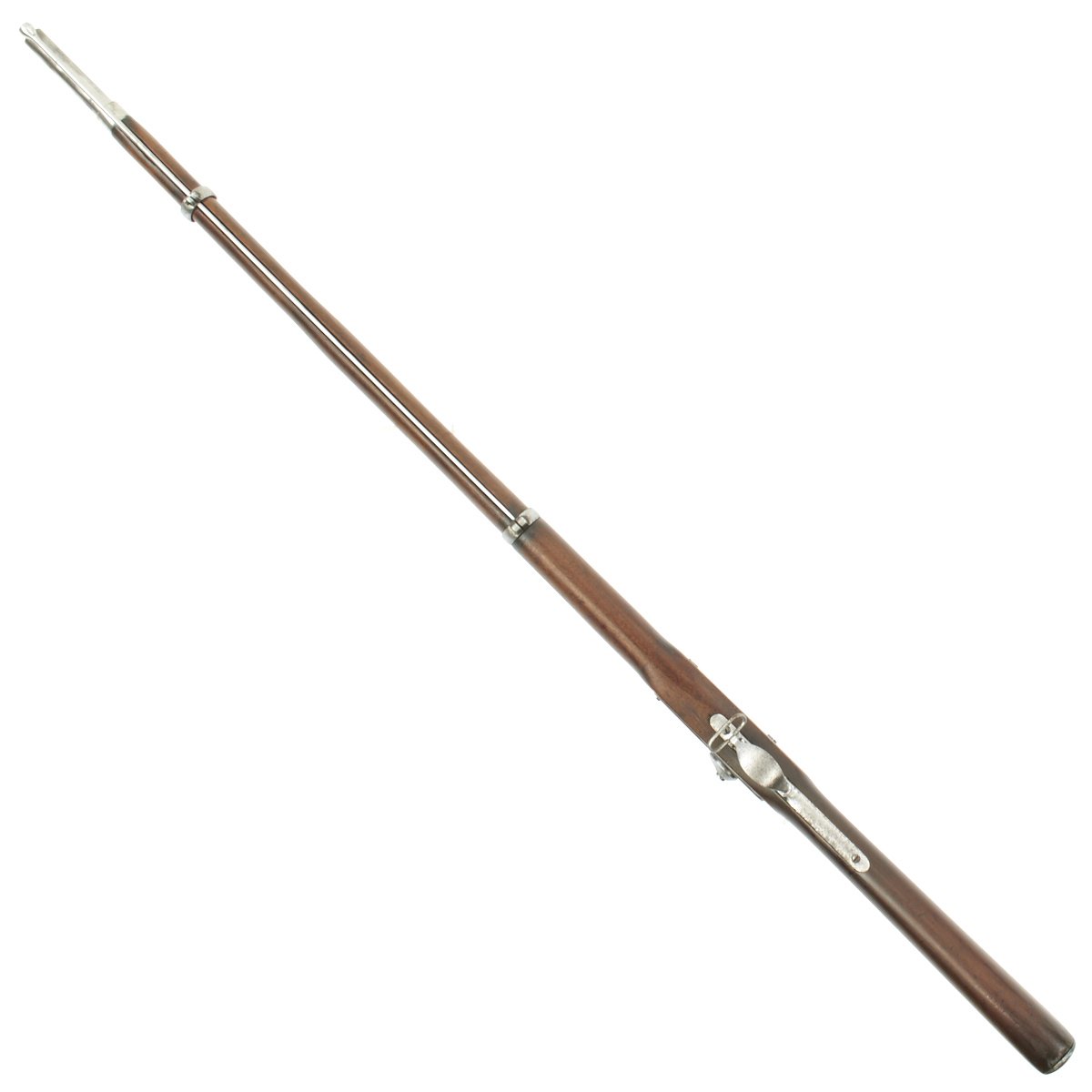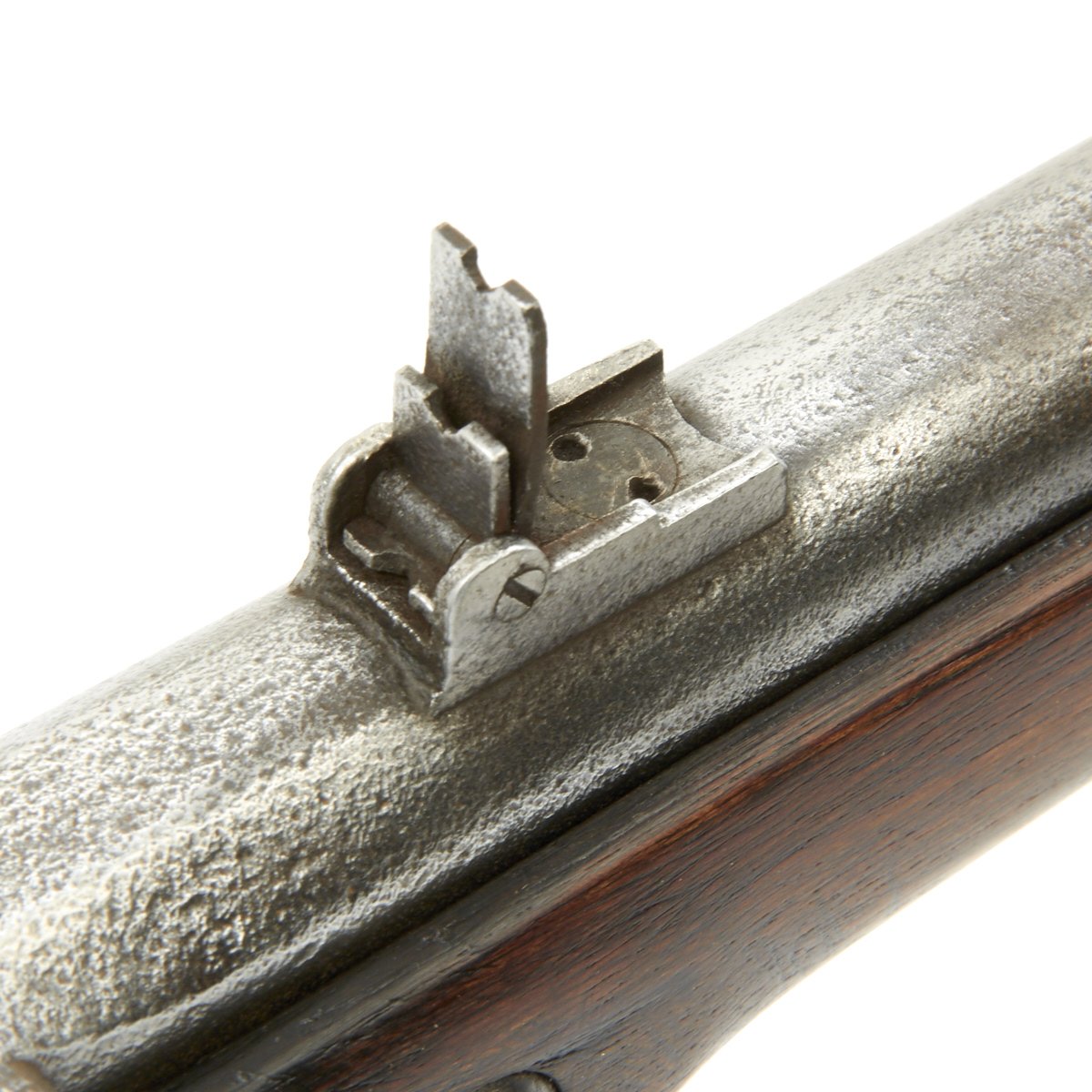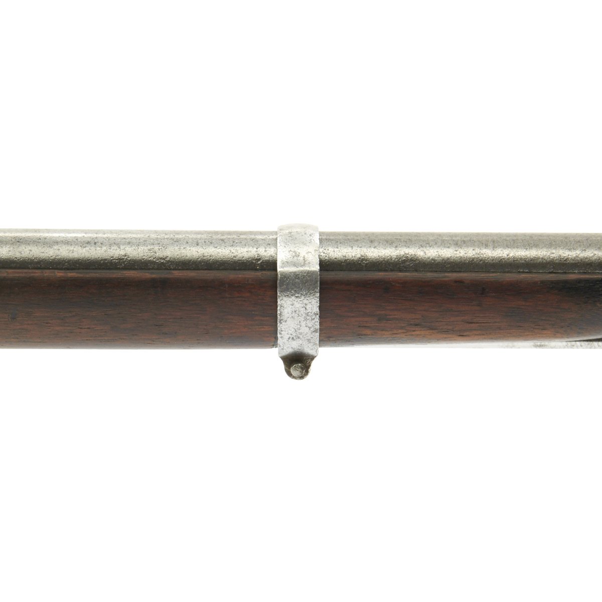 The metalwork overall shows peppering from past pitting, but it has been fullly cleaned and restored go put it in its best light. The area around the cap lock nipple has a lot of powder burn, which also has partly corroded through the nipple. It also has made the barrel markings somewhat hard to read, but under the right light the V / P / Eagle Head proofs can still be seen. The lock functions correctly, with a strong action, and it holds at half cock. This gun has the Colt Special double leaf rear sight, and both barrel bands still have their U markings, with a U.S. on the butt plate tang. The ramrod is the correct and original tulip type.