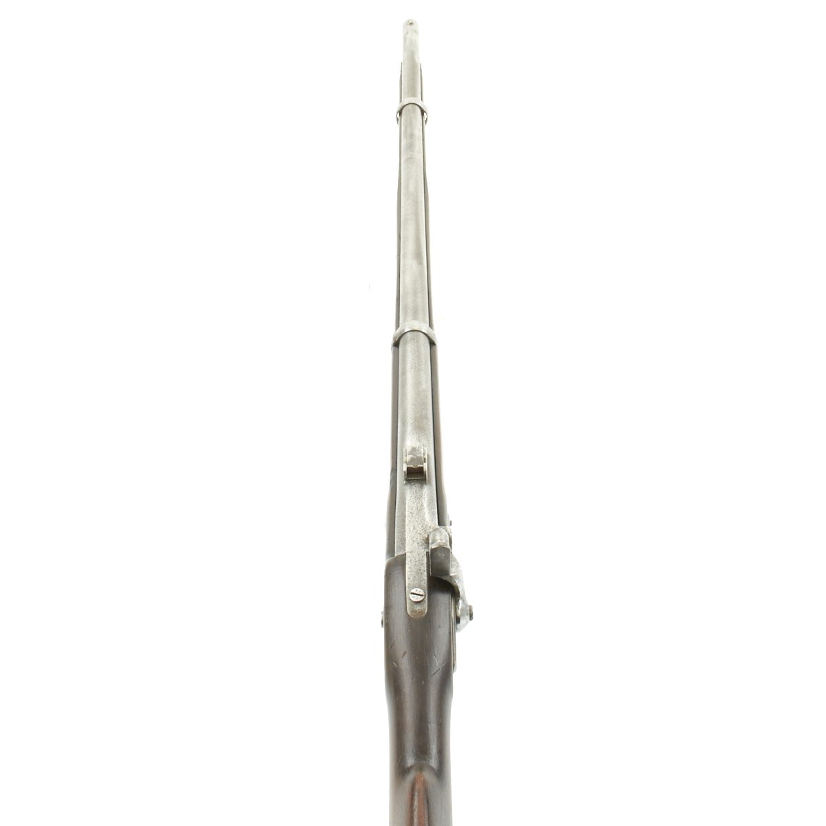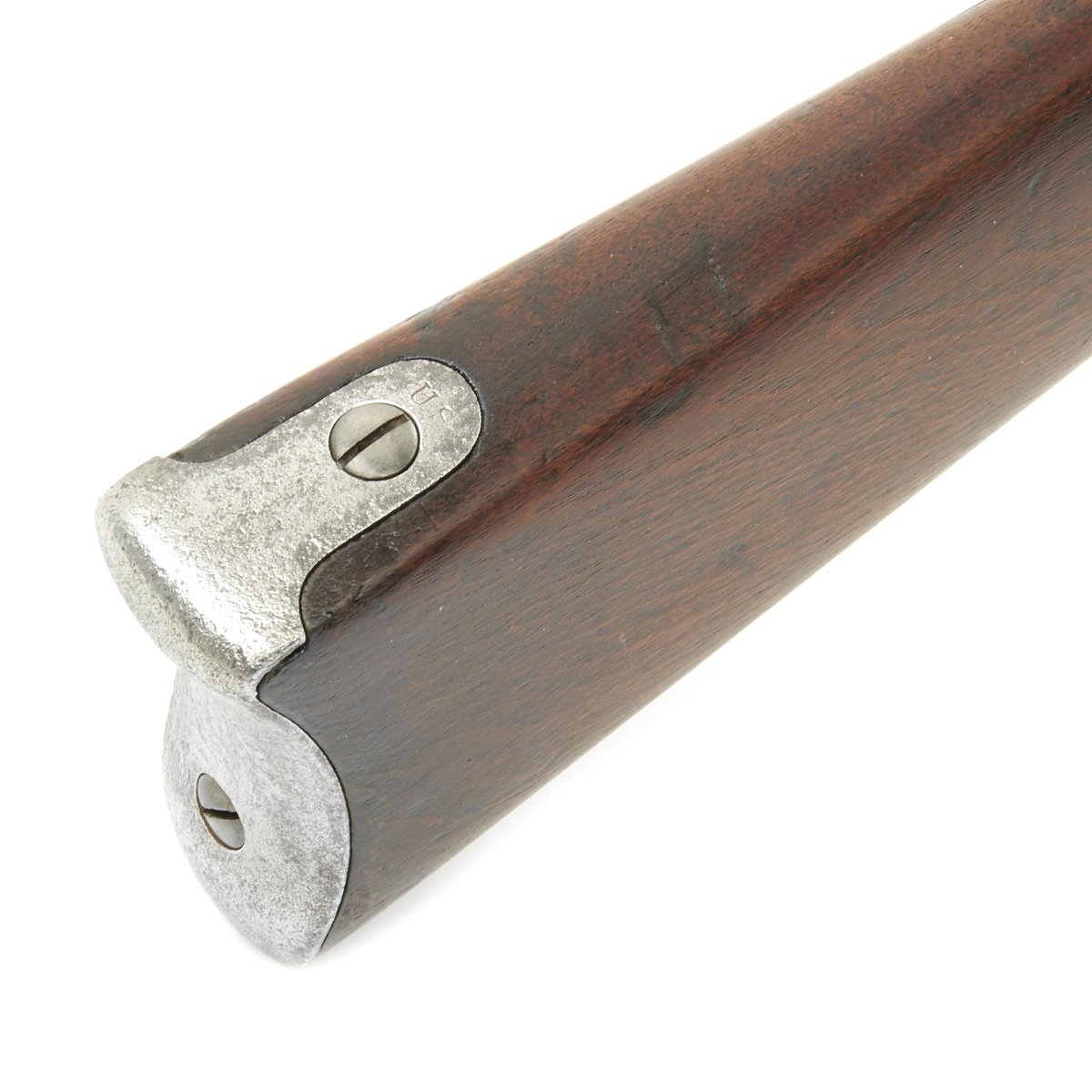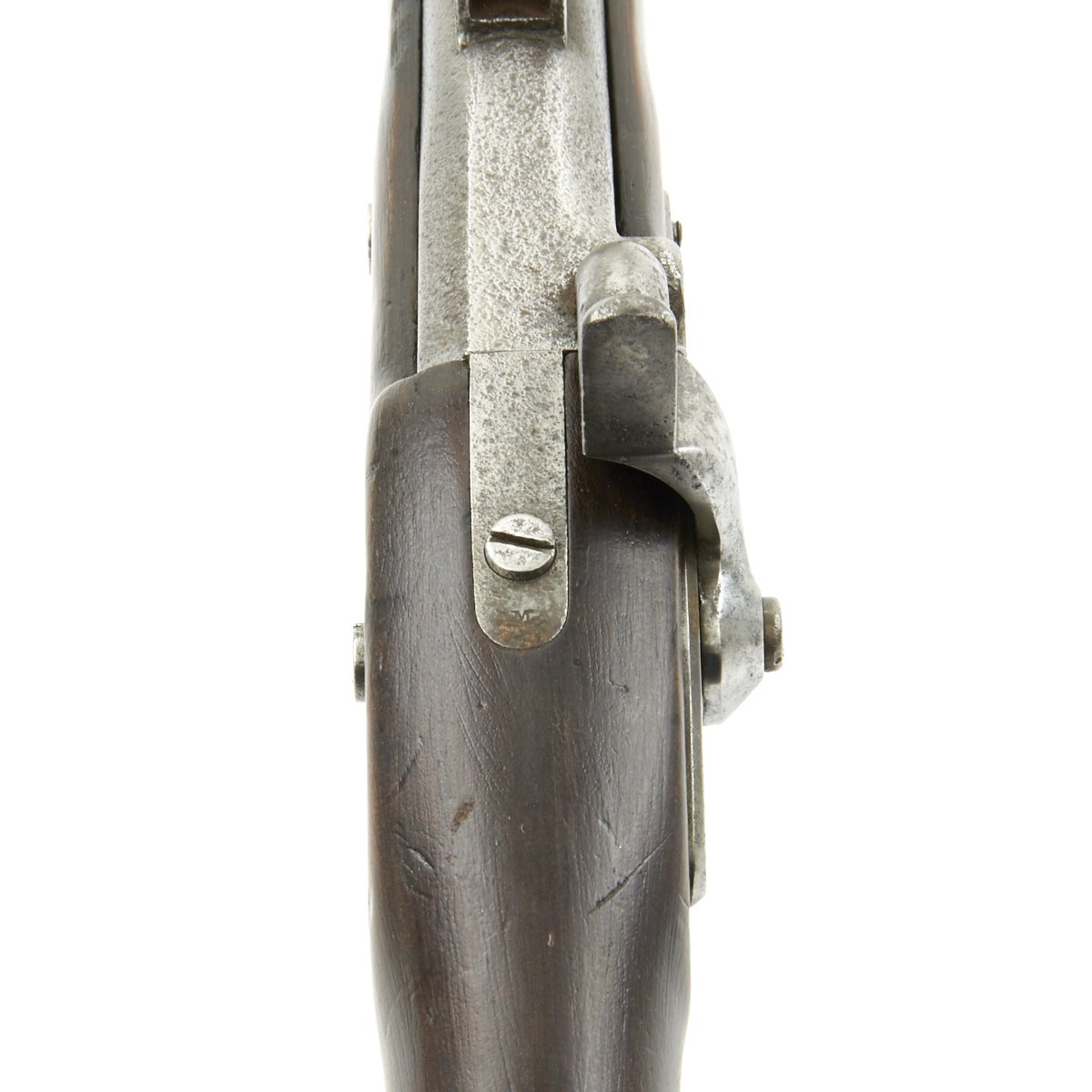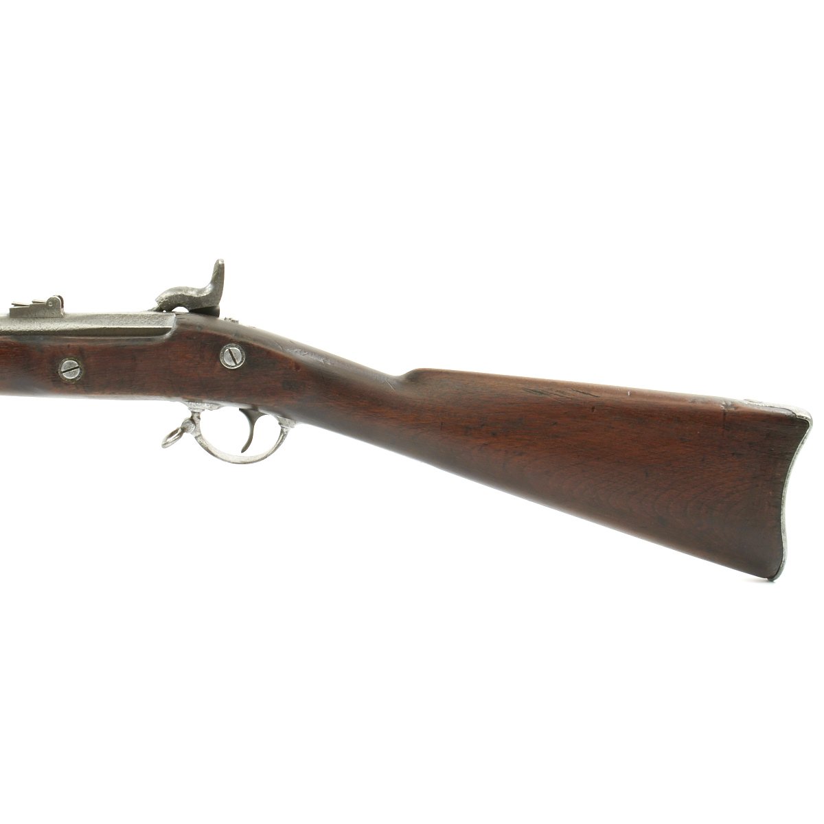 This example however was not converted, and is still in the original percussion format, though it was reduced in length by about 5 inches sometime after production, making it more of a short rifle. It is dated 1863 on the lock plate tail, and is marked under the bolster with: