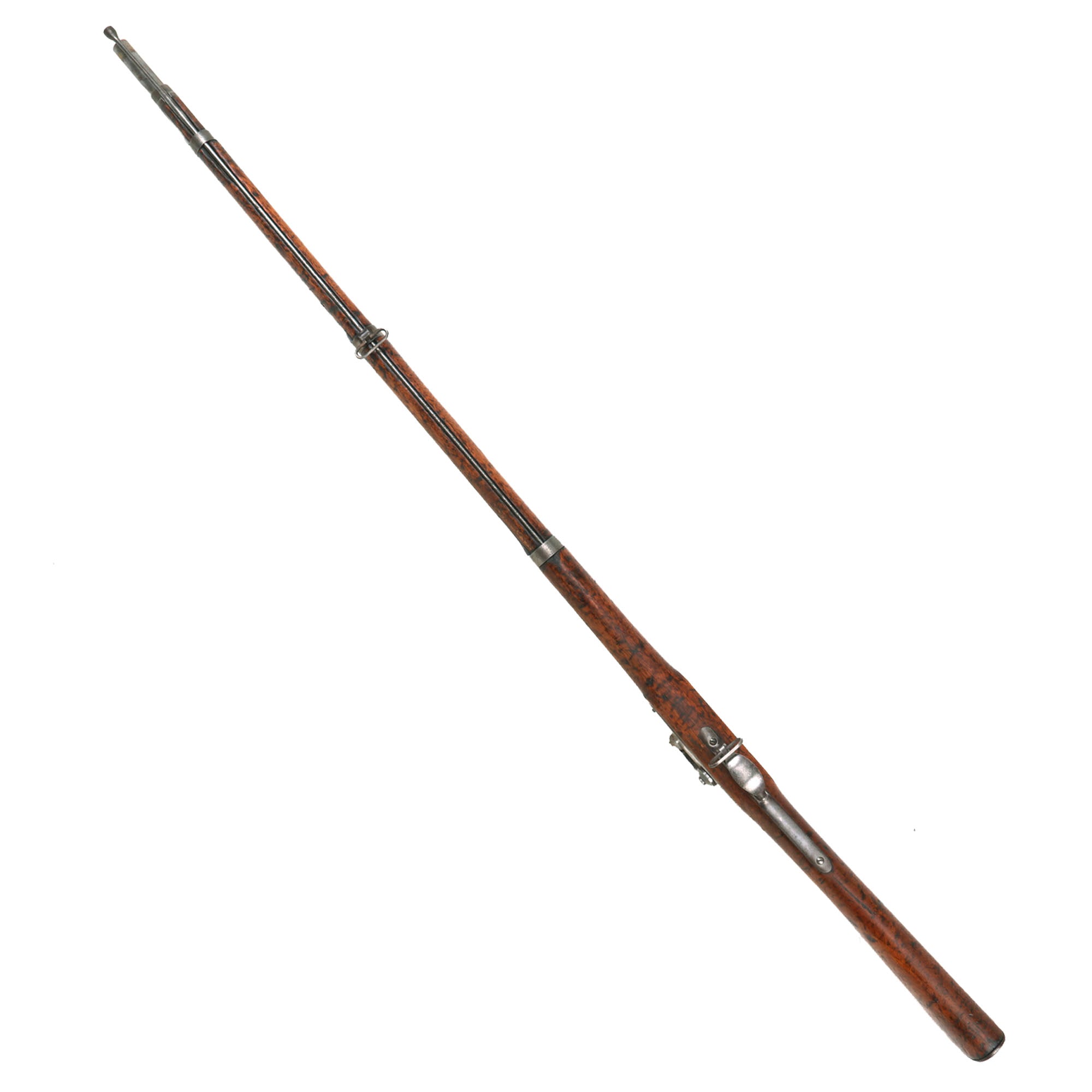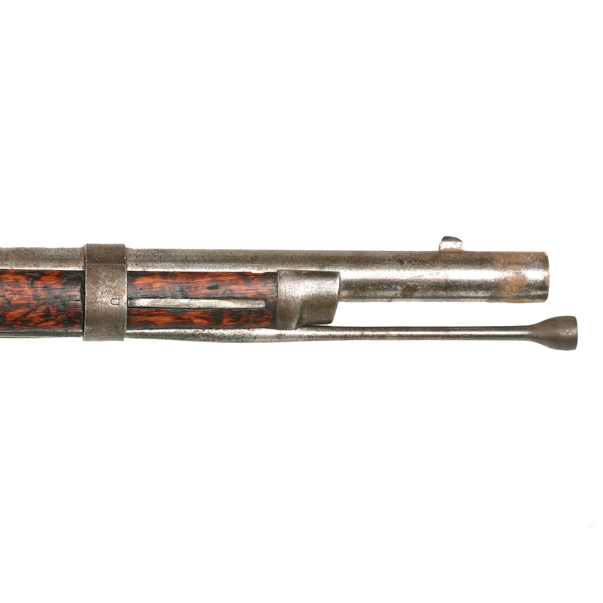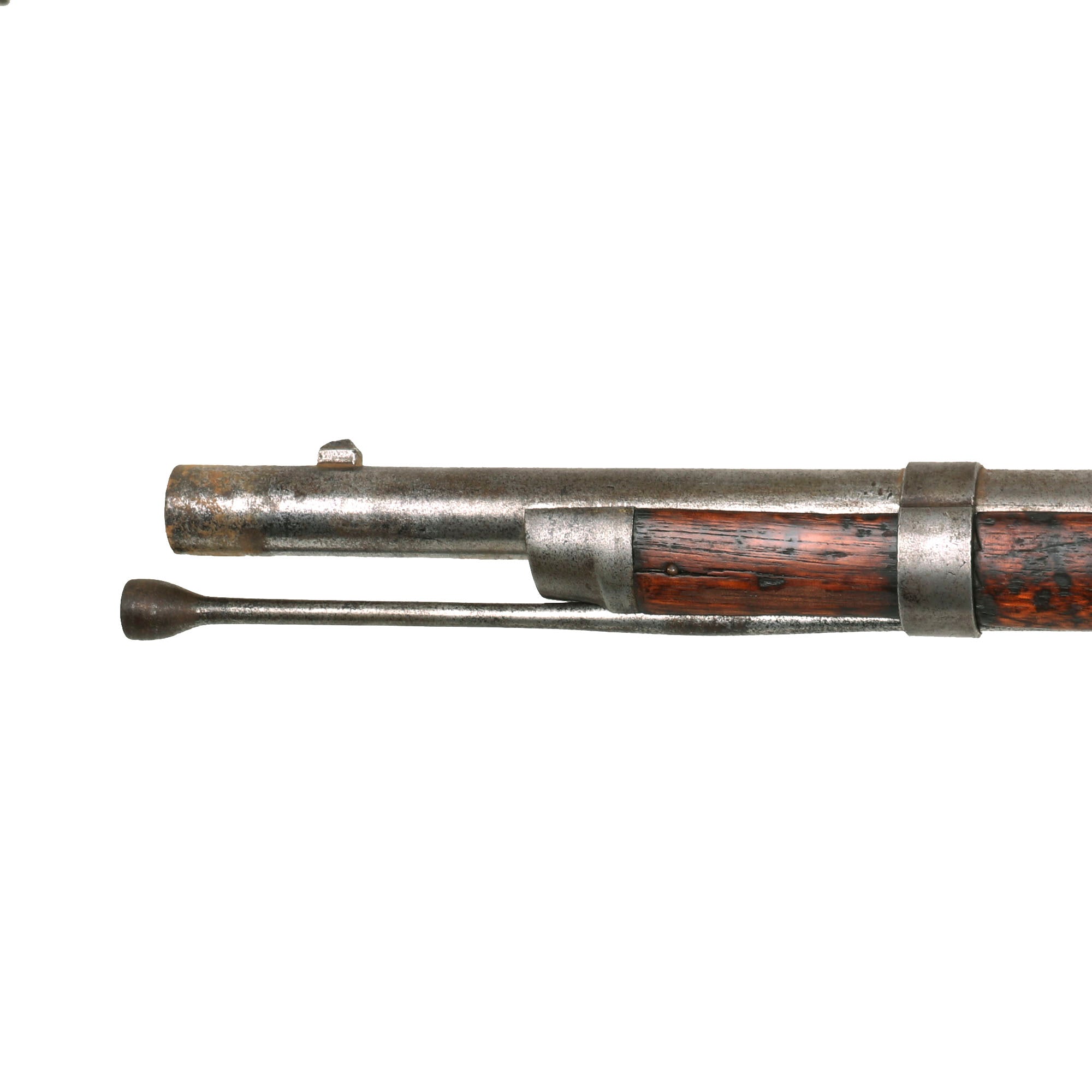 The lock functions correctly, holding at half cock and firing at full, though the cleanout on the bolster is currently frozen. This gun is fitted with a later style 2 leaf rear sight, as used on the Model 1863 TypeI II muskets, which functions well. Both sling swivels are intact and move freely. The ramrod is the correct and original tulip type with an enlarged shank, and has intact but worn threads on the end.