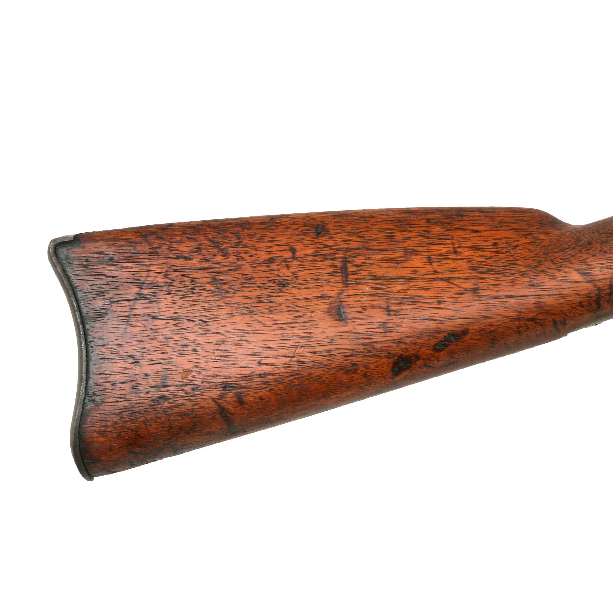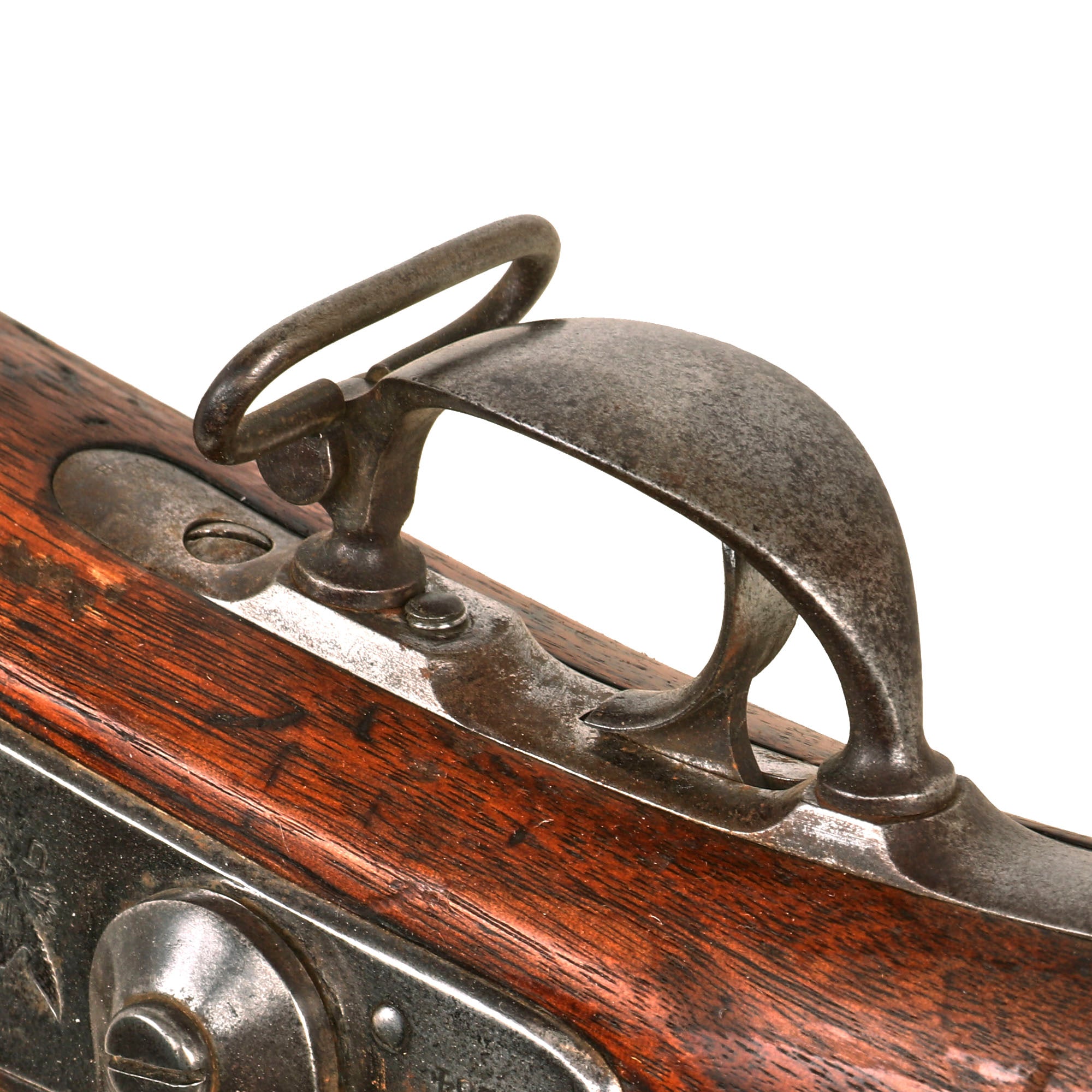 The walnut stock is in lovely shape, showing a lovely red brown color, with the expected dents and dings from use in service. It has a great matured look, showing no major restoration or alterations during its life, and there is an old nailed repair on the right side of the barrel tang, which later broke away. There are two faint "boxed" inspection cartouches on the left side of the stock by the lock screws, but we cannot read them. Definitely some great history to this rifled musket, and some nice research potential.