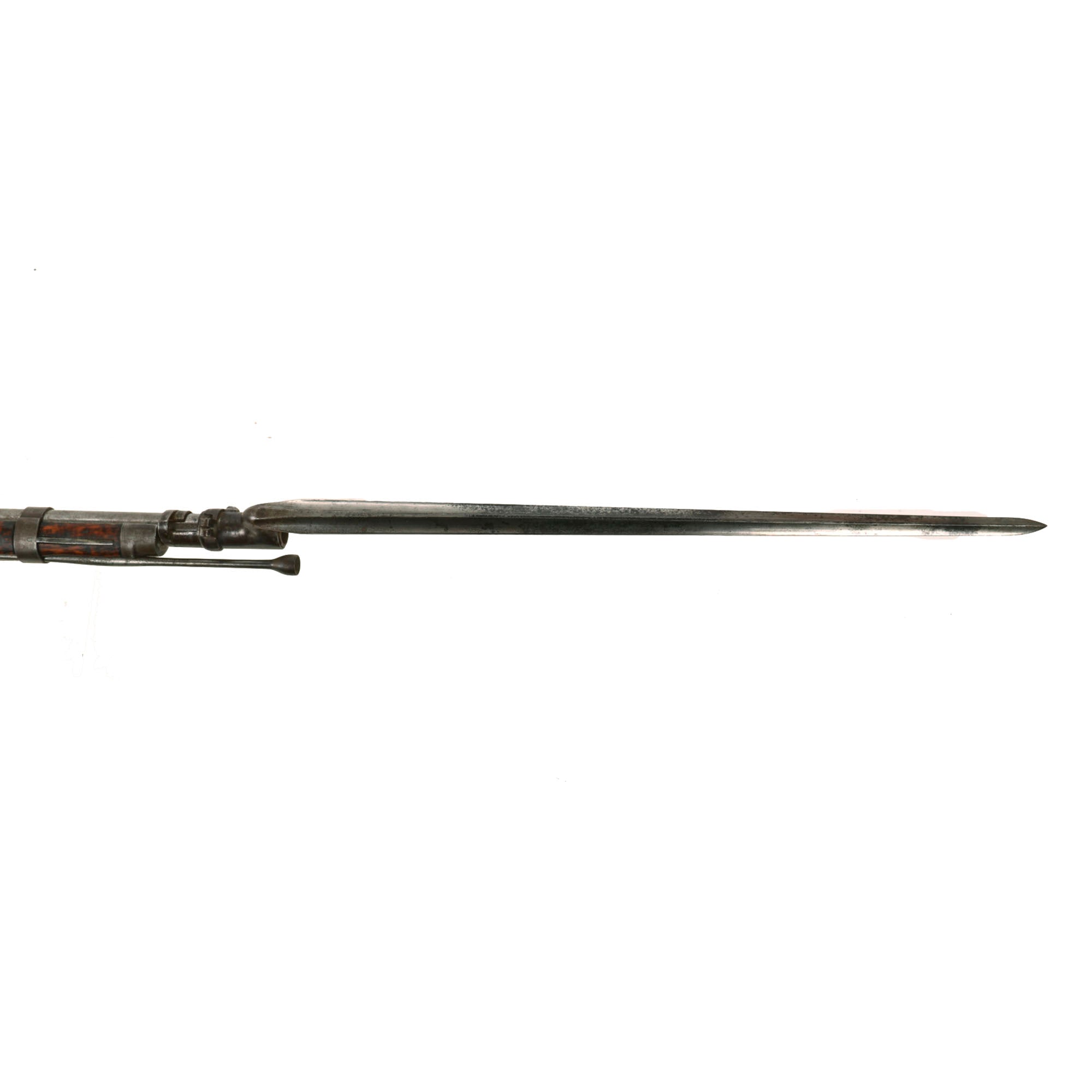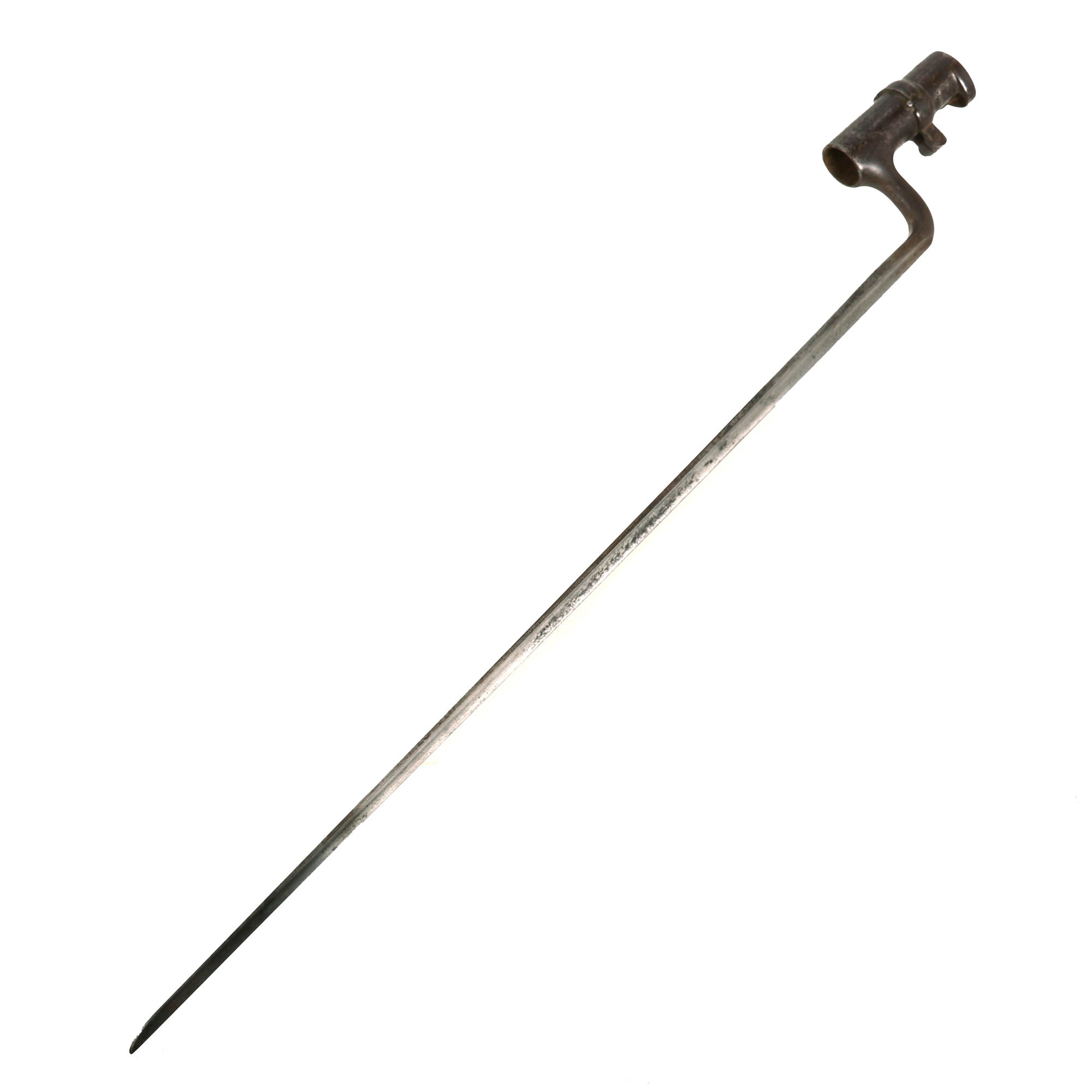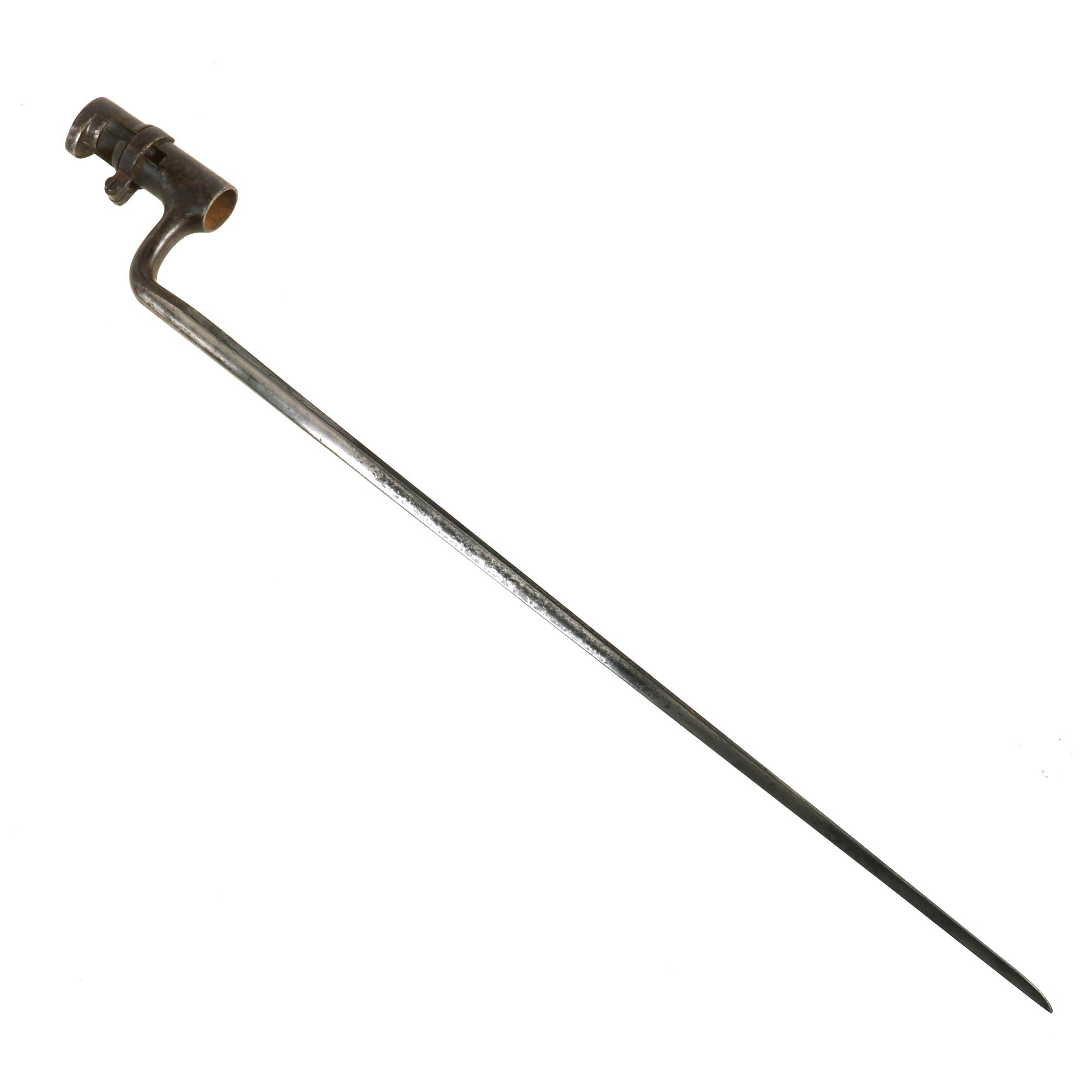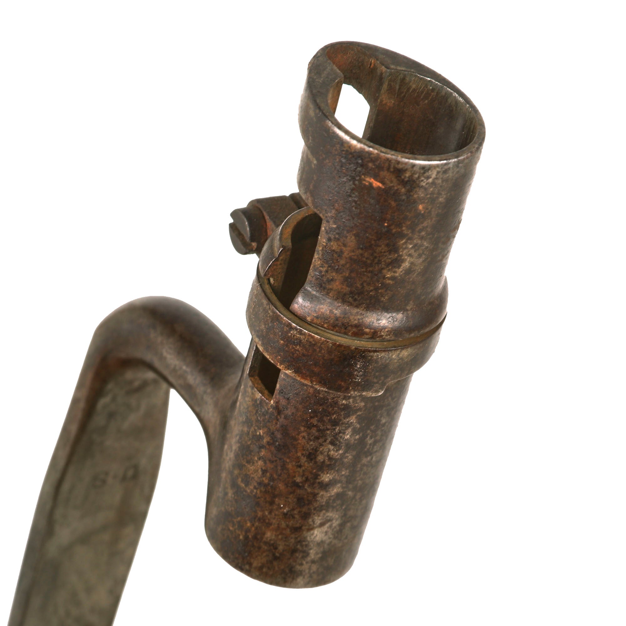 The included socket bayonet on this example is in very good shape, and fits great on the muzzle of the rifle, locking into place securely. It shows some past peppering and oxidation, and it shows a lovely mottled patina now. The U.S. stamp on the ricasso is still present, making this a really nice example.