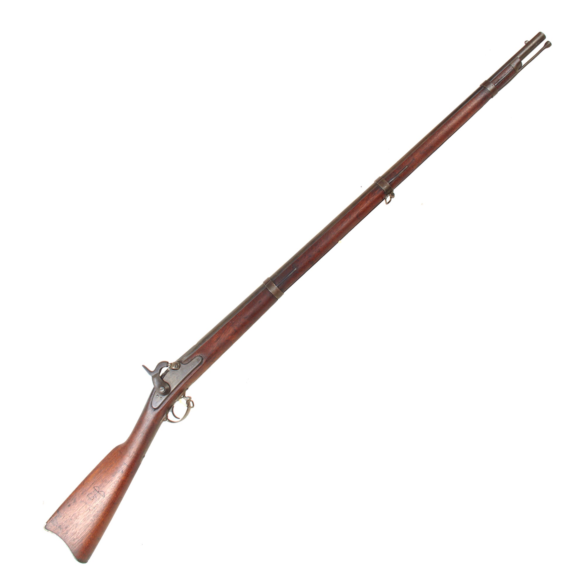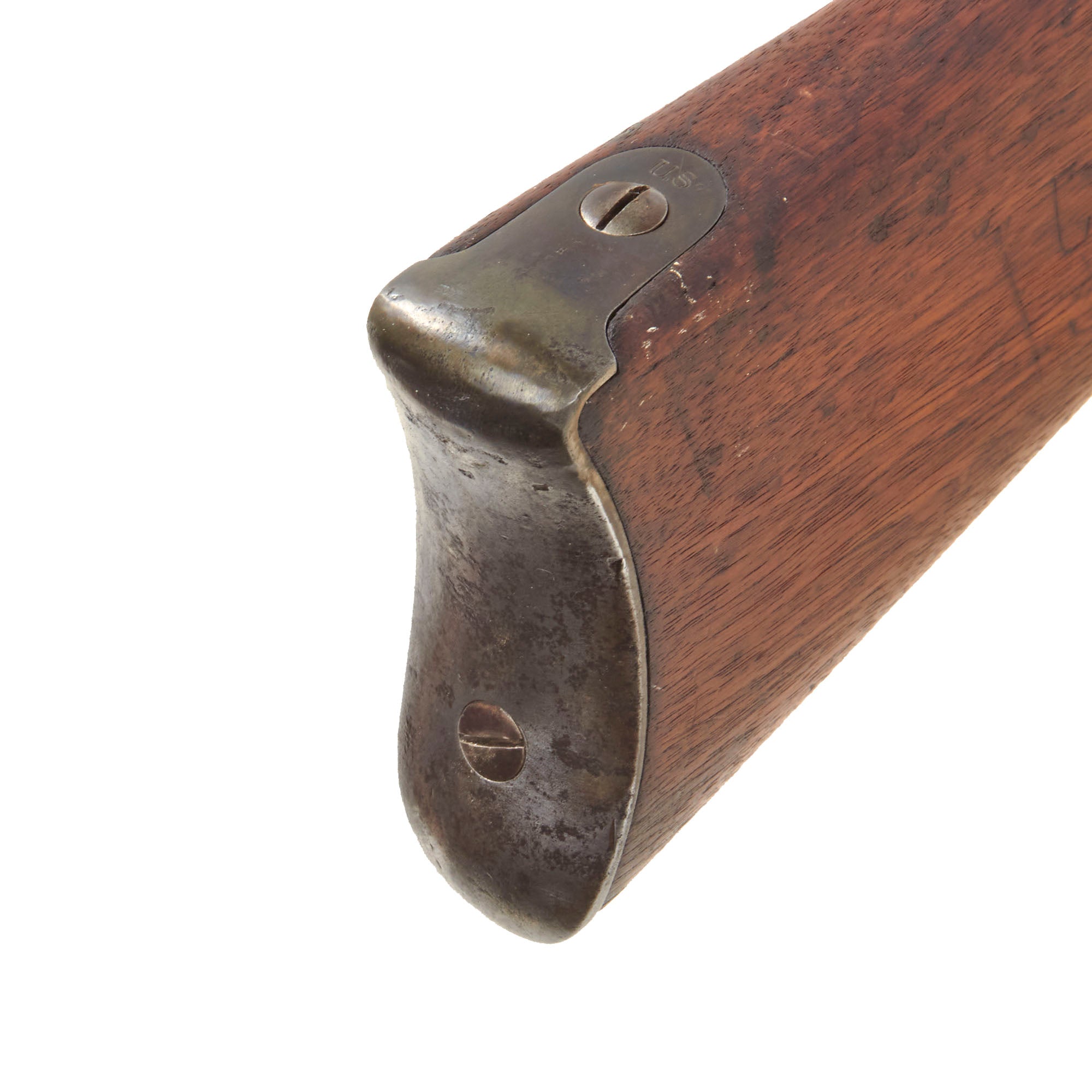 The lock functions correctly, holding at half cock and firing at full. There is definitely powder burn on and around the cap nipple cone, which is a bit misshapen, as is the bolster itself, which has lost some material due to cleaning. The cleanout screw on the bolster has a good slot, but we were not able to remove it. The rear sight is completely missing, with the dovetail and screw location still visible. All three barrel bands still have their U markings, with a U.S. on the butt plate tang. The bore is quite dirty, and most likely is now smoothbore due to wear and/or being drilled out.