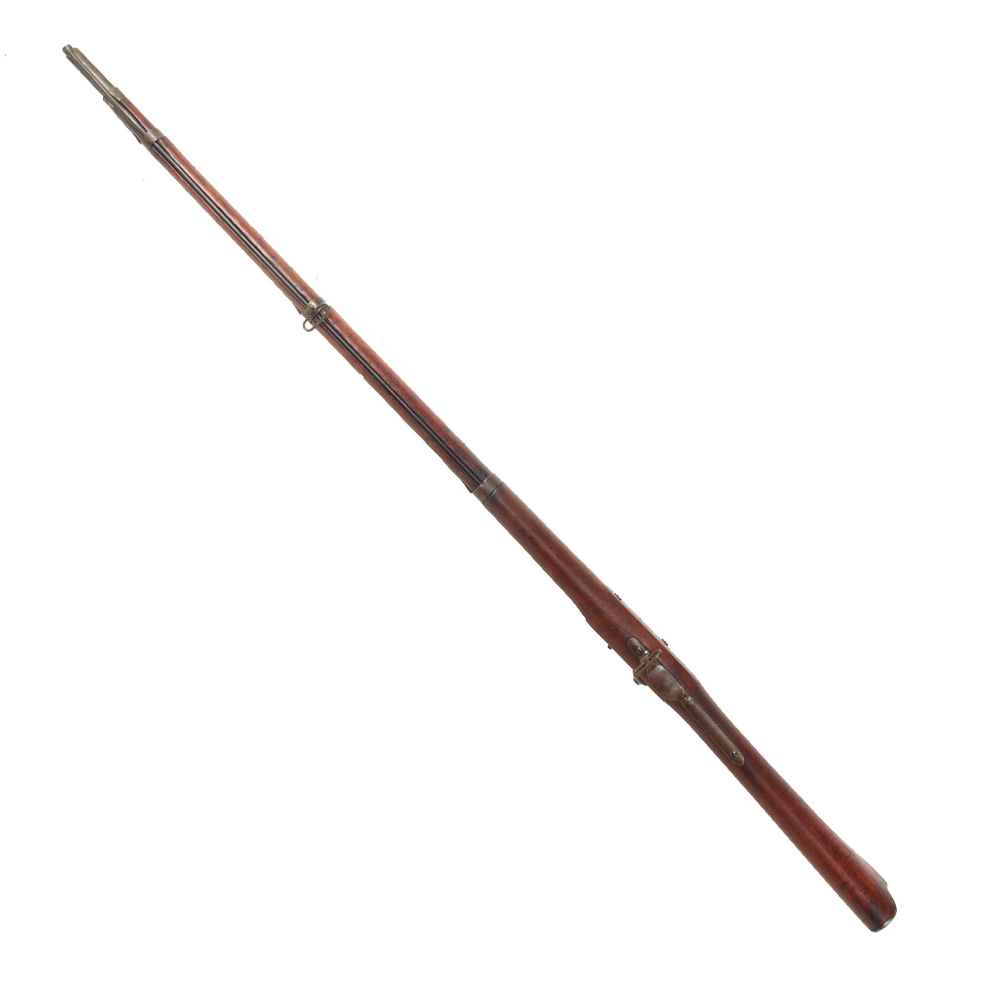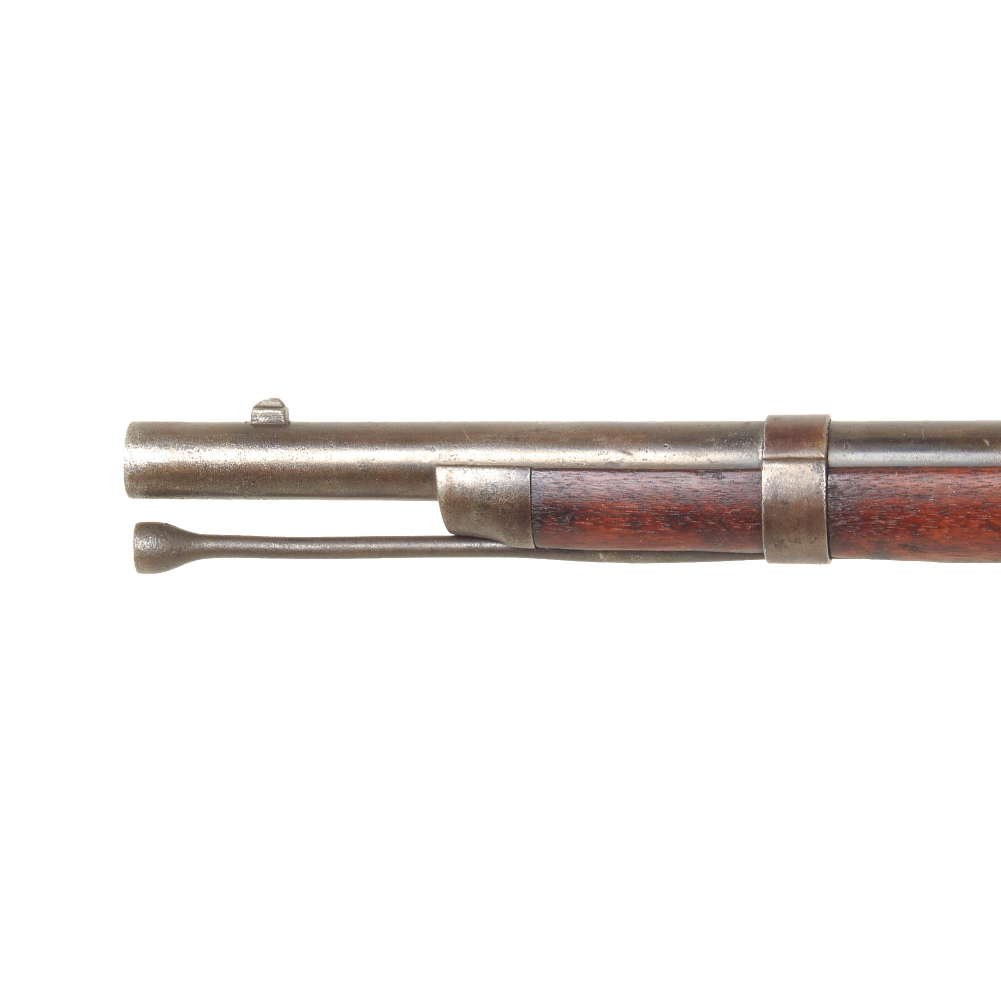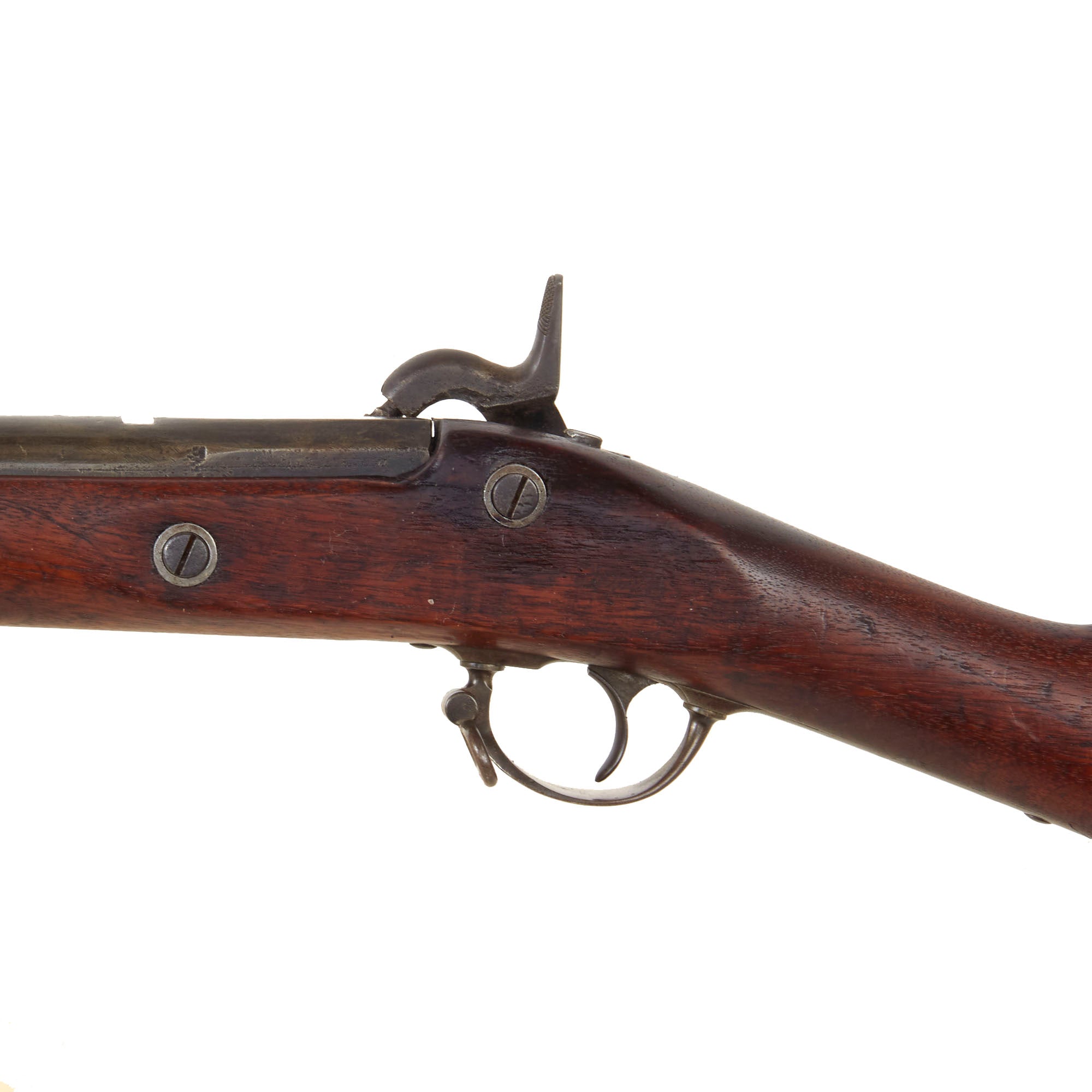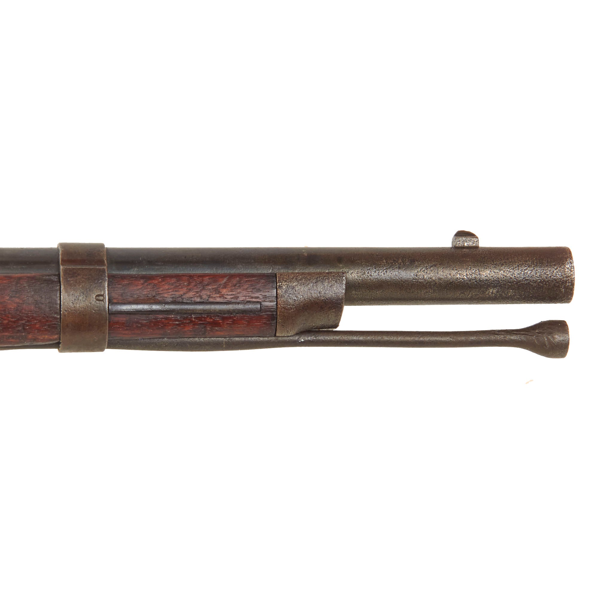 The walnut stock has a lovely worn look and color, and are the expected dents, chips, and wear from being in service for years. There is a crack running from the rear lock screw to the breech, a very common place to see these, and there also is a good amount of wood missing on the right behind the cap bolster due to powder erosion. The metalwork overall has a lovely oxidized brown patina, just like we love to see on these old service rifles. Both sling swivels are present and move easily, and the cleaning rod is present as well, with the correct enlarged shank, though the threads on the end are missing.