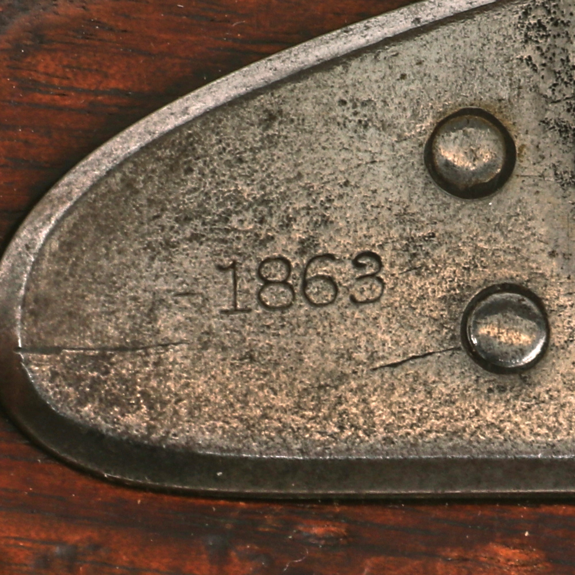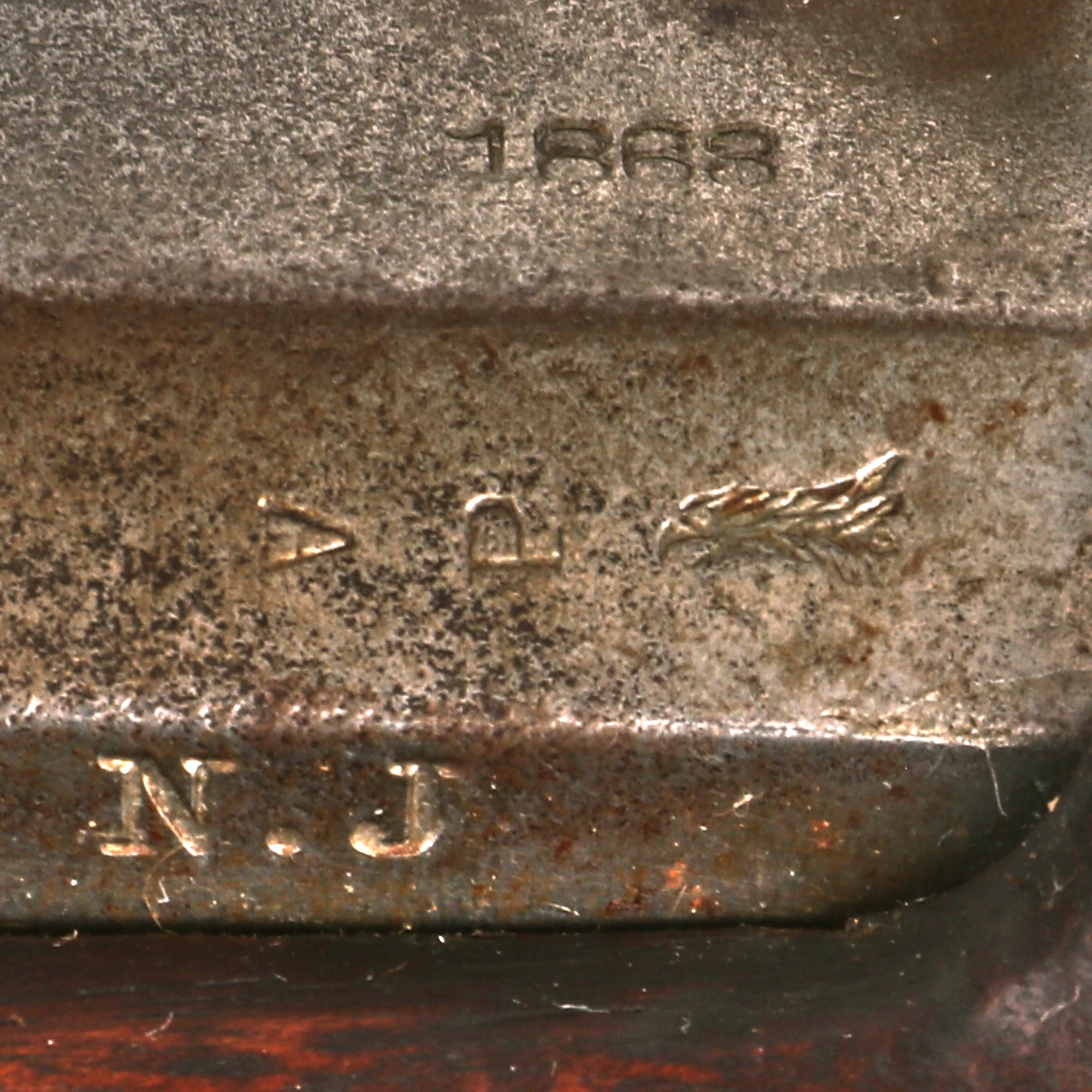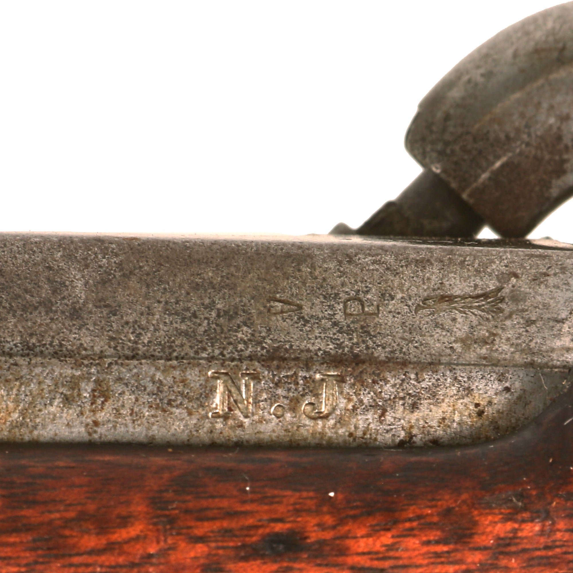 It is dated 1864 on the lock plate tail, and the markings on the lock are clear and overall the lock plate is in very good condition, especially considering the age, with just some light peppering. The barrel nocks form still shows the correct V / P / Eeagle's Head proof marks, and the top of the barrel still has a clearly legible 1863 date. There is also a N.J surcharge on the left side of the barrel, indicating it was processed for use by one of the New Jersey regiments during the war. The walnut stock has an additional N.J surcharge stamped on the left side, as is correct, though unfortunately any other inspection cartouches have been worn away.
