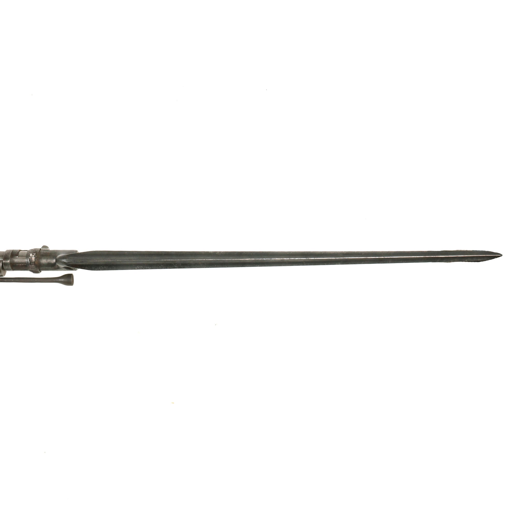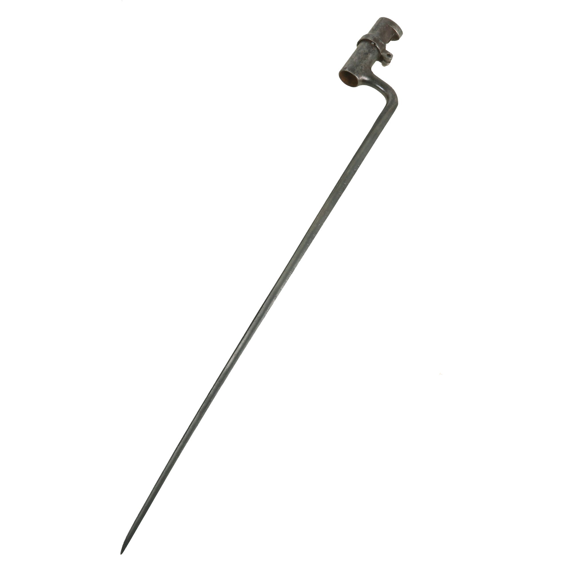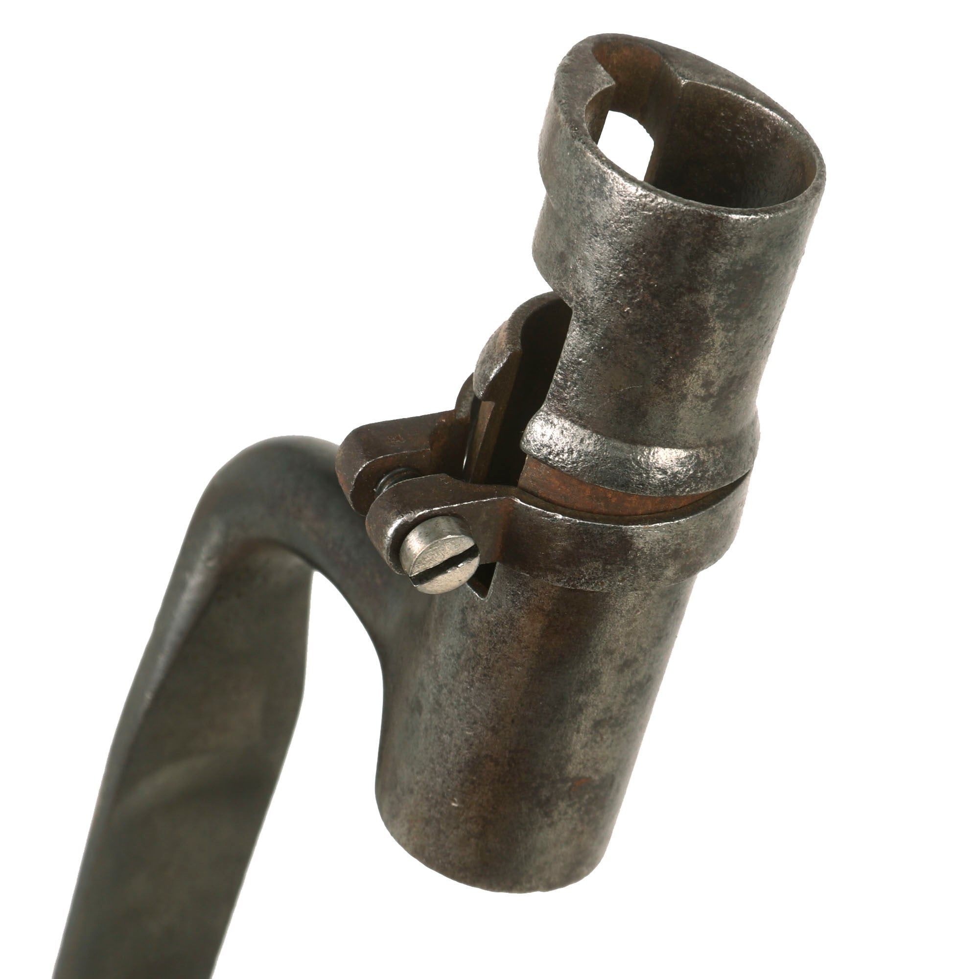 The included socket bayonet on this example is in very good shape, and fits great on the muzzle of the rifle, locking into place securely. It shows some past peppering and oxidation, but that was cleaned away, and now it shows a lovely dark gray patina. The U.S. stamp on the ricasso is still present, making this a really nice example.