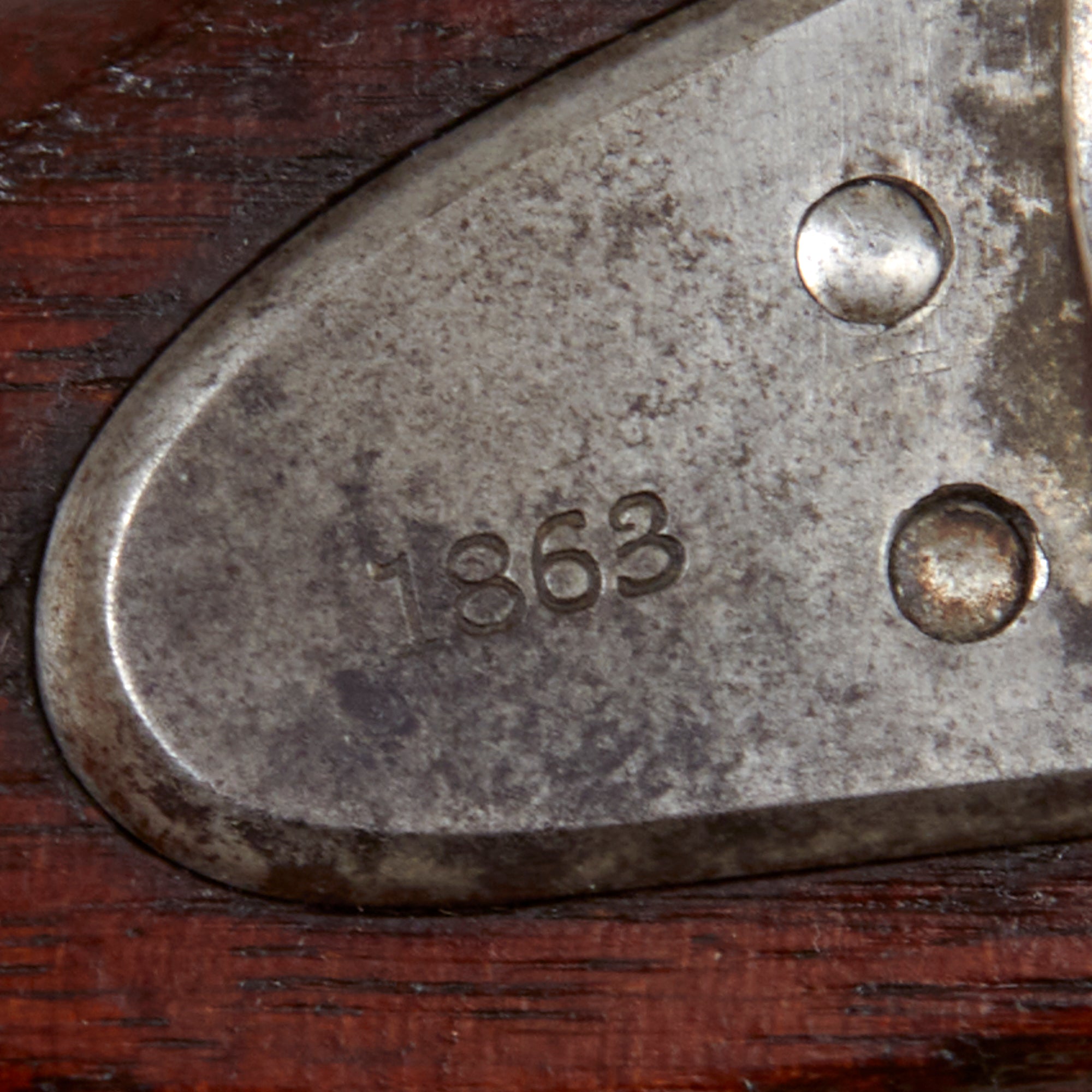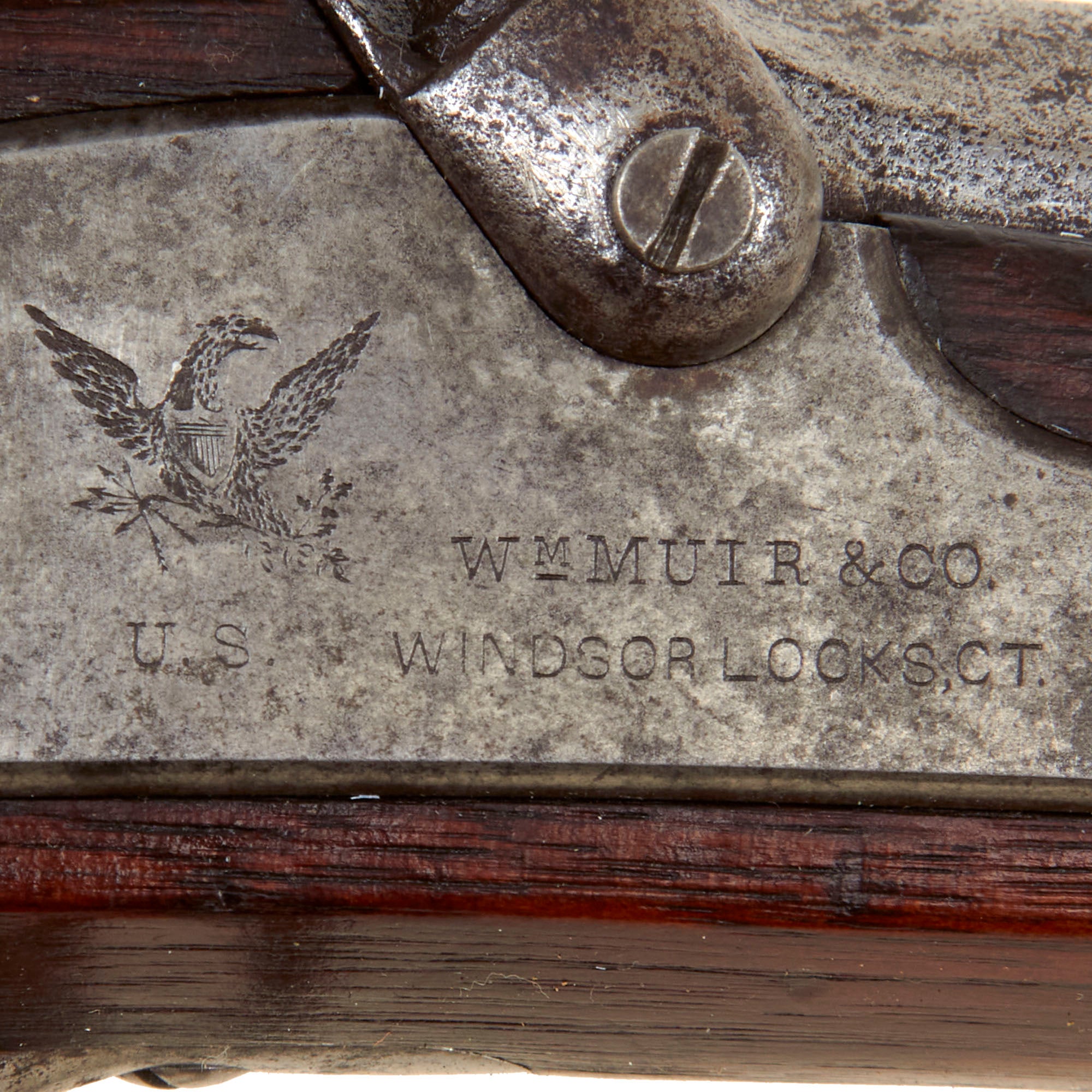 This example however was not converted, and is still in the original configuration. It is dated 1863 on the lock plate tail, and also has an Eagle stamped into the lock over U.S.. Under the percussion cap bolster the manufacturer name is stamped: WM MUIR & CO. / WINDSOR LOCKS. CT.. The markings on the lock are clear and overall the lock plate is in very good condition, especially considering the age. The barrel nocks form bears the standard proof marks of V / P / Eagle's Head, and there is also a date of 1863 on the top, which is a bit worn due to powder burn.