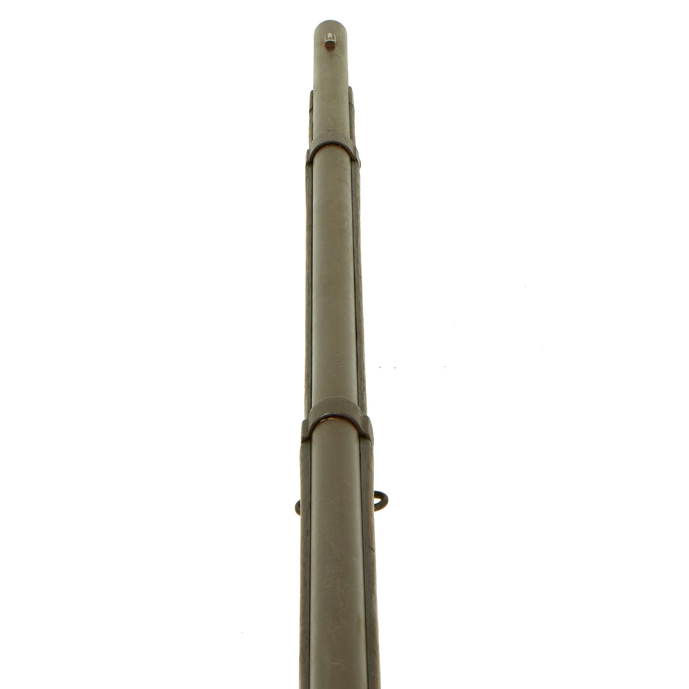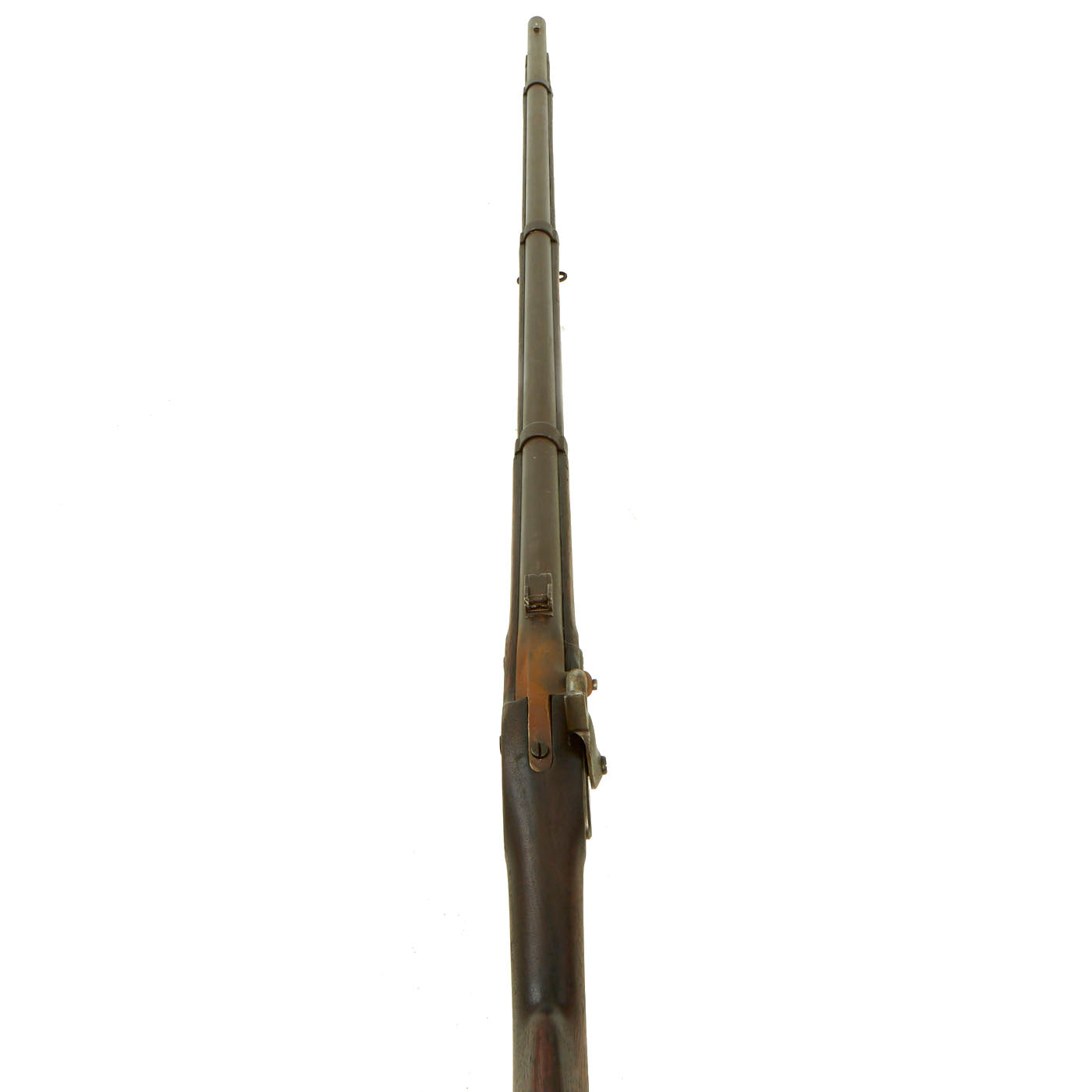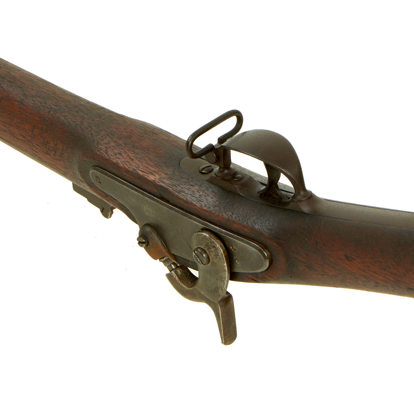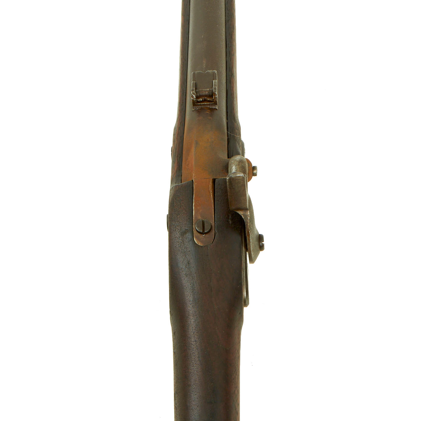 The rear sight is present, though one of the leaves is broken off, and only the longest leaf can be raised into position. The upper and lower bands still have their U markings, with a U.S. on the butt plate tang. The ramrod is the correct and original tulip type with an enlarged shank. Both sling swivels are still present.