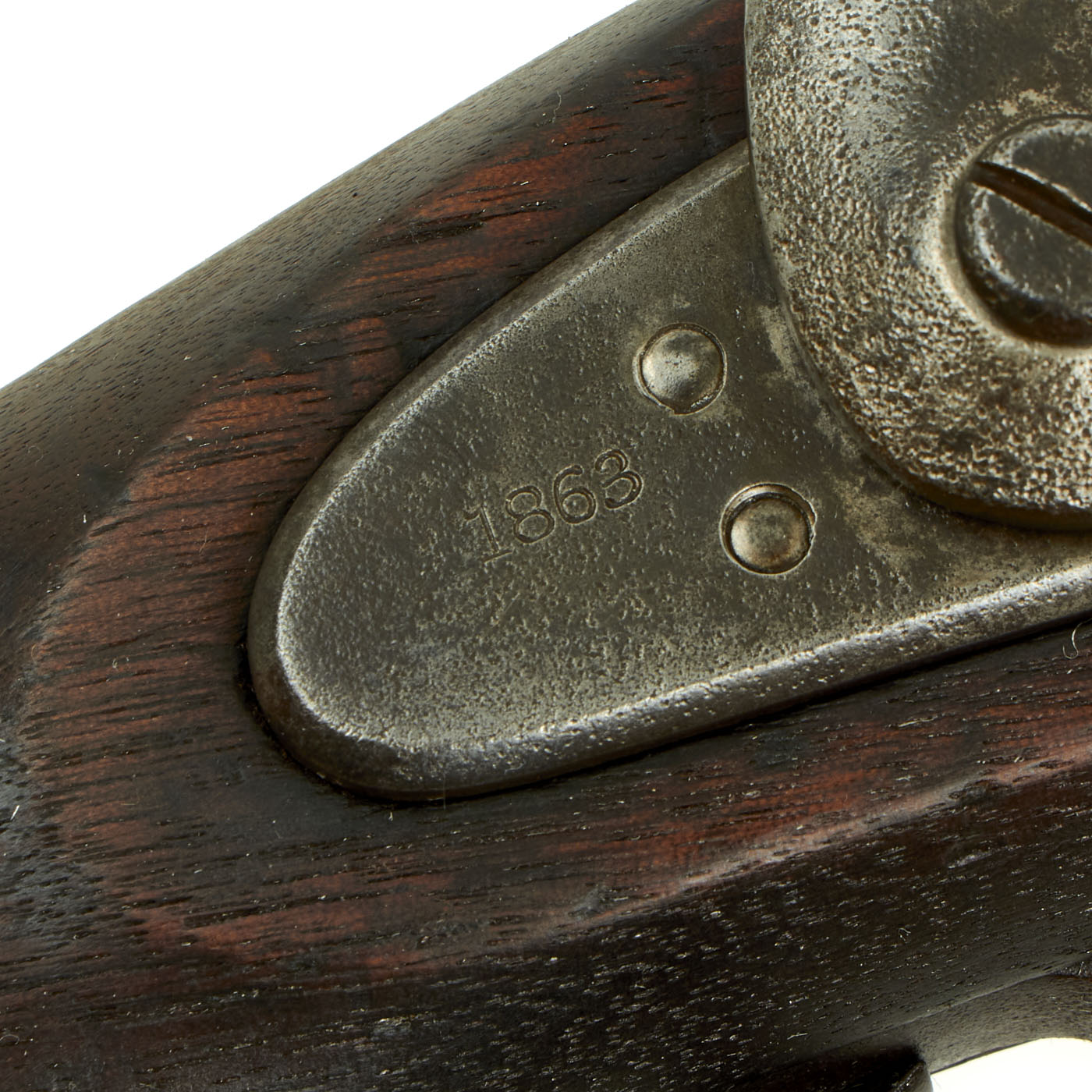 This patinated example however was not converted, and is still in the original configuration. It looks to have been put away after the Civil war, and was only recently discovered and brought into the light. Aside from some light cleaning and a wipe down, we have left it as found, preserving the fantastic patina of age. It is dated 1863 on the lock plate tail, and also has an Eagle stamped into the lock over U.S., and to the right of that PARKERS ' SNOW & CO. / MERIDEN, CONN. The markings on the lock plate are somewhat faint due to past rust peppering. Information regarding these rifles indicate that 1863 dated locks were part of a James Mulholland contract for 5,502. The nocks form has traces of the proof marks V / P / Eagle's Head, but they are quite faint due to powder burn and cleaning.