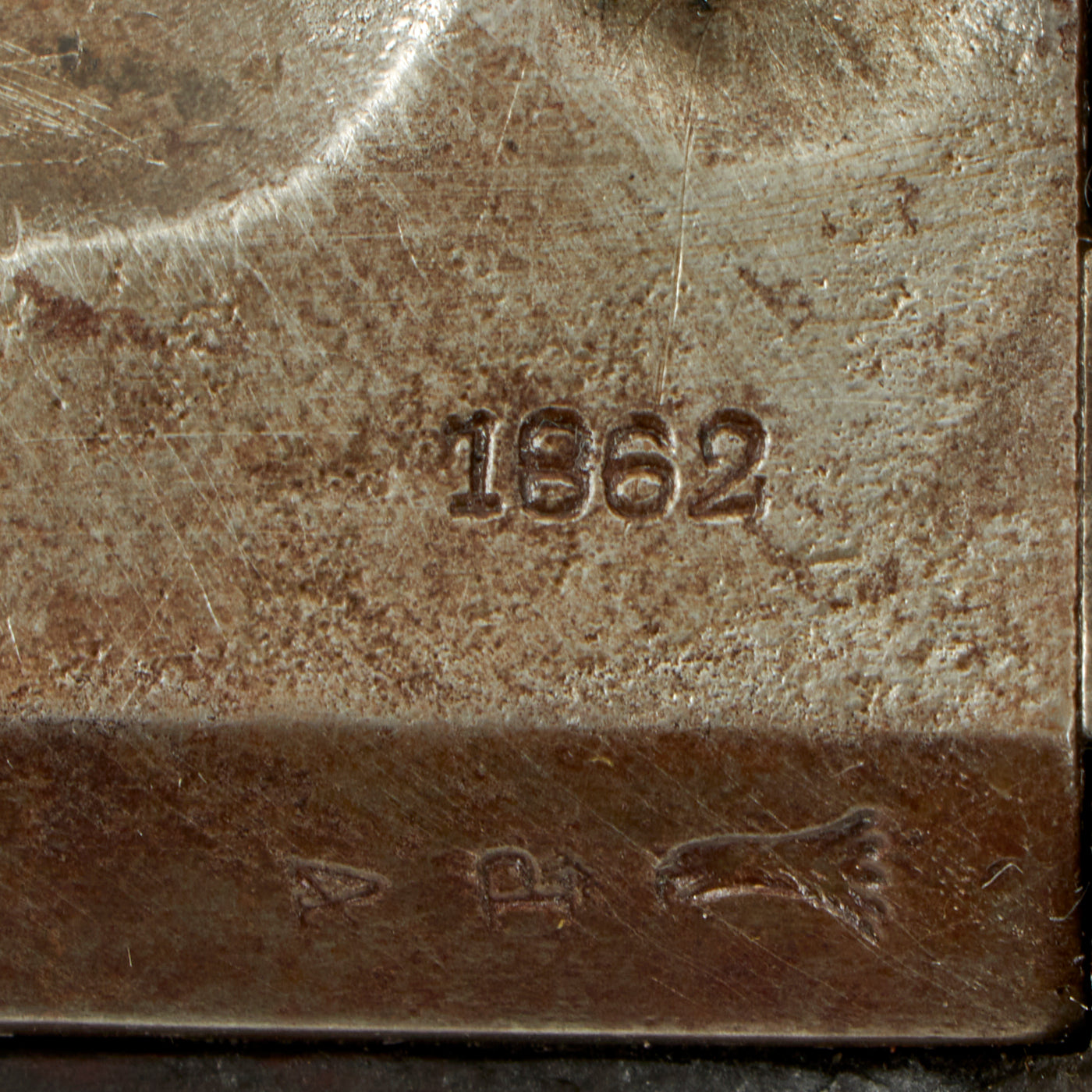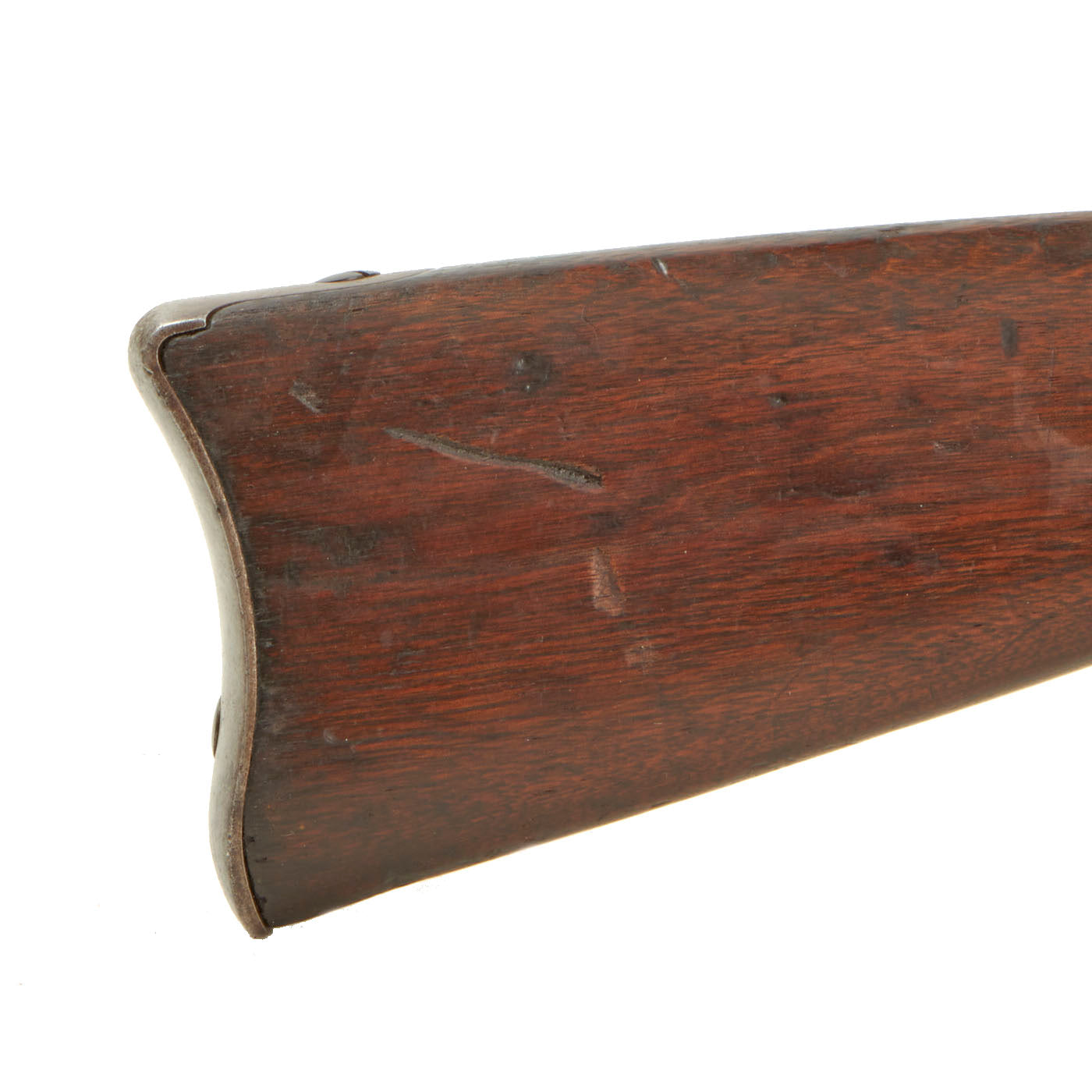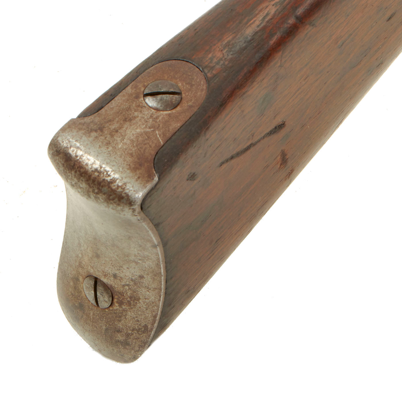 The walnut stock has a lovely worn look and color, and still has traces of the original inspection cartouches on the left side near the lock screws. There are the expected dents, chips, and wear from being in service for years. The metalwork overall has a lightly oxidized patina, which we have left intact to preserve the history of the rifled musket. There is not any major rust or other issues, just wear and patination from over 150 years of age.