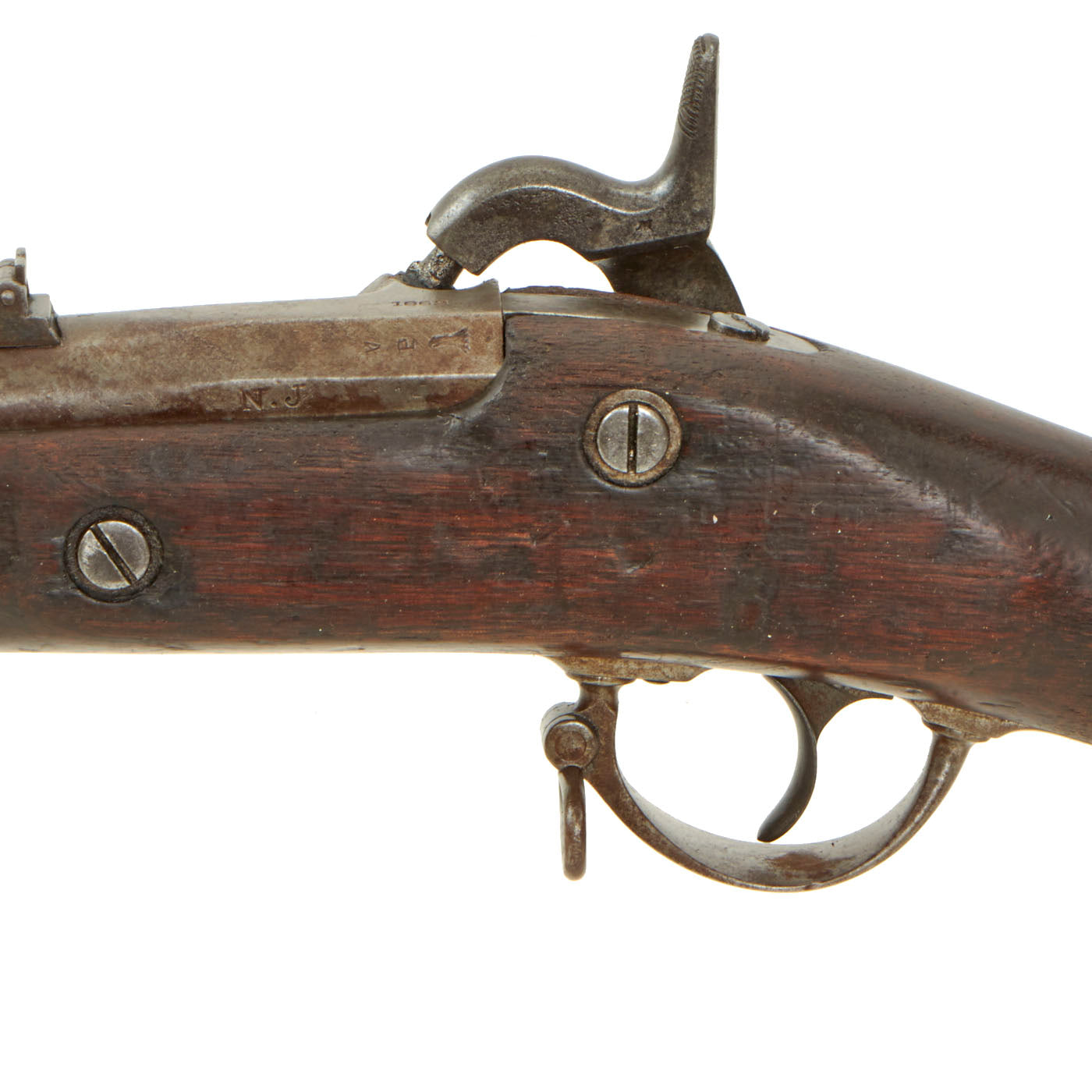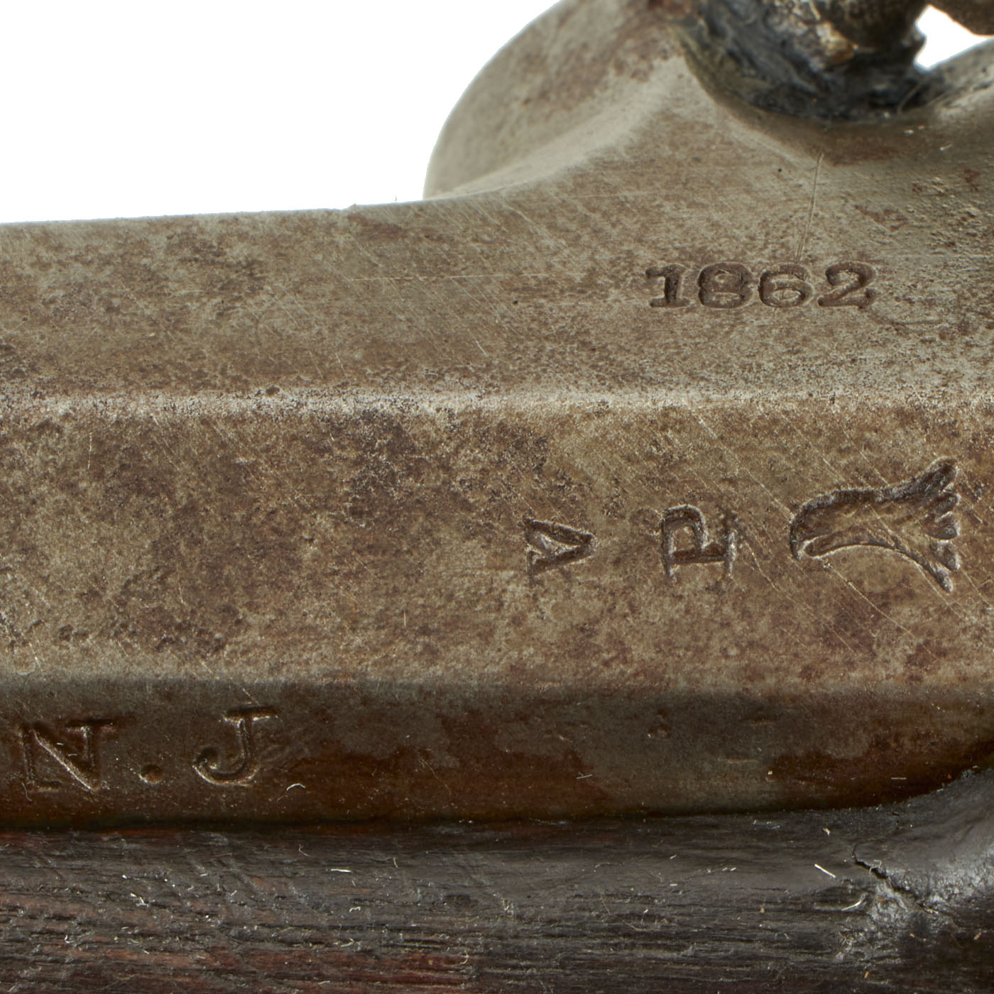 This example however was not converted, and is still in the original configuration. It is dated 1864 on the lock plate tail, and also has an Eagle stamped into the lock in the middle of U. S., which is over PROVIDENCE TOOL CO. / PROVIDENCE R.I.. The markings on the lock are clear and overall the lock plate is in very good condition, especially considering the age. The barrel nocks form bears the standard proof marks of V / P / Eagle's Head, with an 1862 date on the top. We do not see any signs of the barrel having been replaced, so most likely it was on hand from previous production. There is also an N.J. surcharge on the left side of the barrel, indicating issue to New Jersey. Really some great markings on this rifled musket!