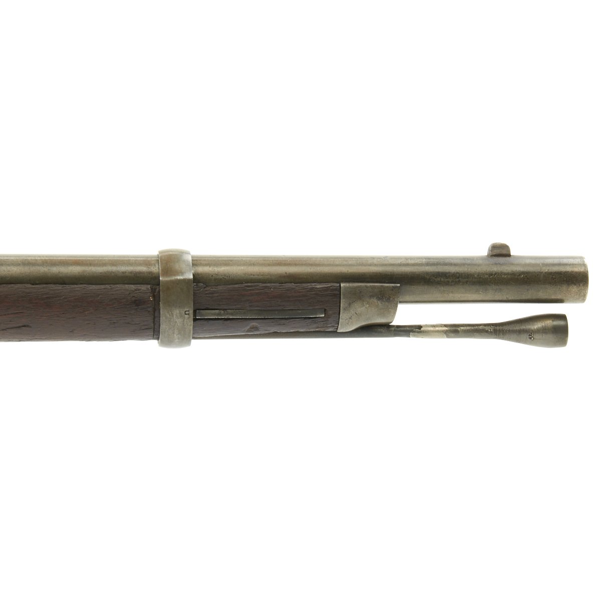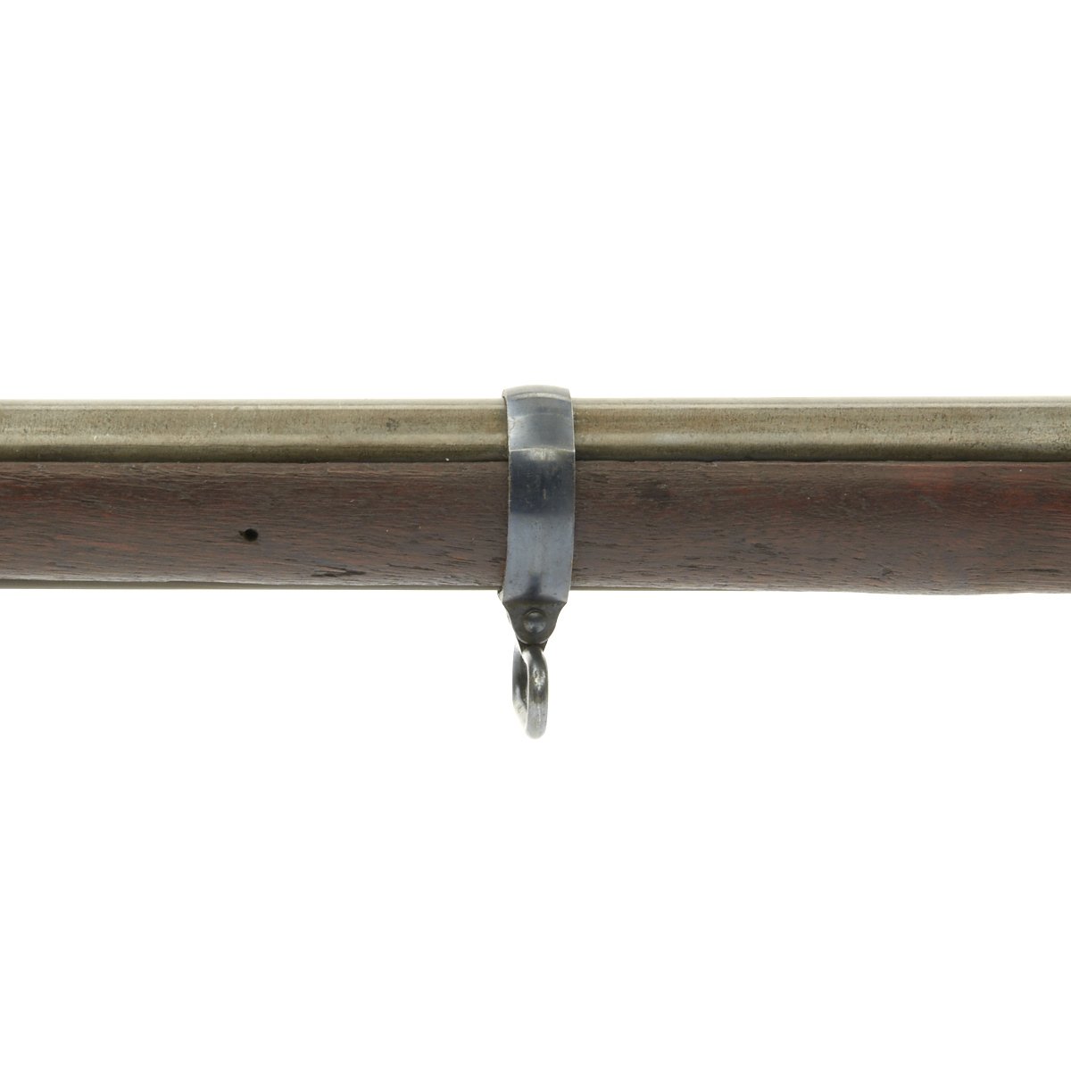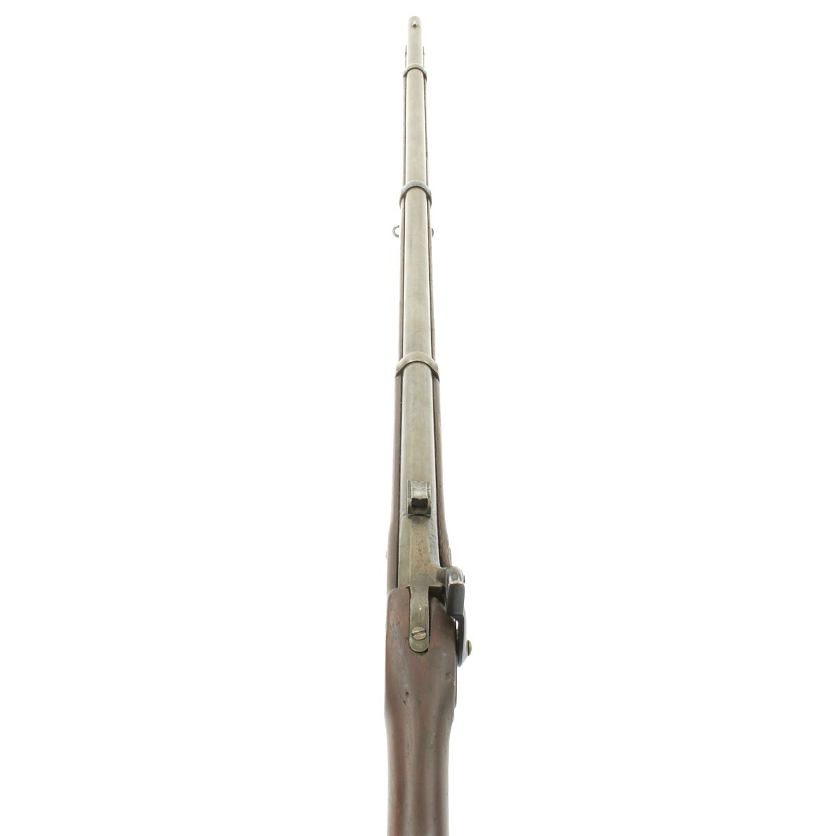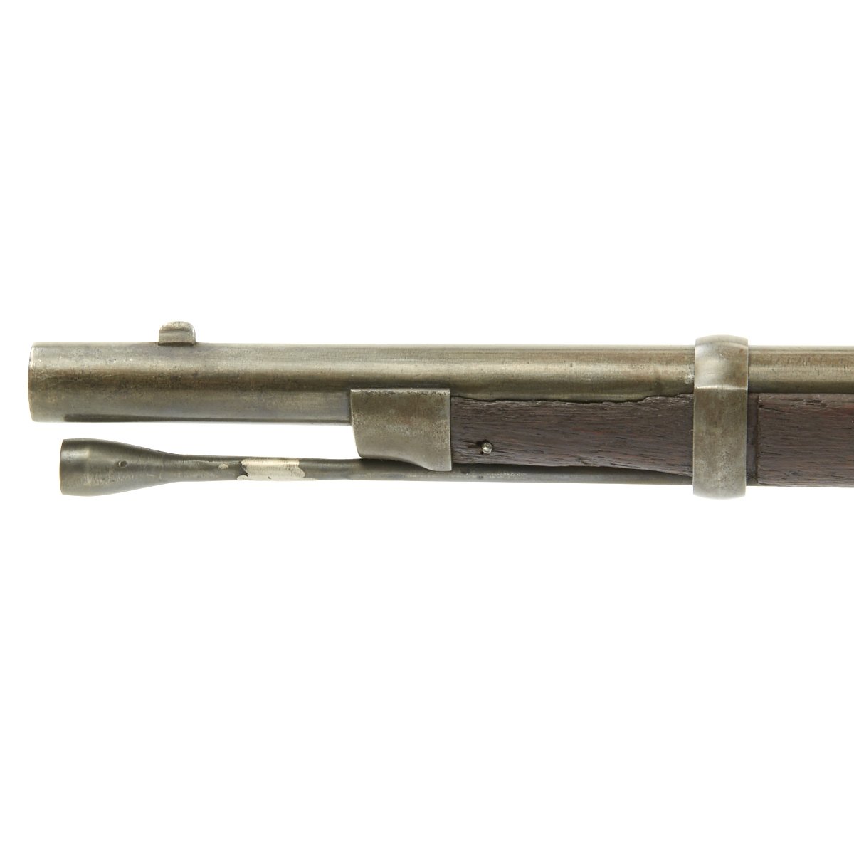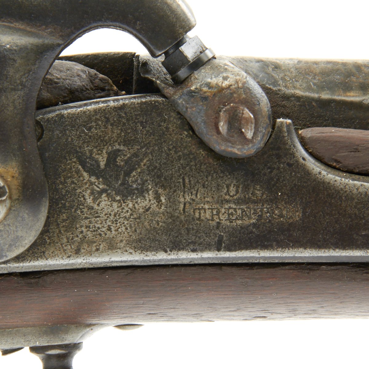 The metalwork overall shows peppering from past pitting, but it has been fully cleaned and restored go put it in its best light. The cap nipple has been replaced, and there is a significant amount of powder burn around the breech area. The lock functions correctly, though it does not hold half-cock if the trigger is pulled very forcefully. This gun has an earlier pattern two leaf rear sight, and all three barrel bands still have their U markings, with a U.S. on the butt plate tang. The ramrod is the correct and original tulip type with an enlarged shank.