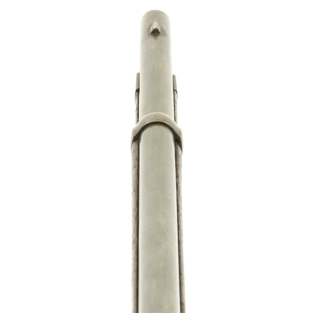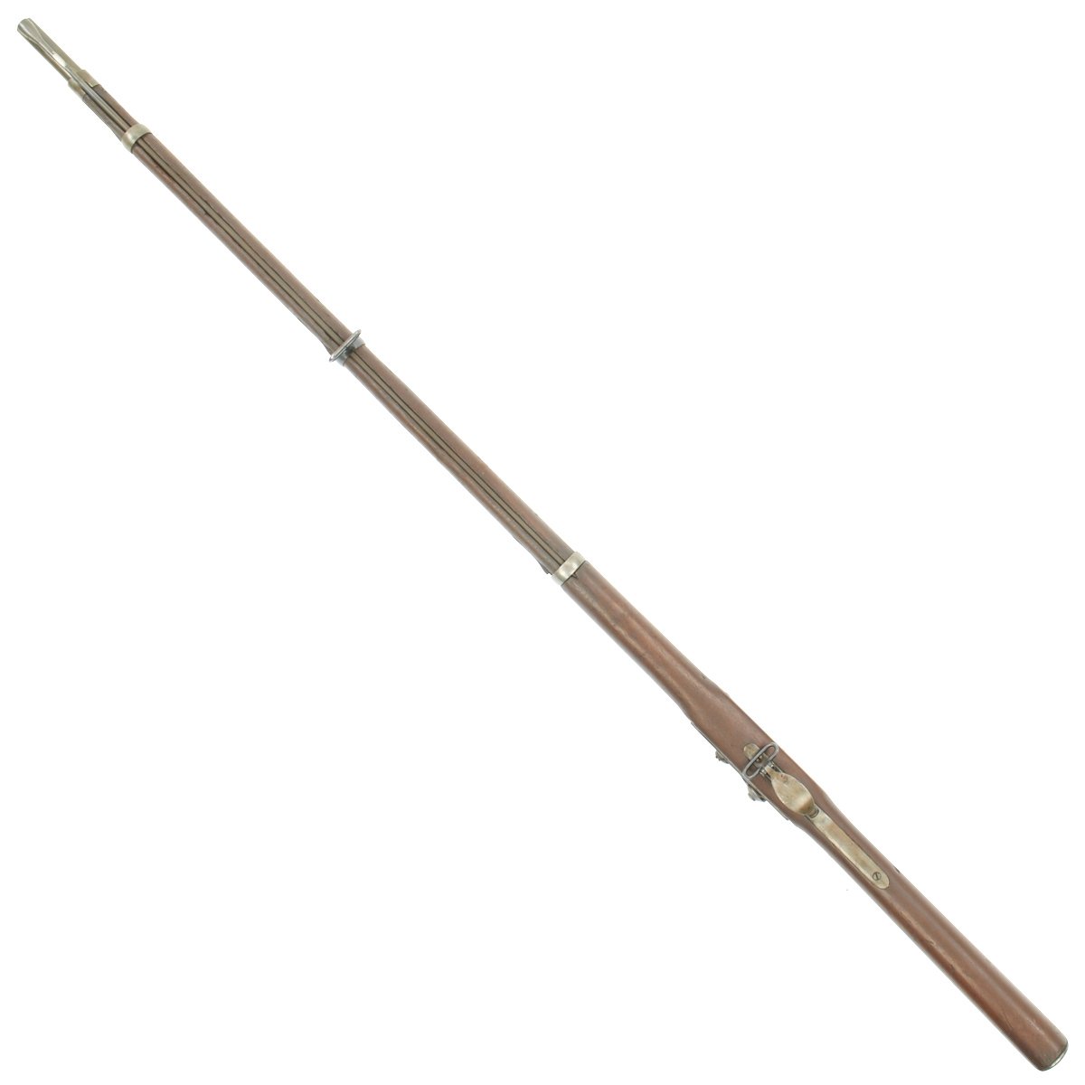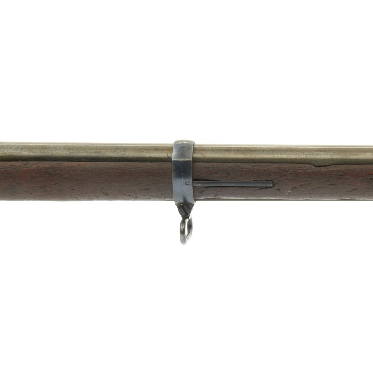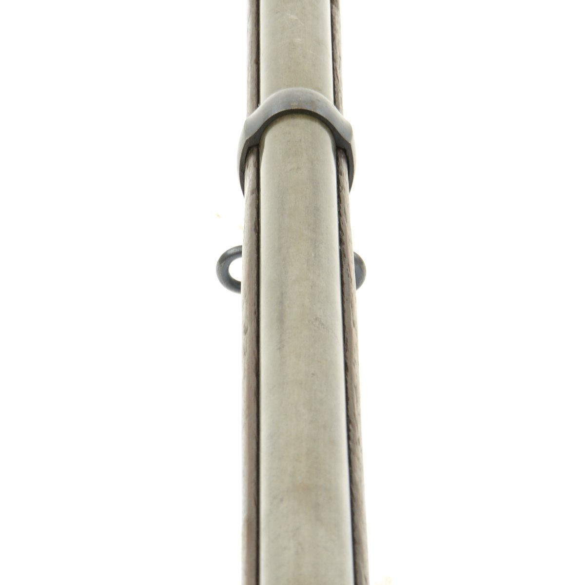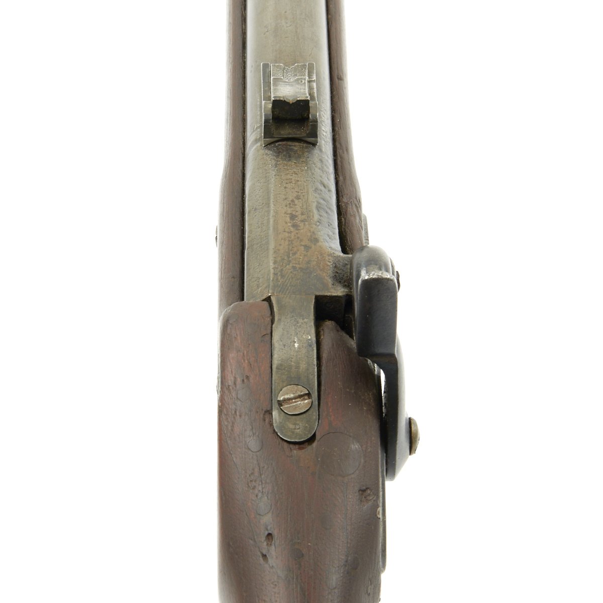 The metalwork overall shows peppering from past pitting, but it has been fully cleaned and restored go put it in its best light. The cap nipple has been replaced, and there is a significant amount of powder burn around the breech area. The lock functions correctly, though it does not hold half-cock if the trigger is pulled very forcefully. This gun has an earlier pattern two leaf rear sight, and all three barrel bands still have their U markings, with a U.S. on the butt plate tang. The ramrod is the correct and original tulip type with an enlarged shank.