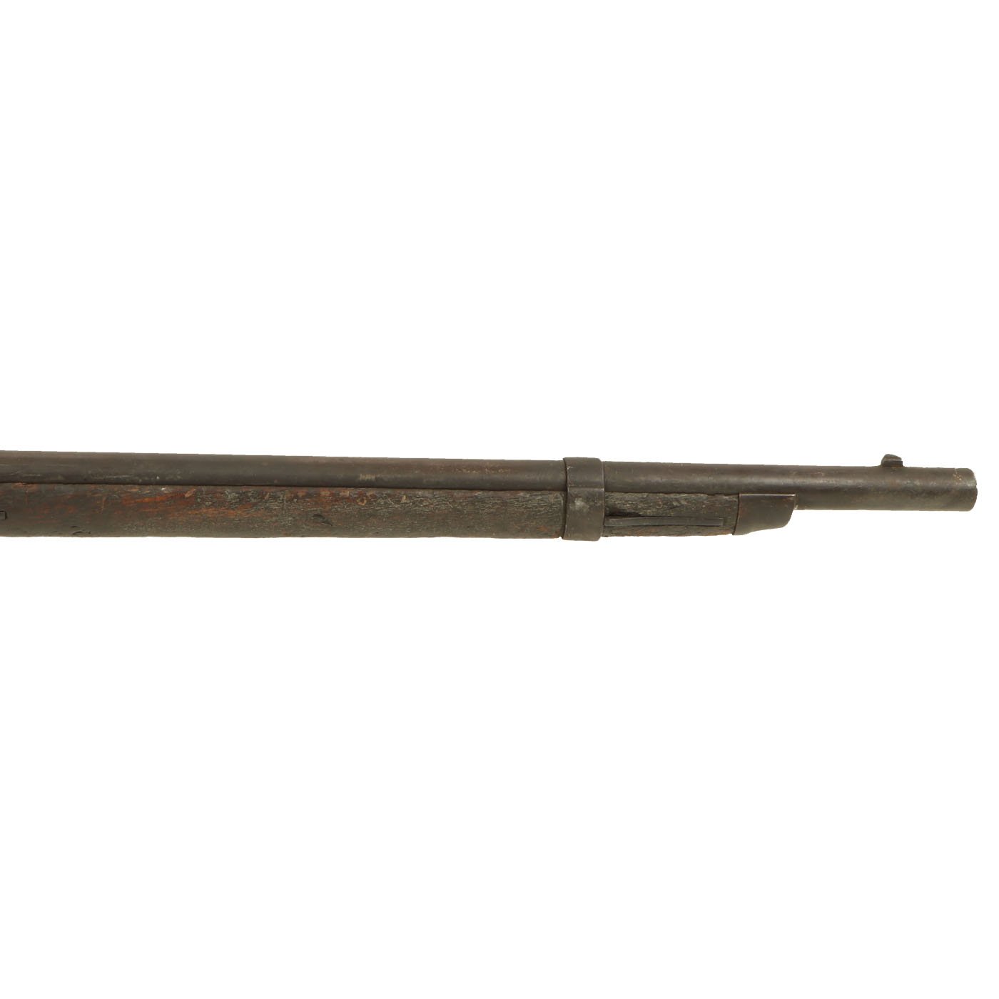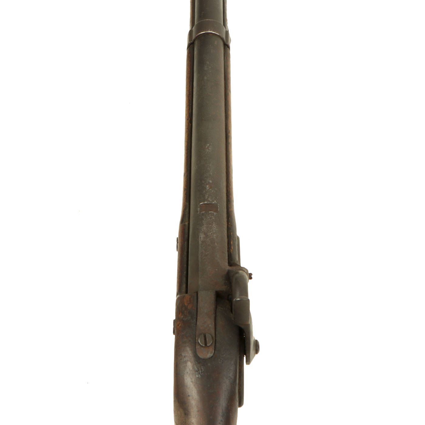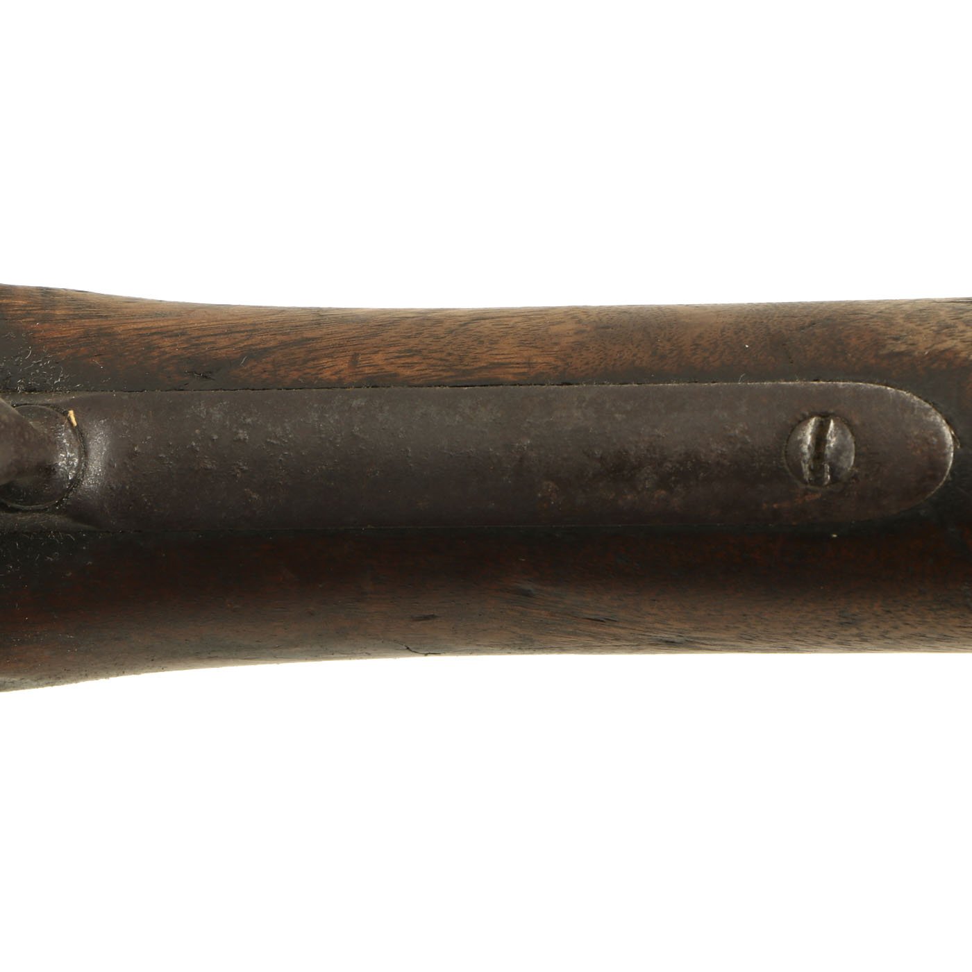 This example however was not converted, and is still in the original configuration. It is dated 1862 on the lock plate tail, and also has an Eagle stamped into the lock next to U.S. / SPRINGFIELD, indicating production at Springfield Armory, in Springfield Massachusetts. The markings on the lock are mostly clear and overall the lock plate is in good condition, with a polished peppered appearance. The cleanout on the cap bolster identifies this as a Model 1861, and not the later model 1863.