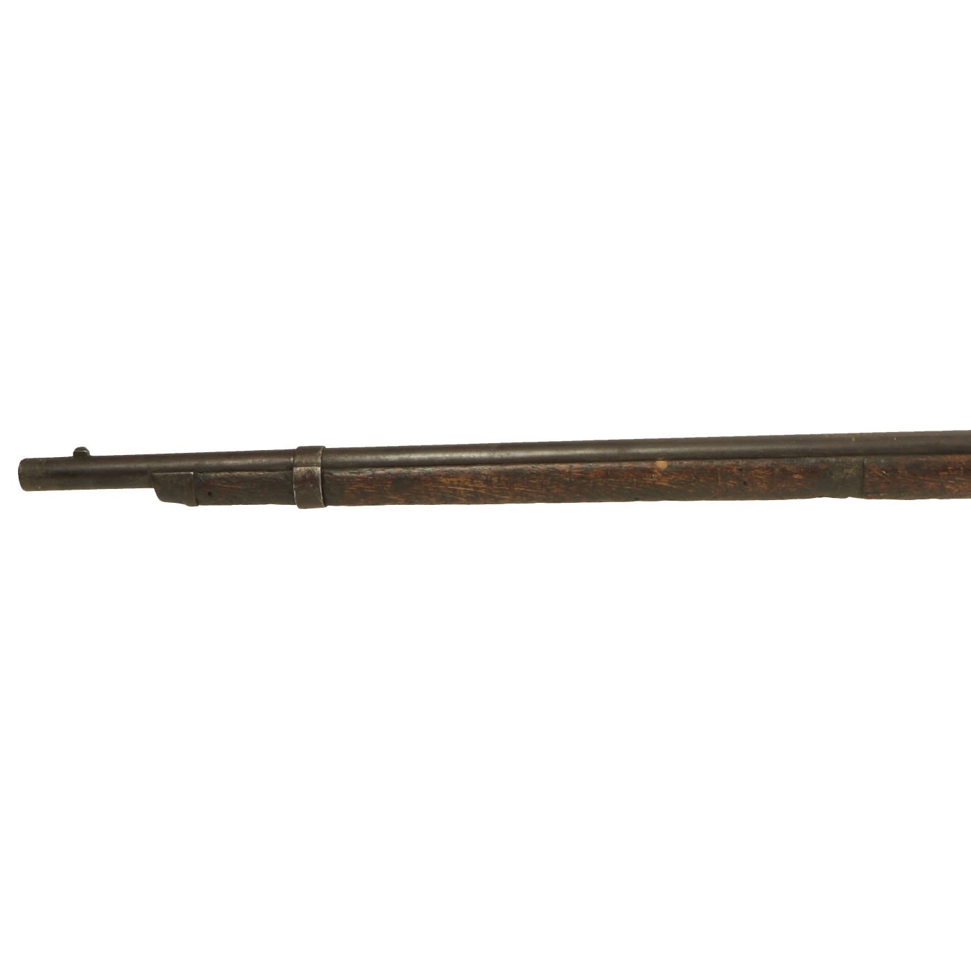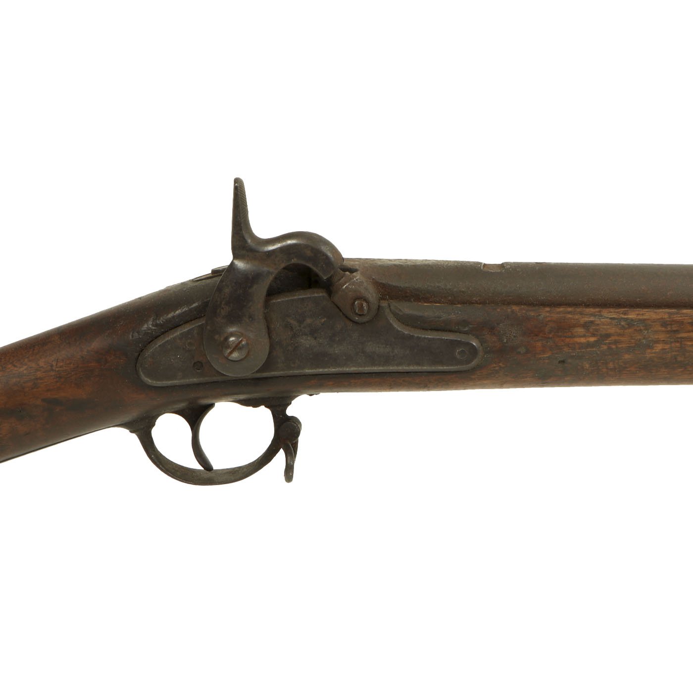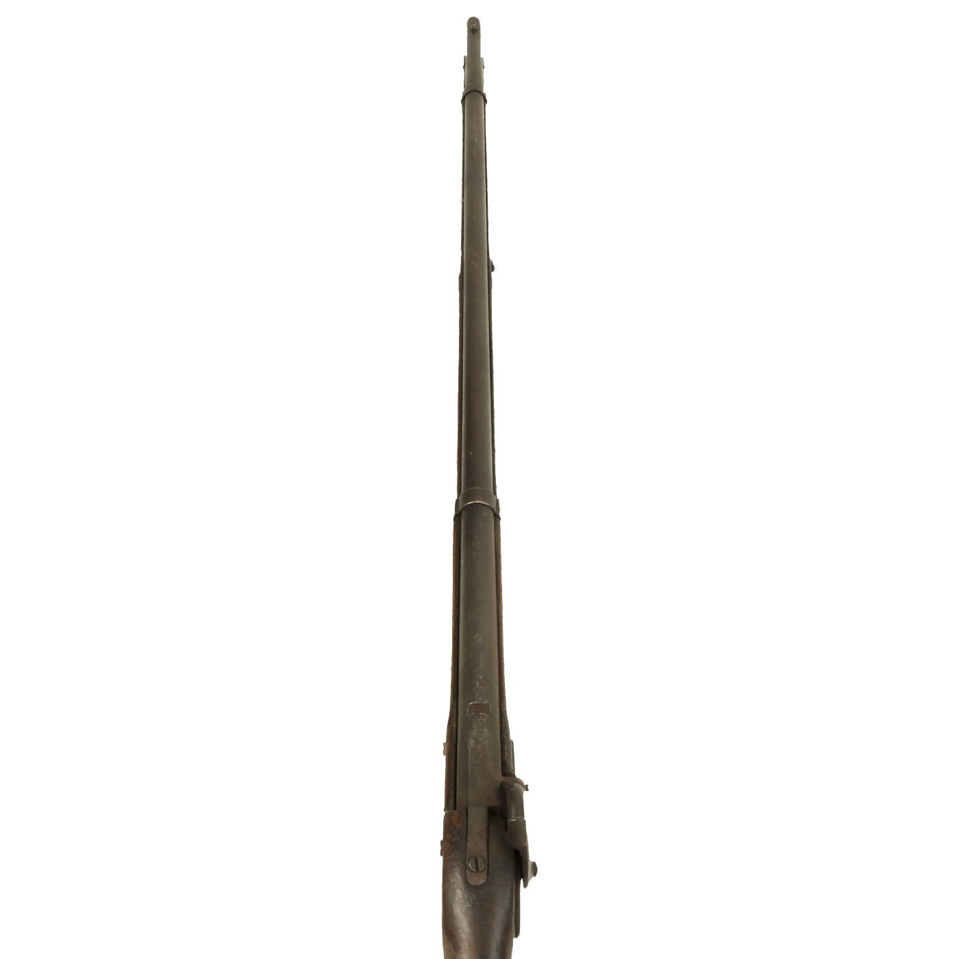 This example however was not converted, and is still in the original configuration. It is dated 1862 on the lock plate tail, and also has an Eagle stamped into the lock next to U.S. / SPRINGFIELD, indicating production at Springfield Armory, in Springfield Massachusetts. The markings on the lock are mostly clear and overall the lock plate is in good condition, with a polished peppered appearance. The cleanout on the cap bolster identifies this as a Model 1861, and not the later model 1863.