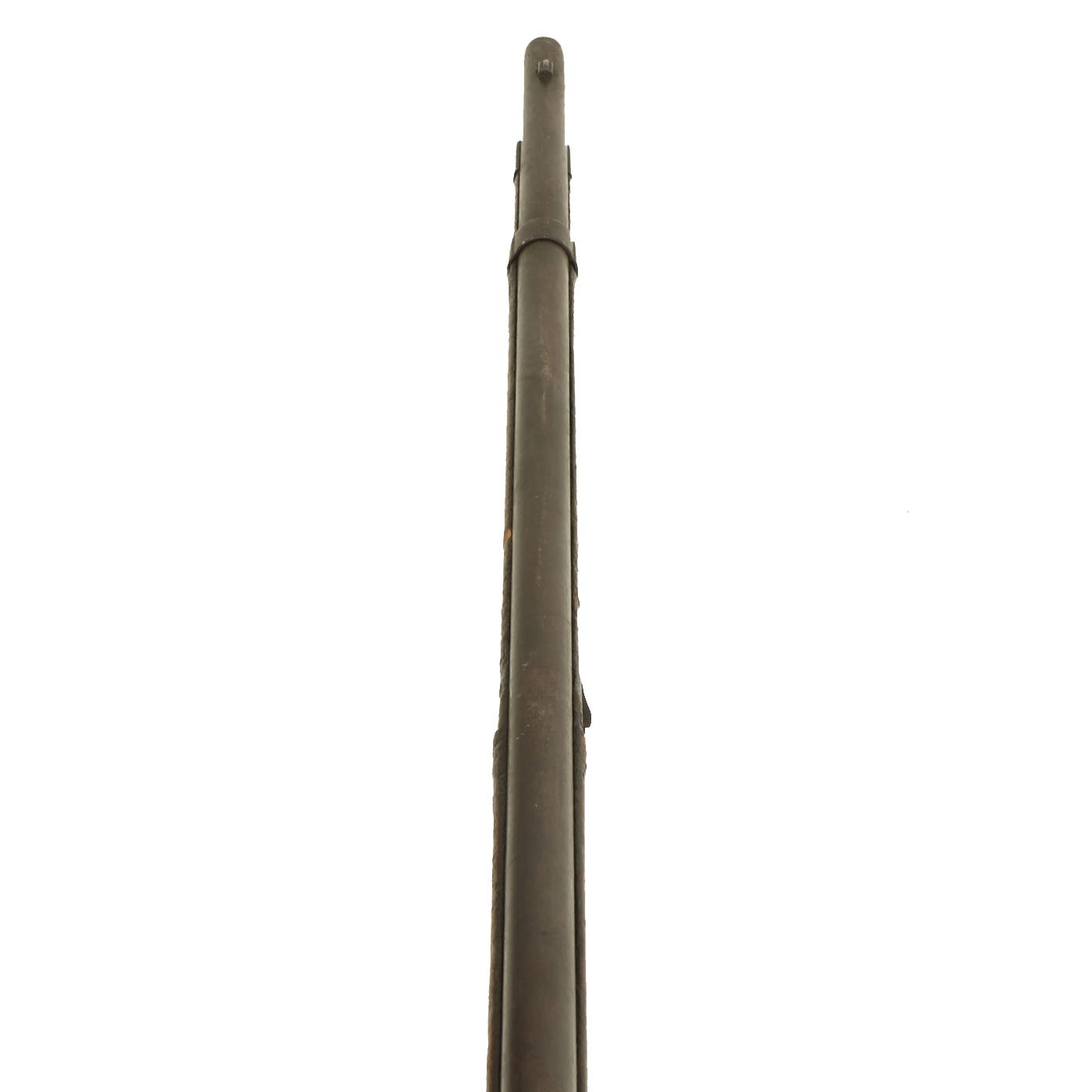 Condition of the rifle is as shown, and it definitely has the look of a gun that was stored in a barn or shed for quite some time. The middle barrel band with sling swivel is missing, as is the rear sight. The metalwork is oxidized, and has a brown patina on it now. There is significant past powder burn around the cap bolster, and even the wood has degraded due to the corrosive powder. It also looks like some parts of the stock such as the butt stock have been exposed to water or heat, as the oil finish normally present is gone, leaving dry wood.