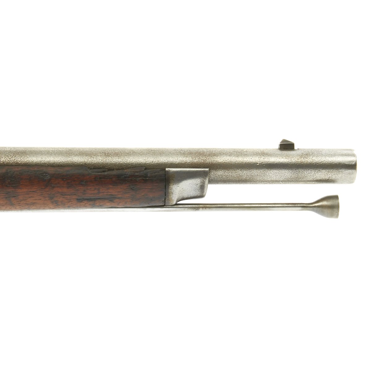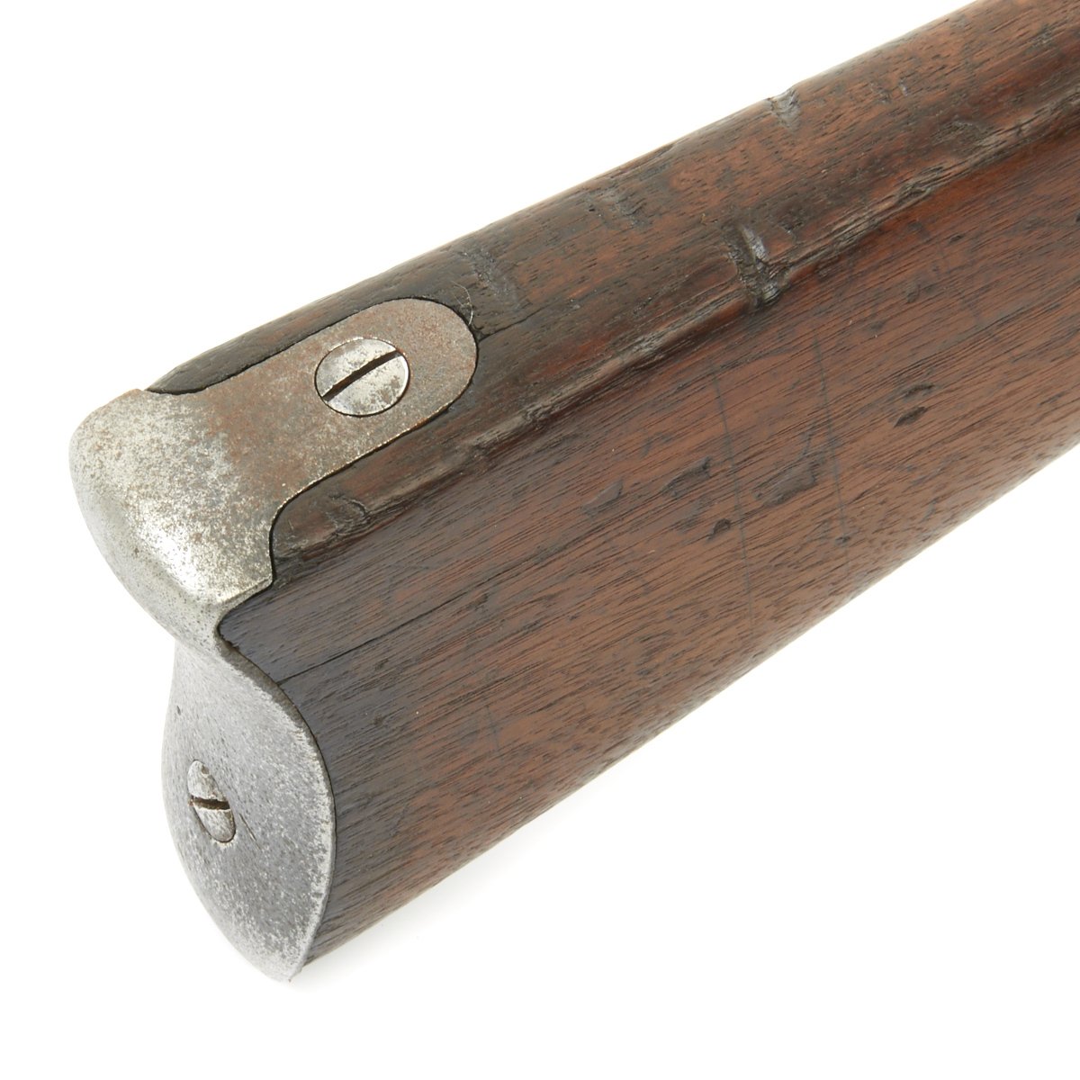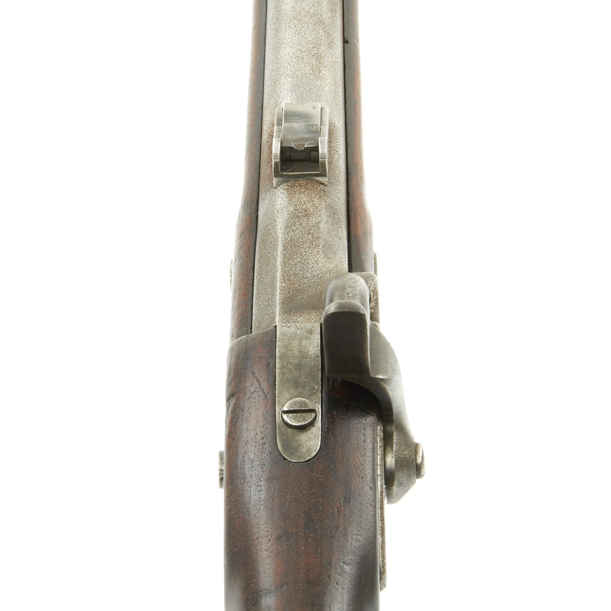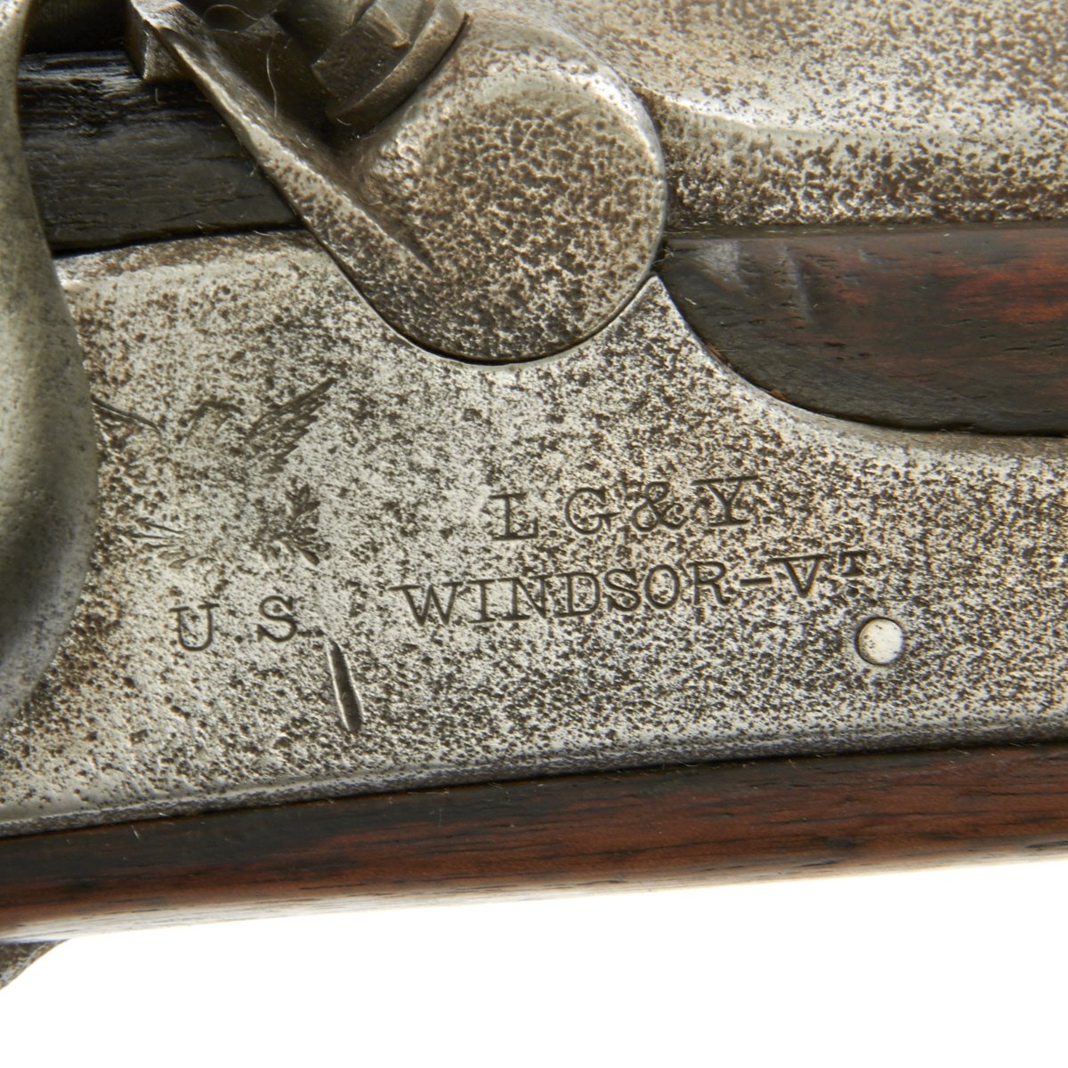 This example however was not converted, and is still in the original configuration, though it has been shortened by 8 inches. We do not know whether it was originally made this way, or shortened post war. It is dated 1862 on the lock plate tail, and also has an Eagle stamped into the lock in the middle of U.S., which is next to L.G. & Y. / WINDSOR - Vt.. The markings on the lock are mostly clear and overall the lock plate is in good condition, with light peppering. There are also some faint proof markgs on the barrel breech, though they cannot be read.