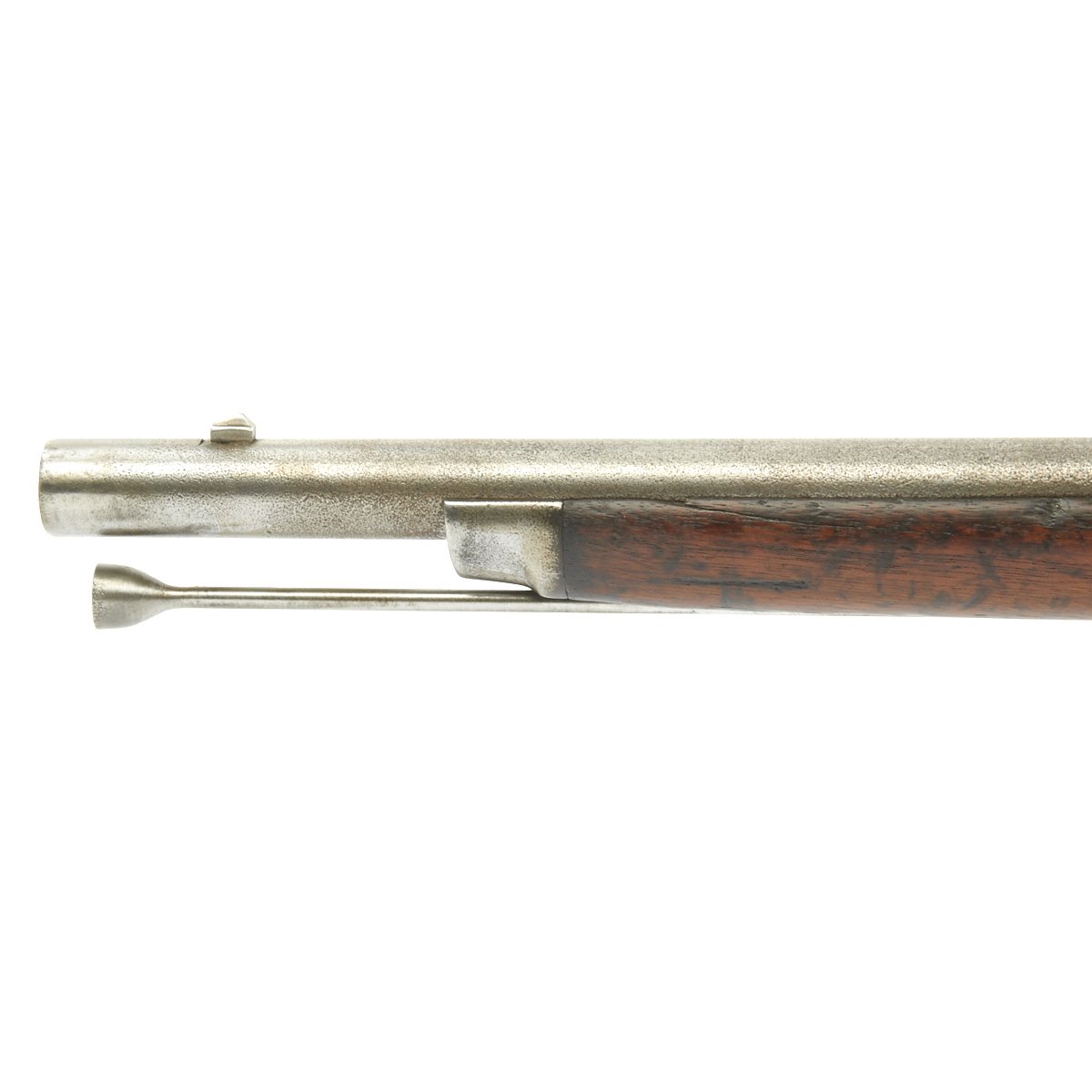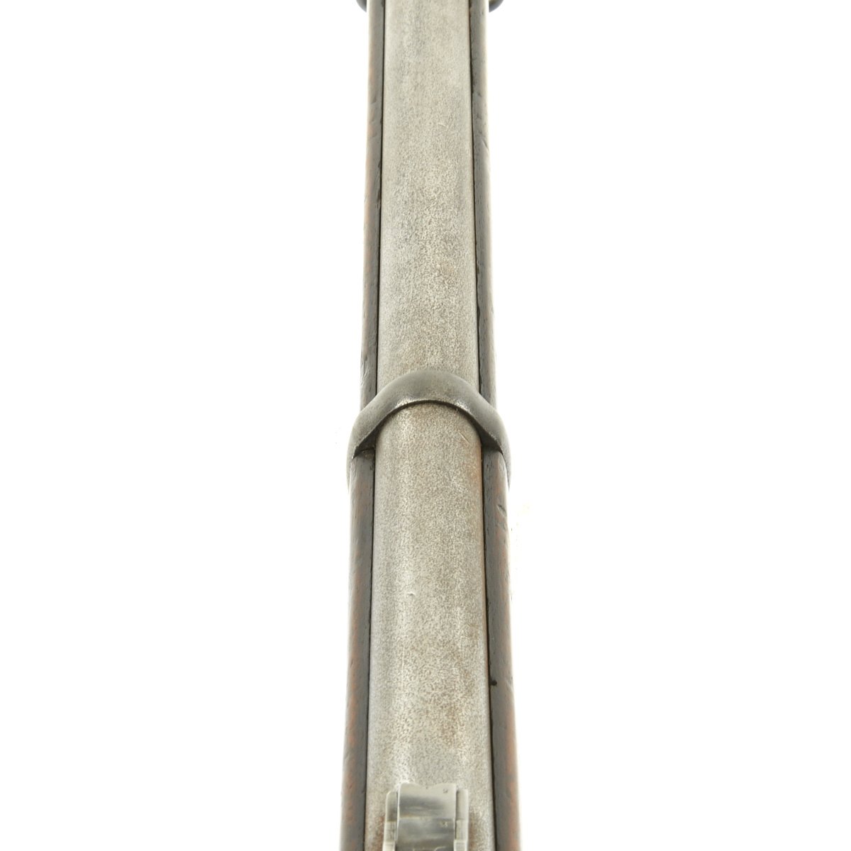 The metalwork overall shows peppering from past pitting, but it has been fully cleaned and restored go put it in its best light. The bore shows the three groove rifling with clear lands and grooves, but with light corrosion overall. The cap nipple is original, but worn, and there is definitely powder burn around the nipple affecting the barrel and stock. The lock functions correctly, holding at half cock. This gun has a correct two leaf sight, and both barrel bands still have their U markings. The ramrod is the correct and original tulip type.