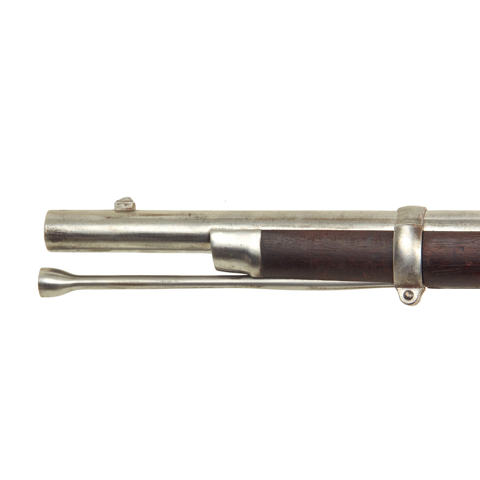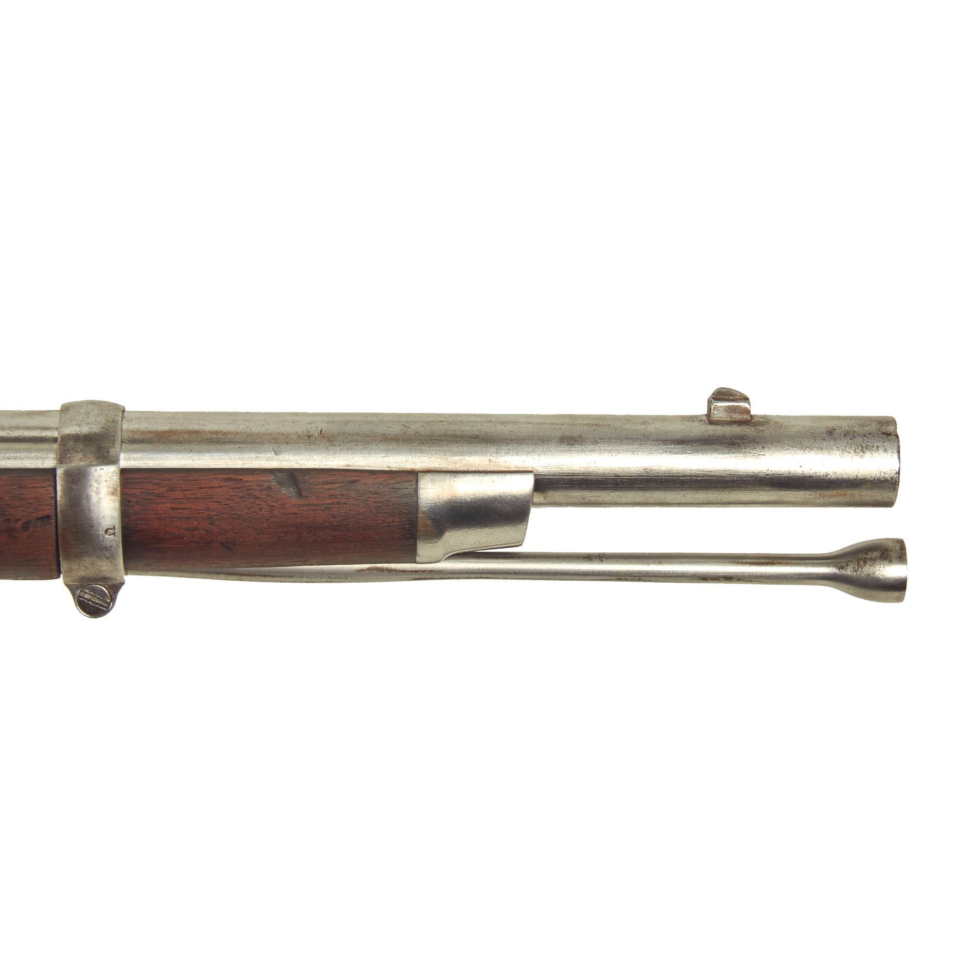 This type I 1863 however escaped conversion, and is presented for sale in the original Civil War era configuration. It came to us in somewhat "barn fresh" condition, however it cleaned up beautifully! It is dated 1864 on the lock plate tail, and also has an Eagle stamped into the lock over U.S. / SPRINGFIELD, indicating production at the United States Armory and Arsenal at Springfield, in Springfield, Massachusetts. The markings on the lock plate are still clear, and it has a lovely bright polished patina on all of the metalwork. The cap bolster also has the proper eagle stamping, though it is somewhat faint off due to powder burn. The bore still faintly shows the three groove rifling, but looks to have seen significant use during its service life, as indicated by the powder turn around the cap bolster. This has worn the bore to the point that the rifling is hard to see. The lock functions correctly, holding at half cock and firing at full.