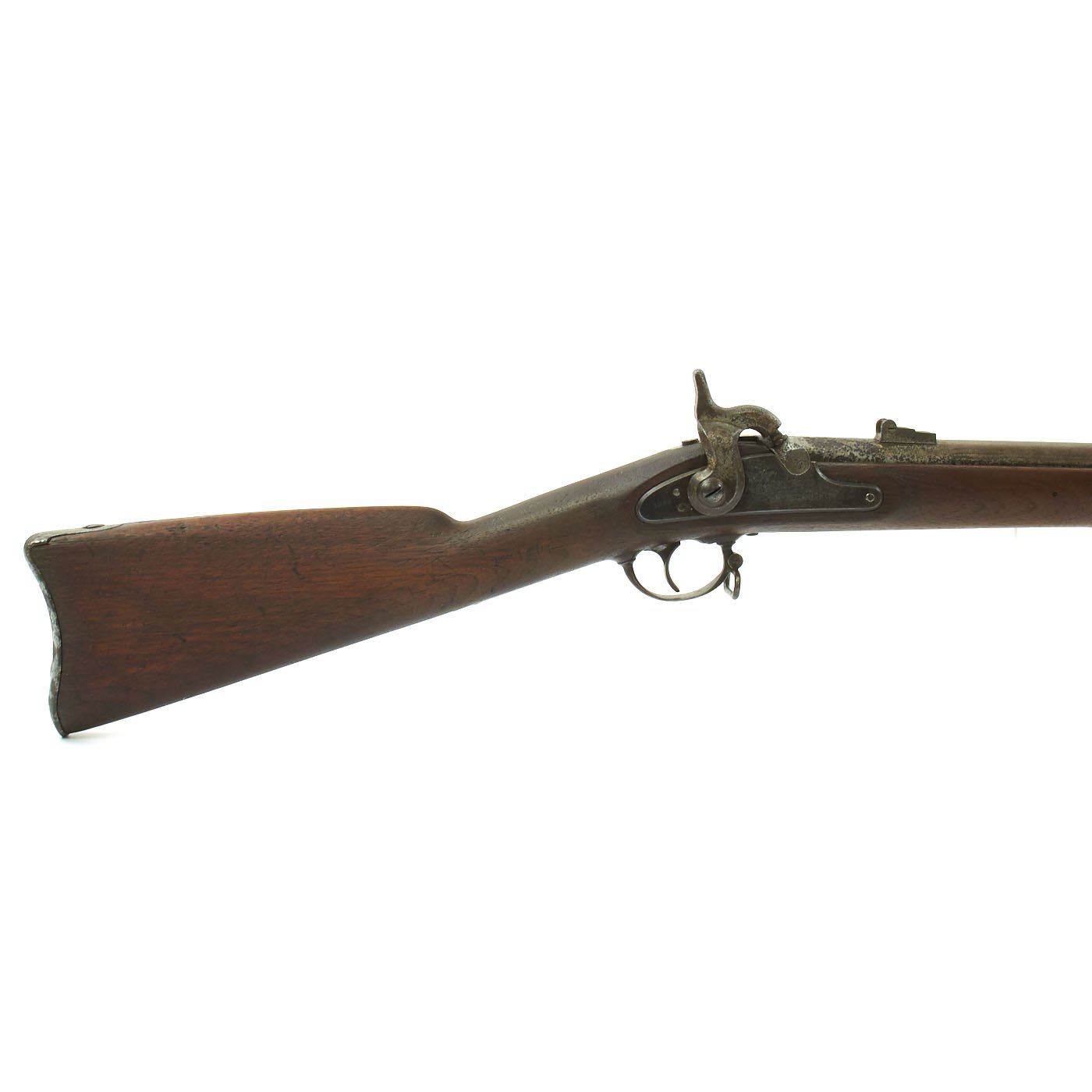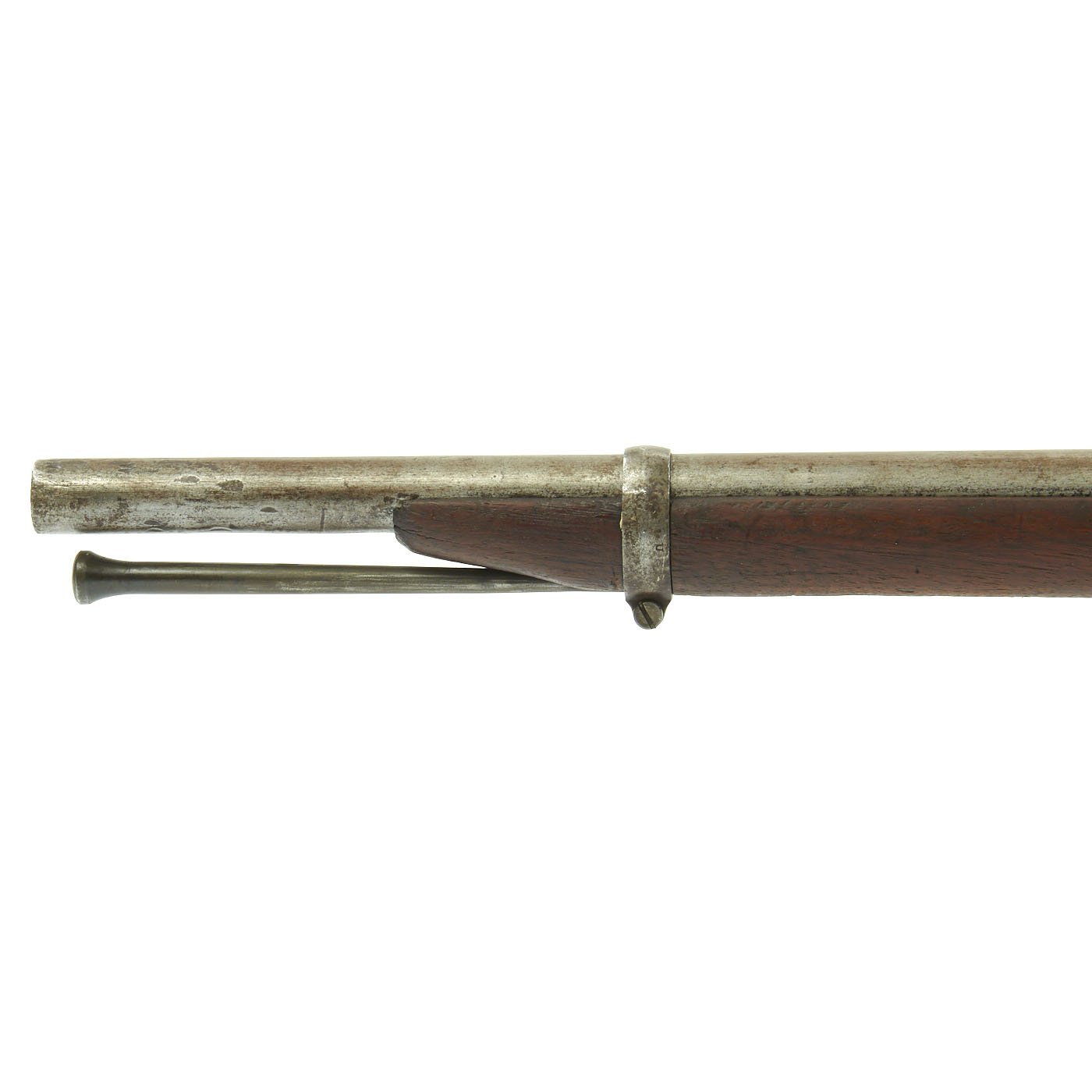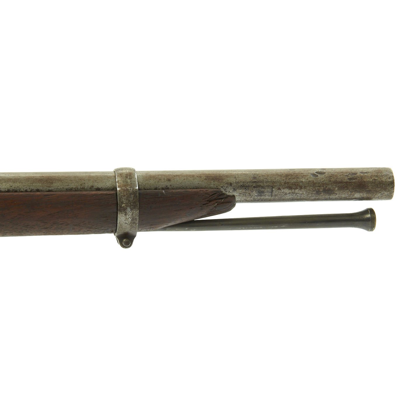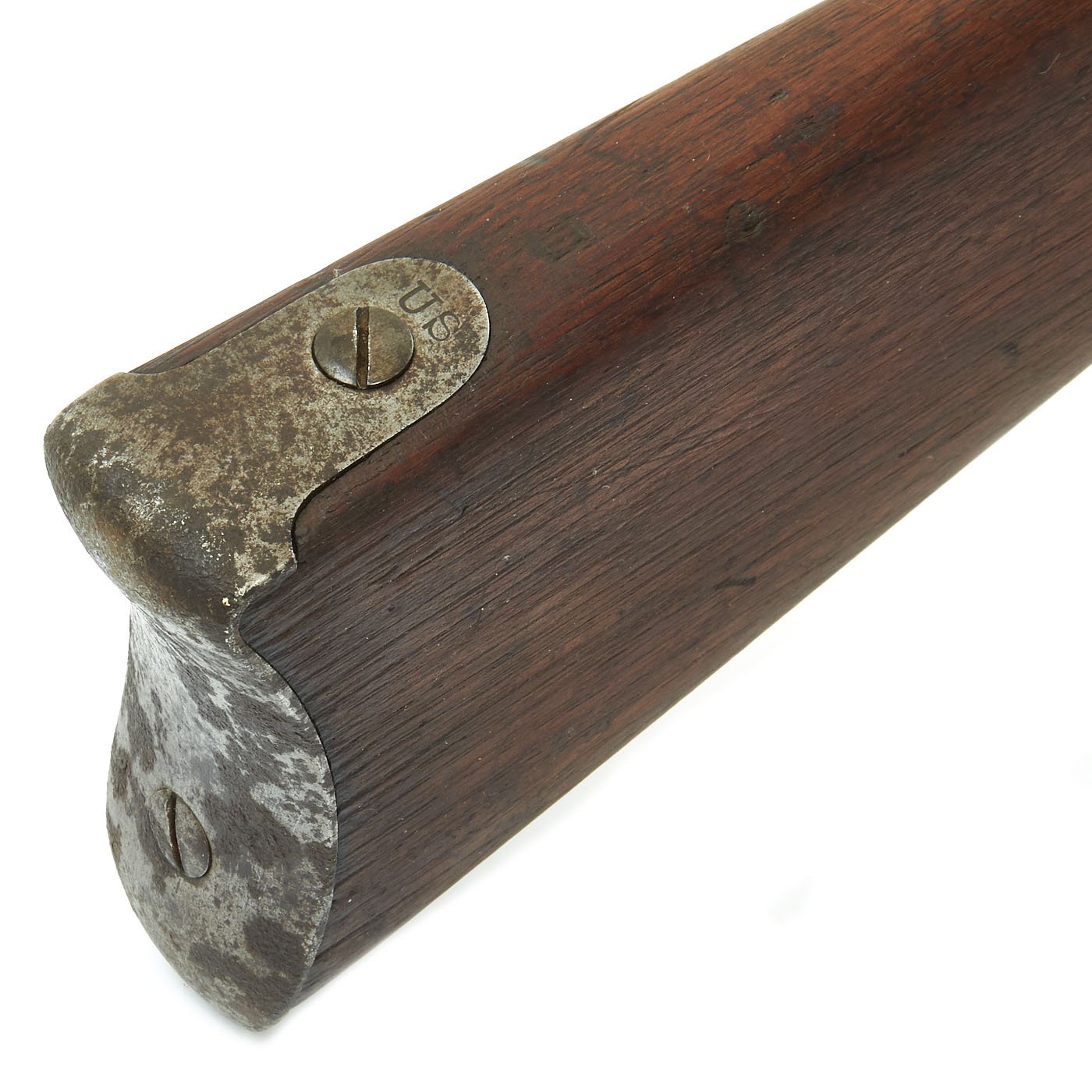 The one piece walnut stock still is in good condition, though time and cleaning have worn away the original inspection cartouches, and it is shortened. The barrel stills shows the P over "Eagle's Head" proofs, though the others are worn away. The barrel is smooth with some dents and pitting, particularly near the breech from powder burn. The rear sight has had the leaf removed or broken off. The butt-plate is stamped U.S. as per regulation, and all barrel bands are U stamped. The ramrod is the correct and original tulip type, shortened the appropriate amount.