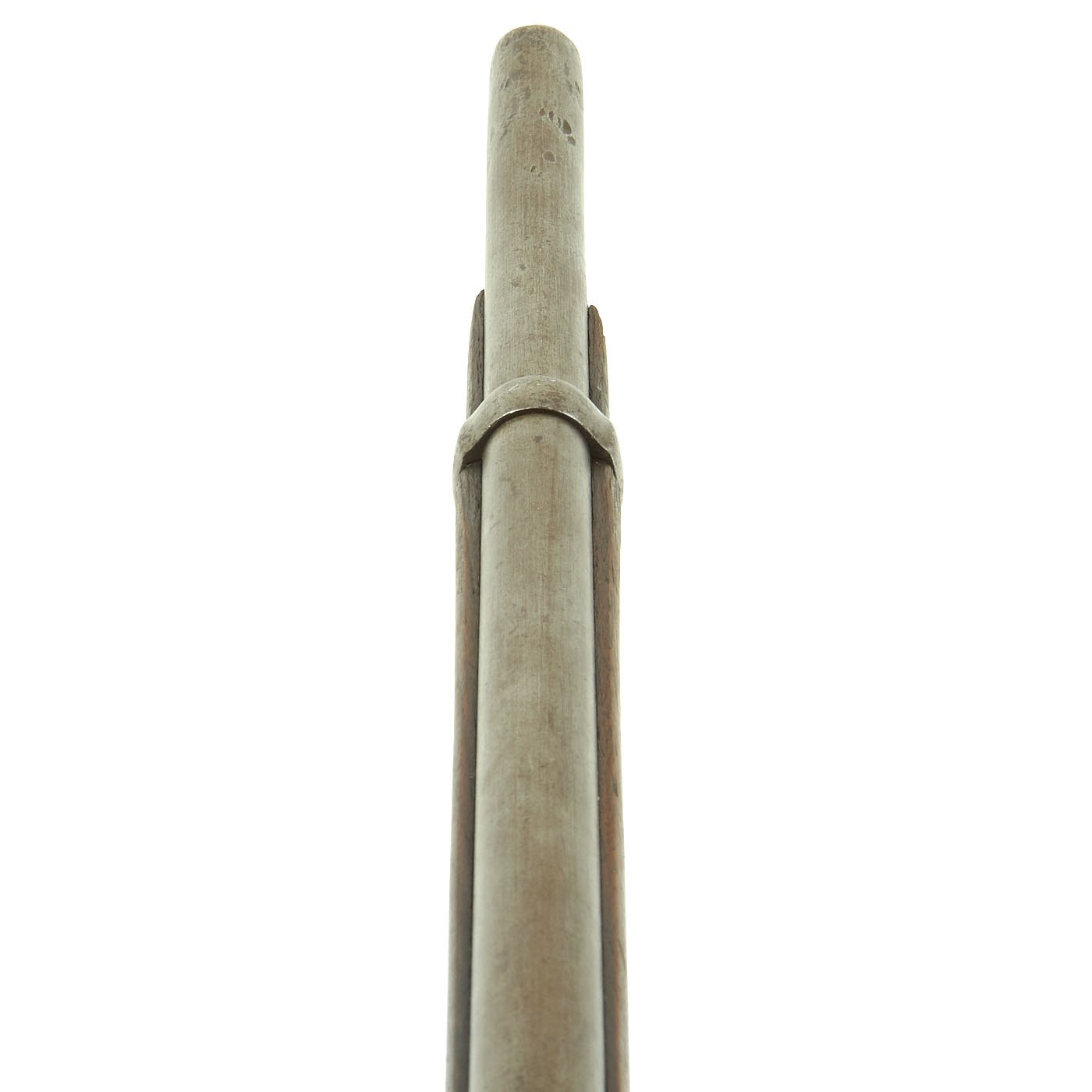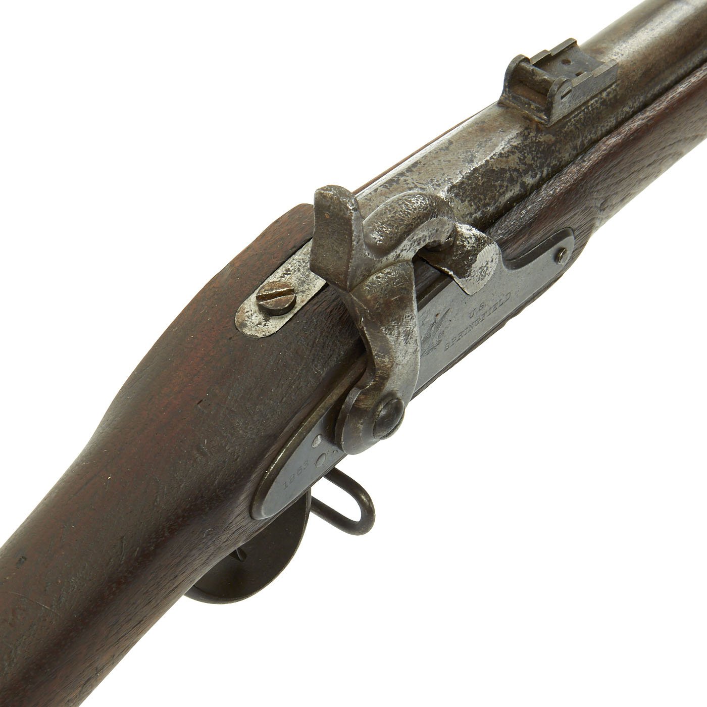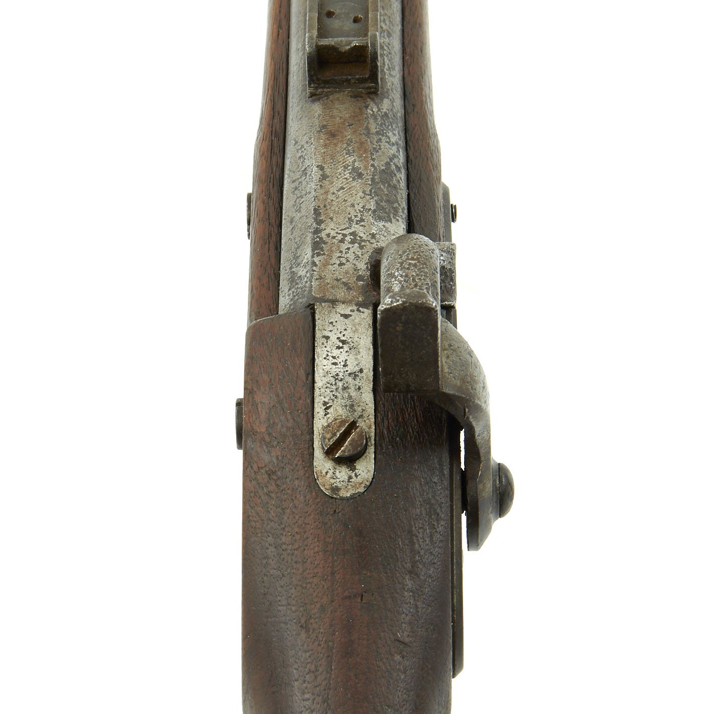 The one piece walnut stock still is in good condition, though time and cleaning have worn away the original inspection cartouches, and it is shortened. The barrel stills shows the P over "Eagle's Head" proofs, though the others are worn away. The barrel is smooth with some dents and pitting, particularly near the breech from powder burn. The rear sight has had the leaf removed or broken off. The butt-plate is stamped U.S. as per regulation, and all barrel bands are U stamped. The ramrod is the correct and original tulip type, shortened the appropriate amount.