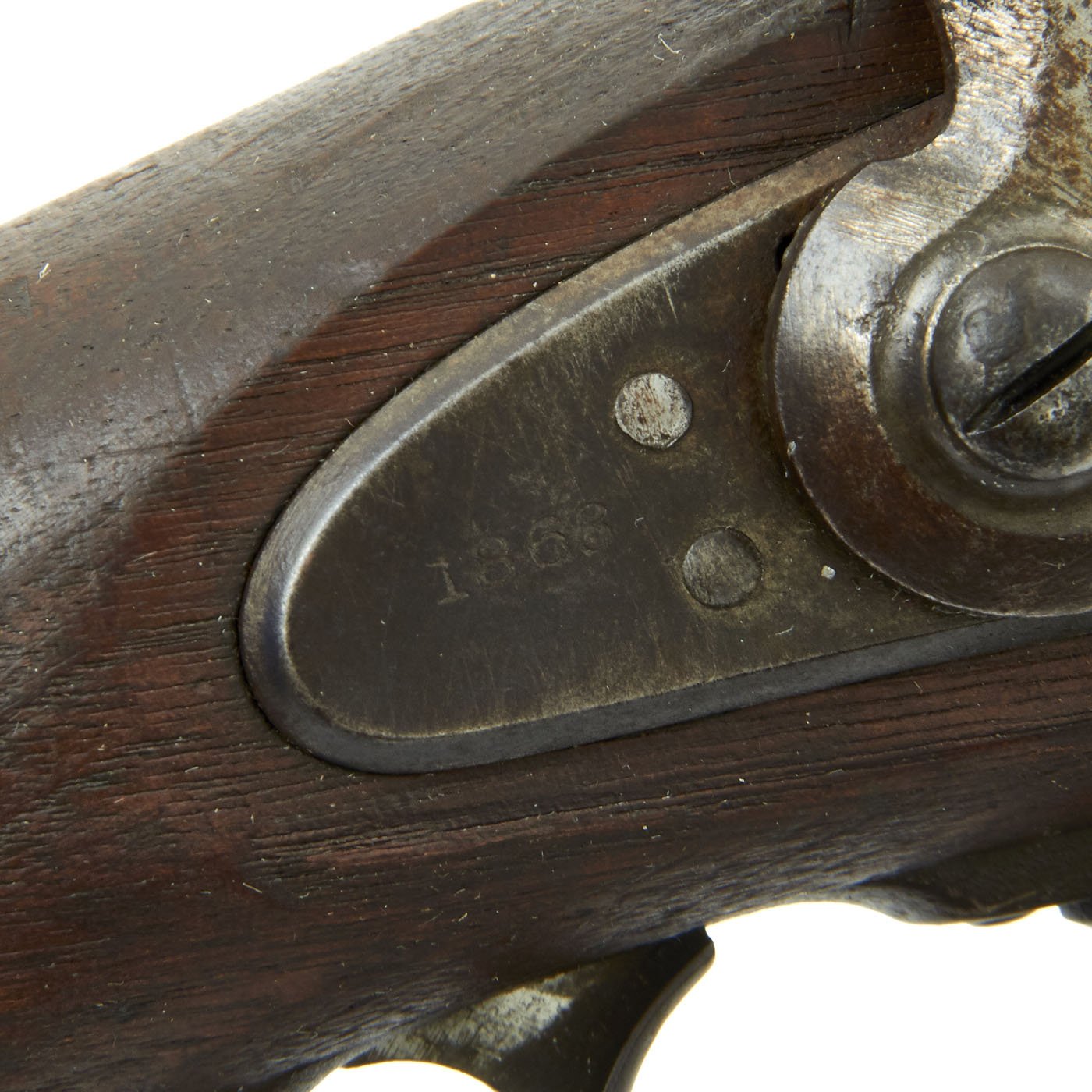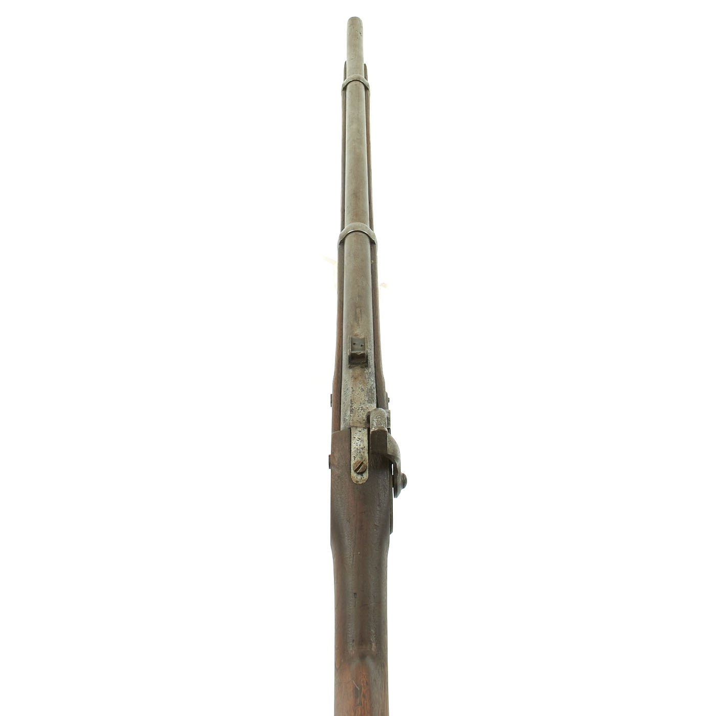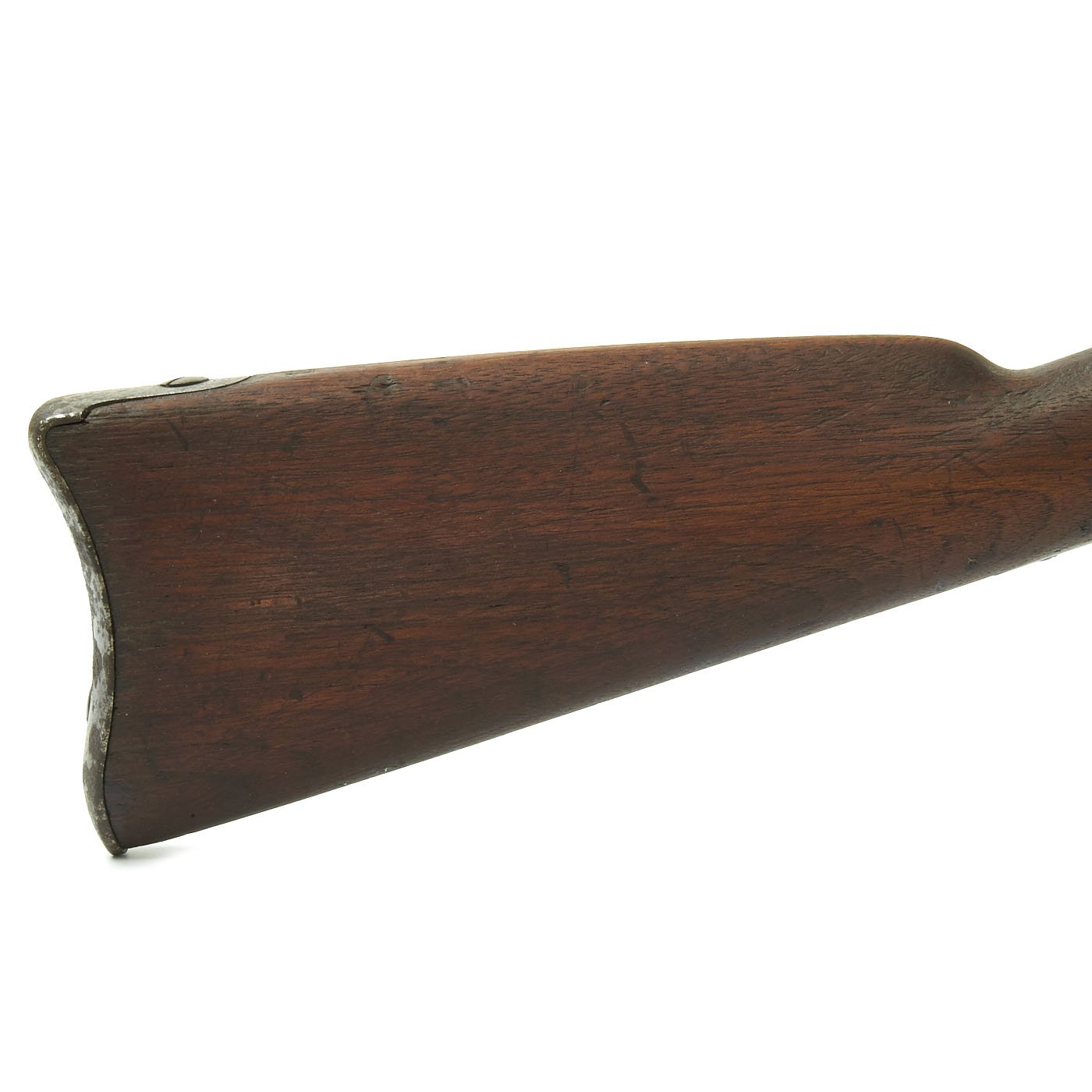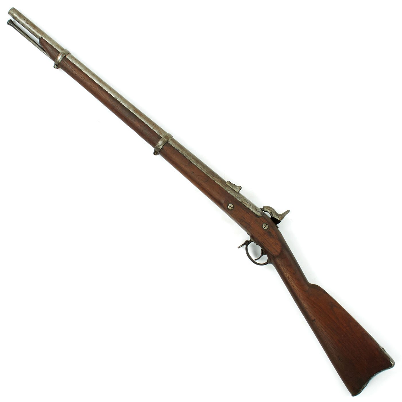 The one piece walnut stock still is in good condition, though time and cleaning have worn away the original inspection cartouches, and it is shortened. The barrel stills shows the P over "Eagle's Head" proofs, though the others are worn away. The barrel is smooth with some dents and pitting, particularly near the breech from powder burn. The rear sight has had the leaf removed or broken off. The butt-plate is stamped U.S. as per regulation, and all barrel bands are U stamped. The ramrod is the correct and original tulip type, shortened the appropriate amount.