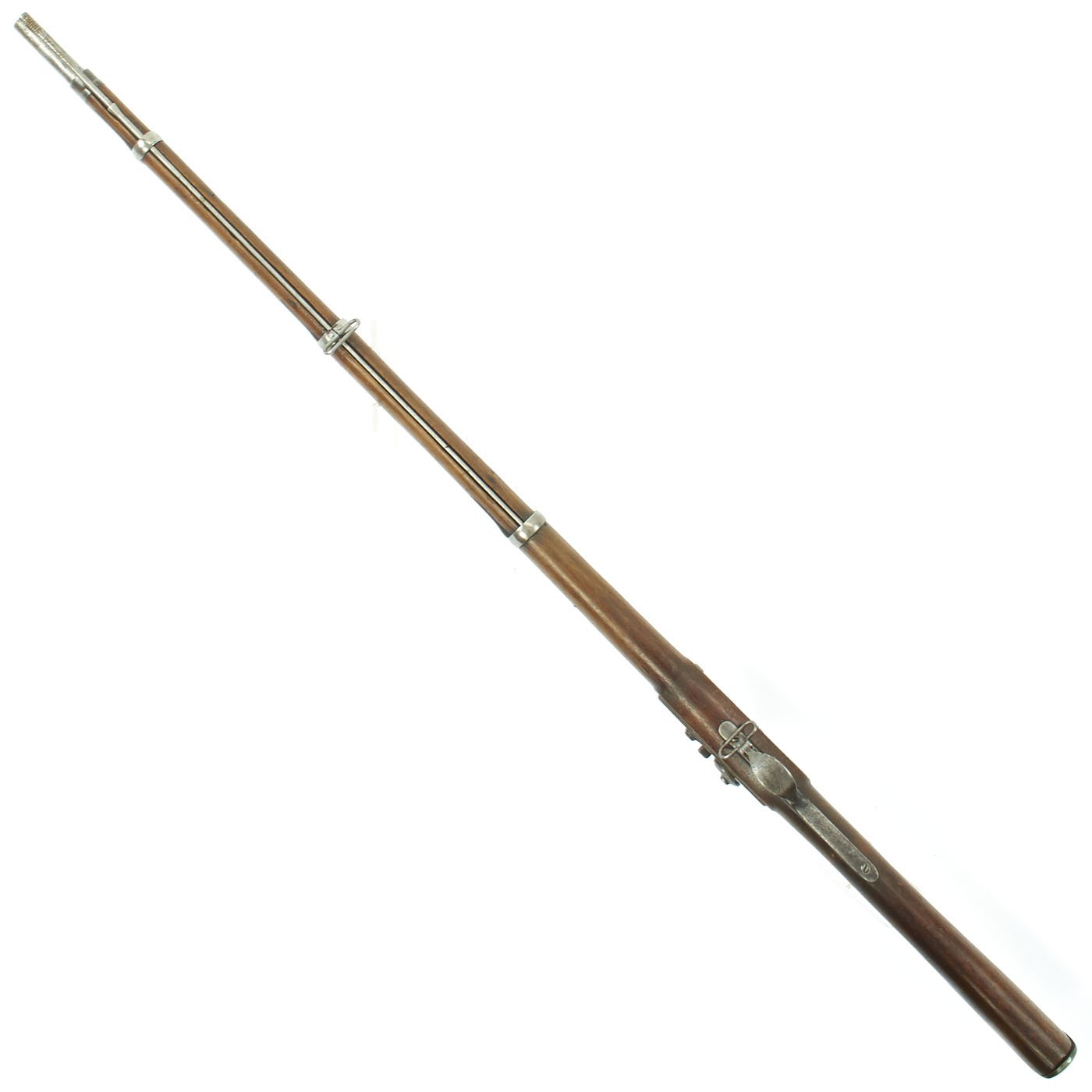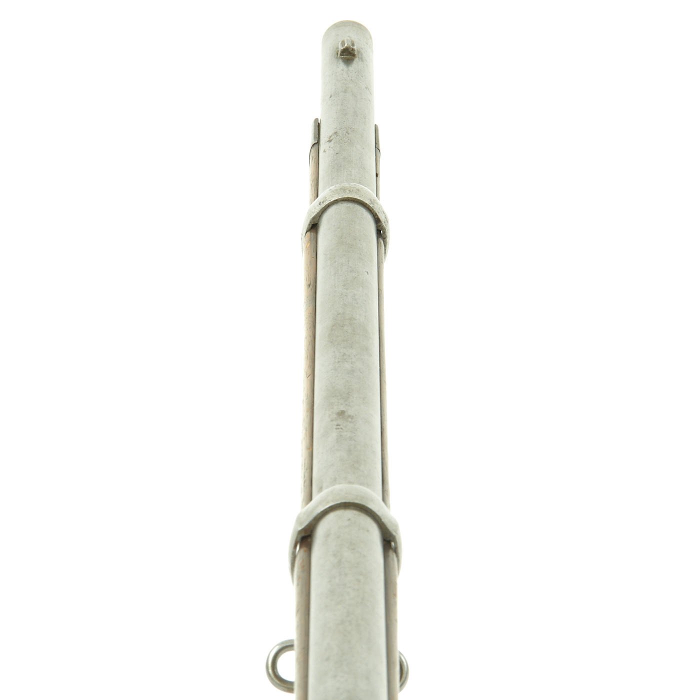 In fine condition, the lock is dated 1864 across the tail and has an EAGLE to the left of U.S. over SPRINGFIELD. The Breech Block is DATED 1870 with an Eagle head "Crossed Arrows" cartouche over U.S., indicating the year of conversion. The long receiver indicates that this is definitely a model 1868, and not a model 1870. Interestingly, there are no serial numbers stamped on the left side of the barrel and receiver. It's also notable that the sight is much farther forward than usually seen on any of the converted models. The stock also has THREE barrel bands, not the usual two seen on these rifles. This leads us to believe that it is not a new made stock, but in fact a model 1863 stock that was adjusted for the new receiver. All three barrel bands have their correct "U" markings, so they are definitely genuine, and have their correct band springs.