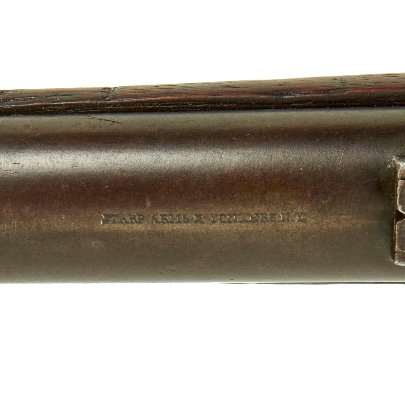 This is a lovely example of the Model 1865 Starr Saddle Ring Carbine, a rimfire design intended for Cavalry troops. We have only had a few of these before, as the "capping breech loader" Model 1858 is much more common on the market. The barrel on this example is marked with serial number 33979 on the right hand side, while the breech block marking was removed during conversion. It is also marked nicely on both lock and barrel: STARR ARMS CO. YONKERS, N.Y. , which are both clear. It also still has patent markings just behind the falling breech: STARR'S PATENT. / SEPT. 14TH 1858.