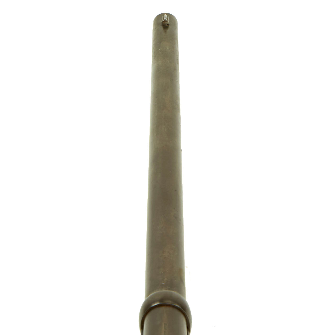 The metalwork on the carbine has faded to a lovely gray worn patina overall from years of use followed by decades of cleaning. The saddle ring and bar have unfortunately been removed from the carbine. The action opens correctly and moves smoothly, though there is a bit of slop due to wear. The cartridge ejector looks to be missing, though there is definitely a space for it, but we do not know if it was removed or broke off. The bore shows land and grooves, but also significant oxidation and fouling in areas, particularly near the muzzle. This is definitely a carbine that saw service well after the war.