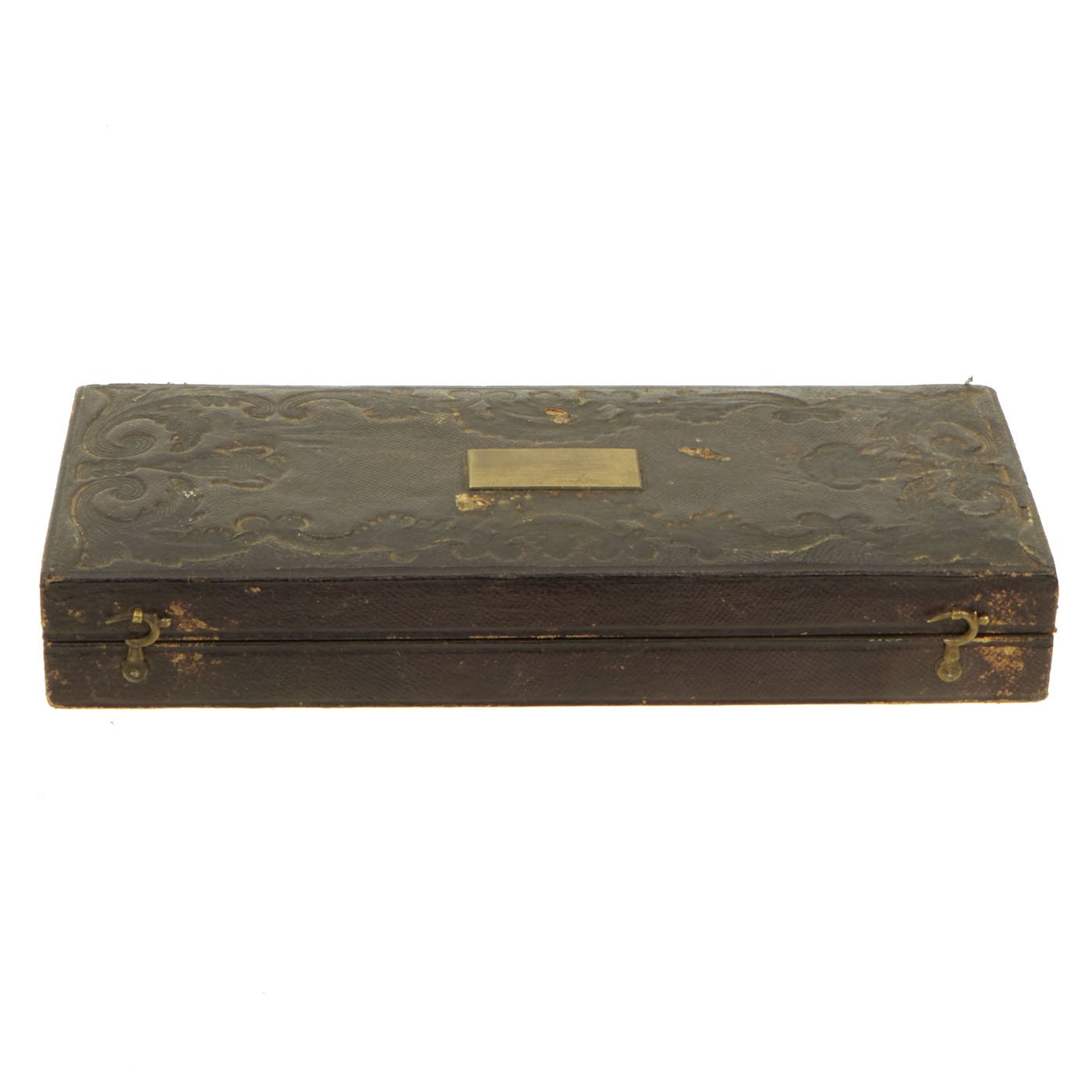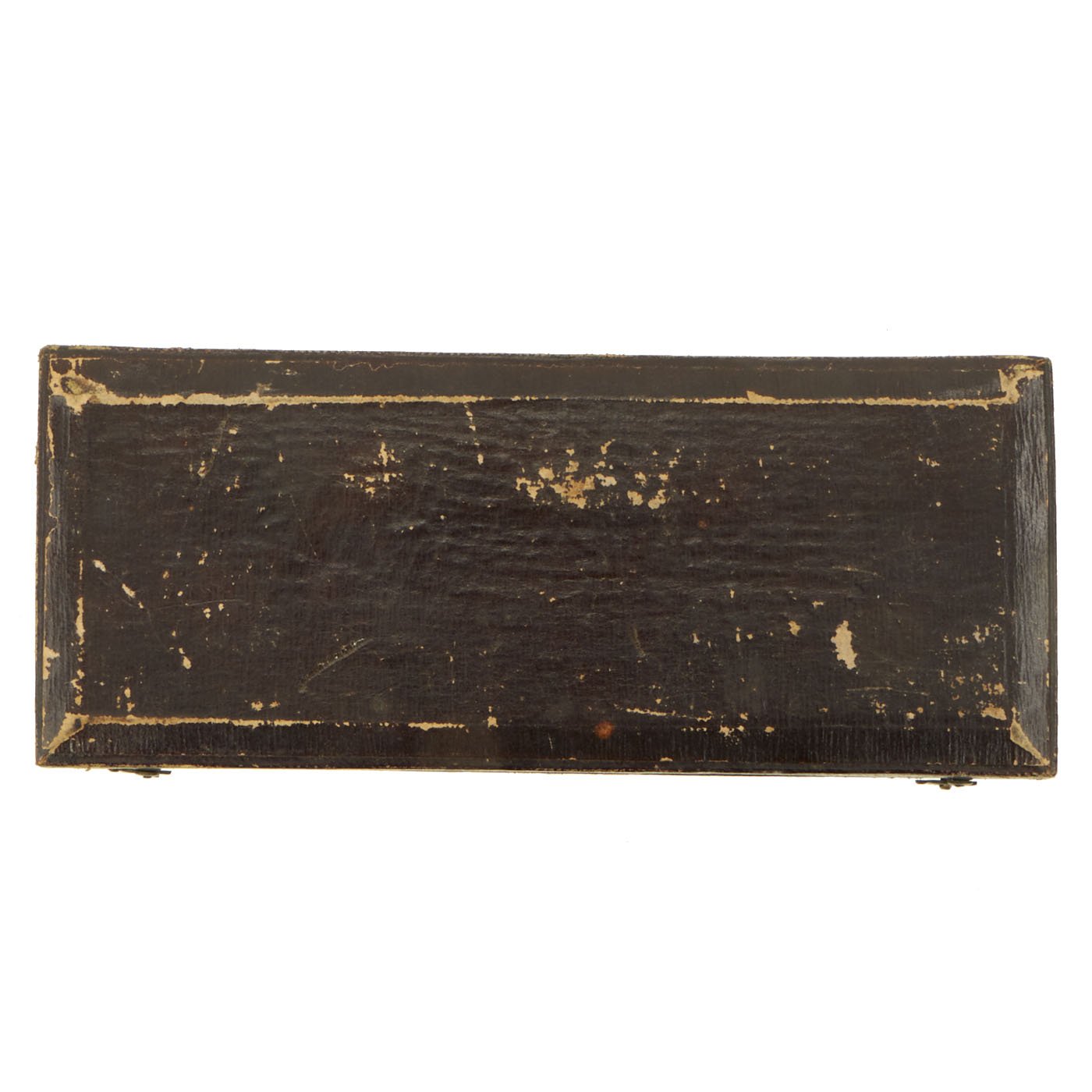 A very nice little set, no doubt missing a few components. Comes in a nice latching leather covered wood case lined in maroon velvet, measuring 6 7/8" x 2 3/4" x 1 1/8". Ready to research and display!