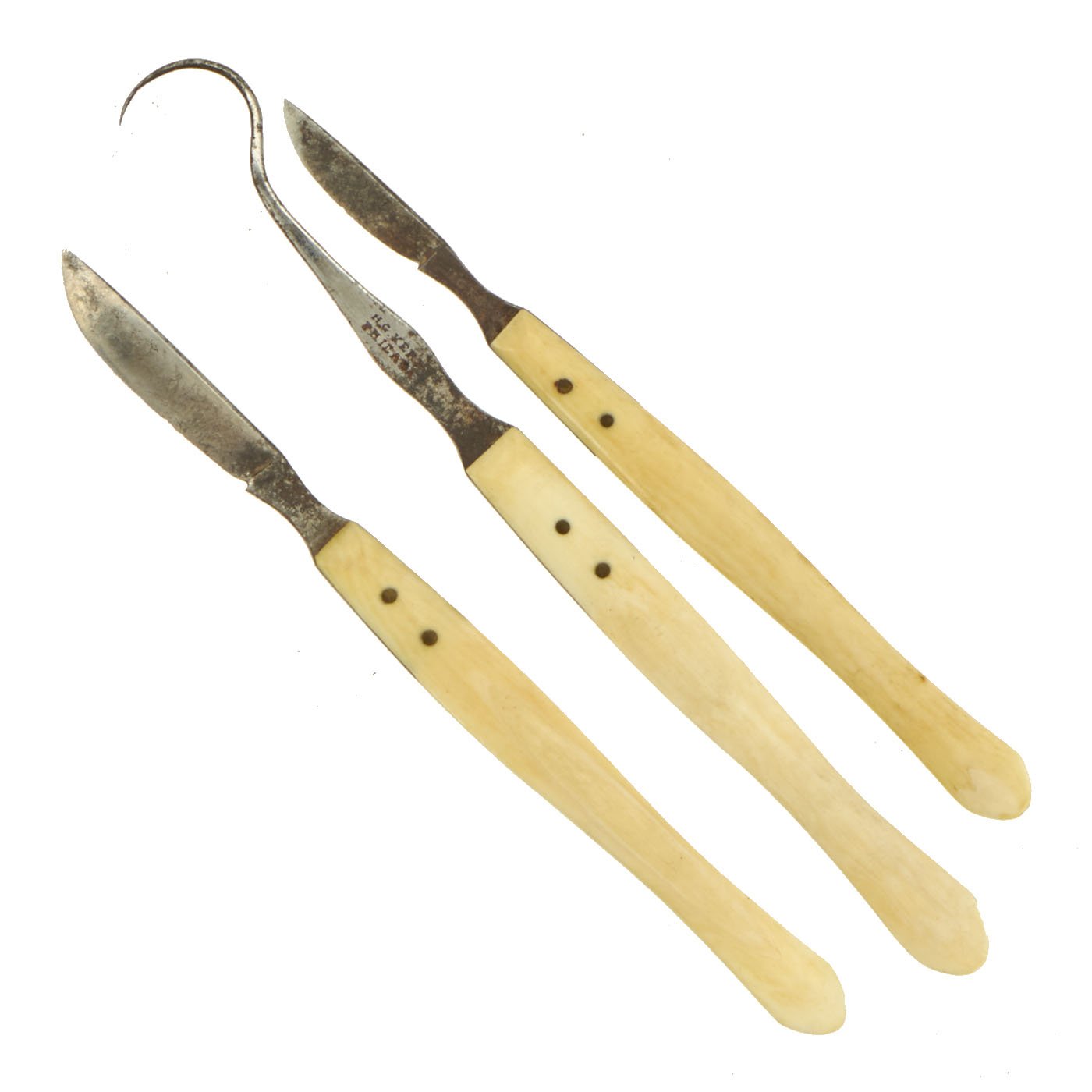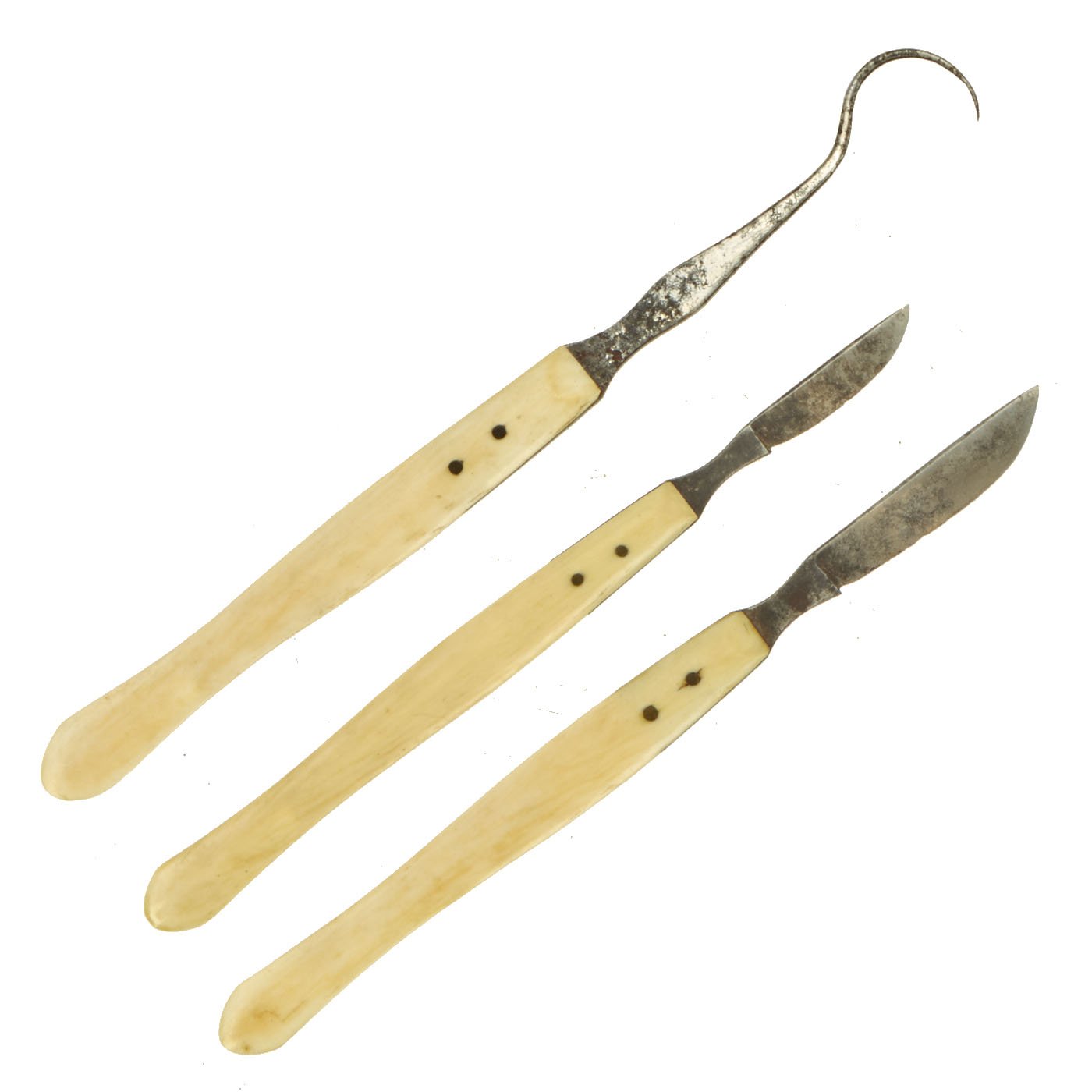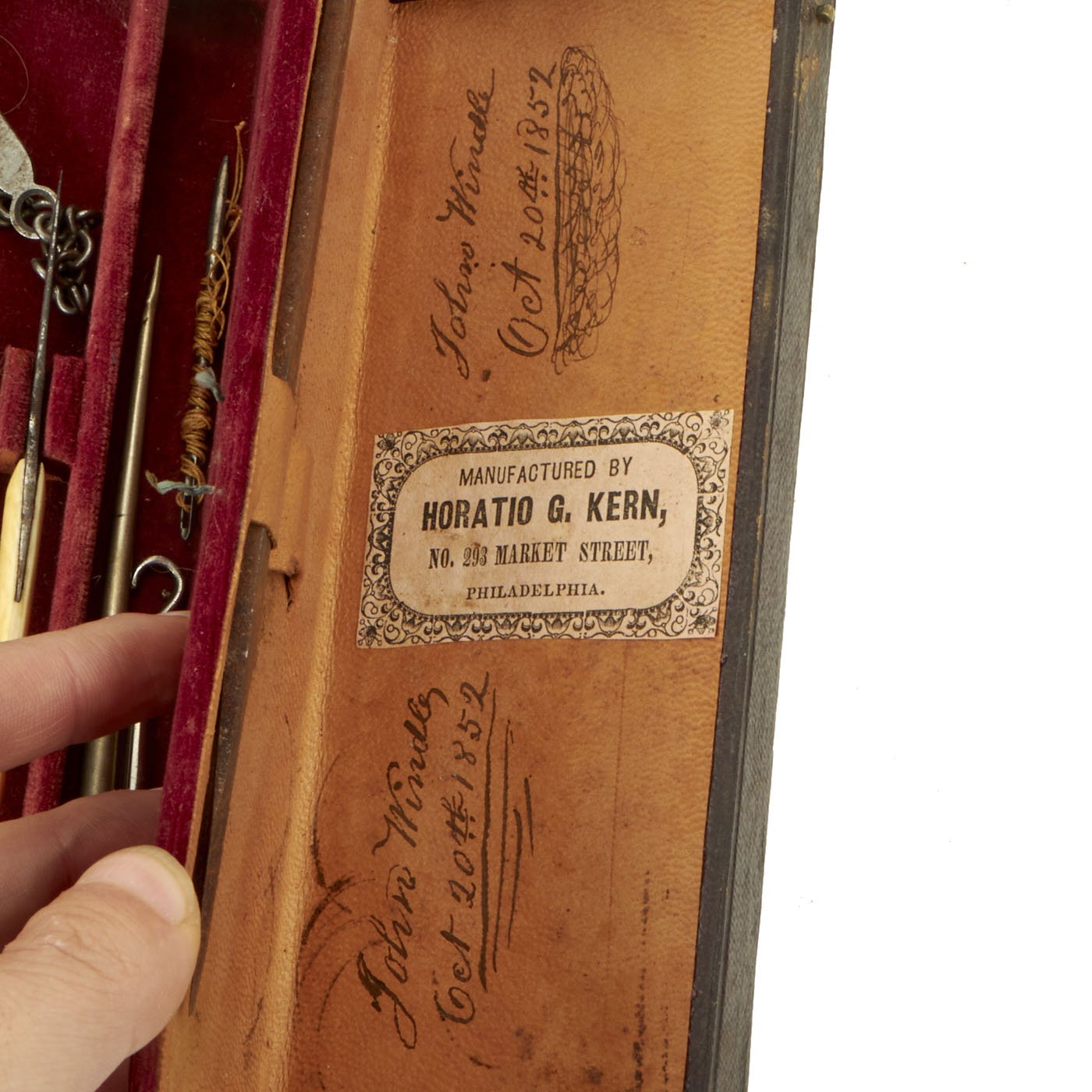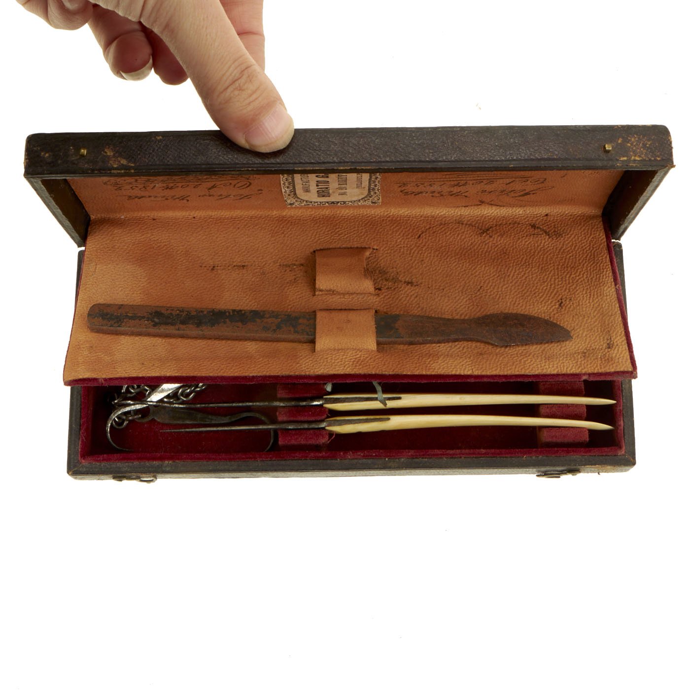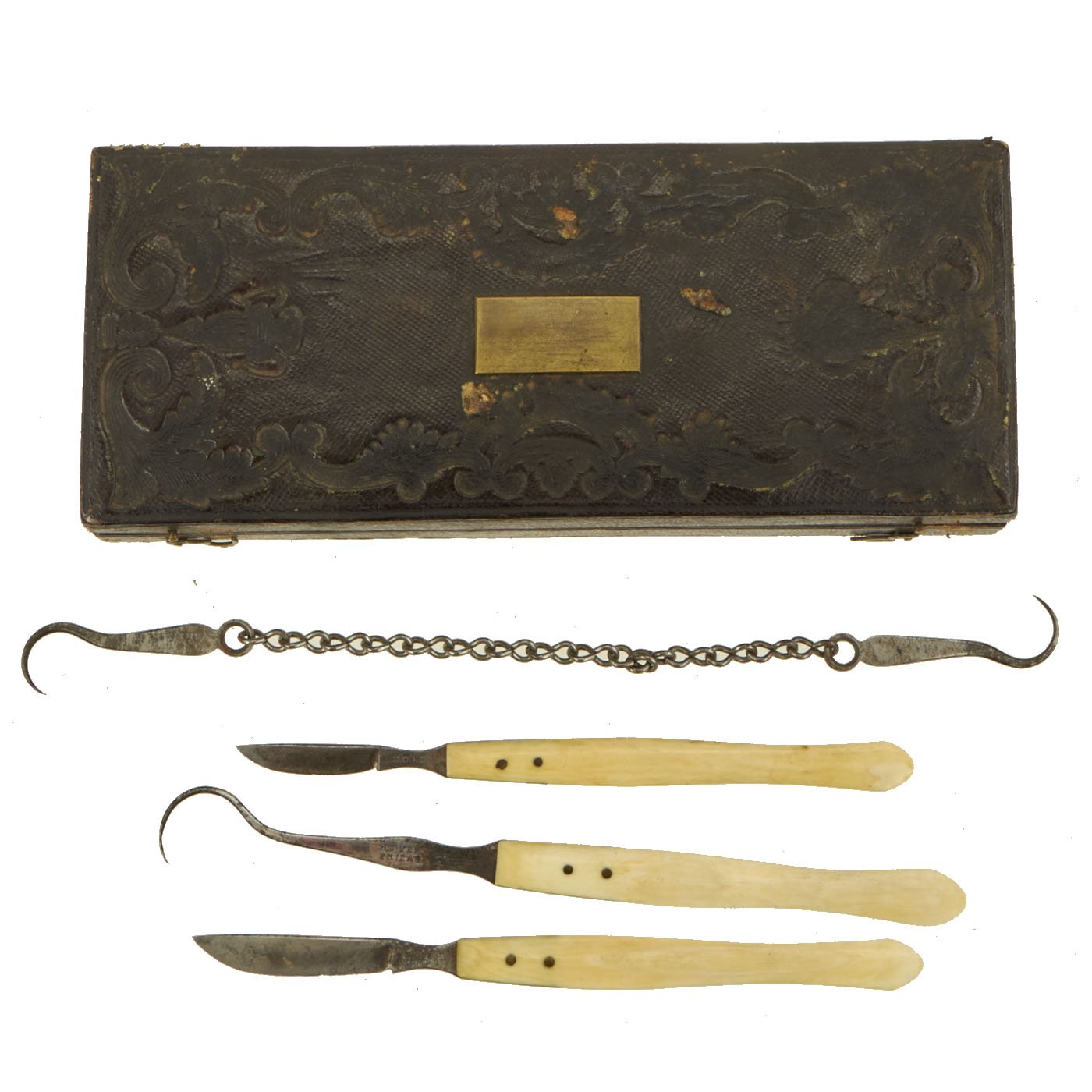 Original Items: One of a Kind Set. Here we have a very nice U.S. Civil War surgeon's dissection kit, almost certainly also used in wartime to assist taking care of minor wounds encountered on the battlefield. Consisting of scalpels, hooks and probes, it has a compartment under the lid for additional tools, showing the maker as: