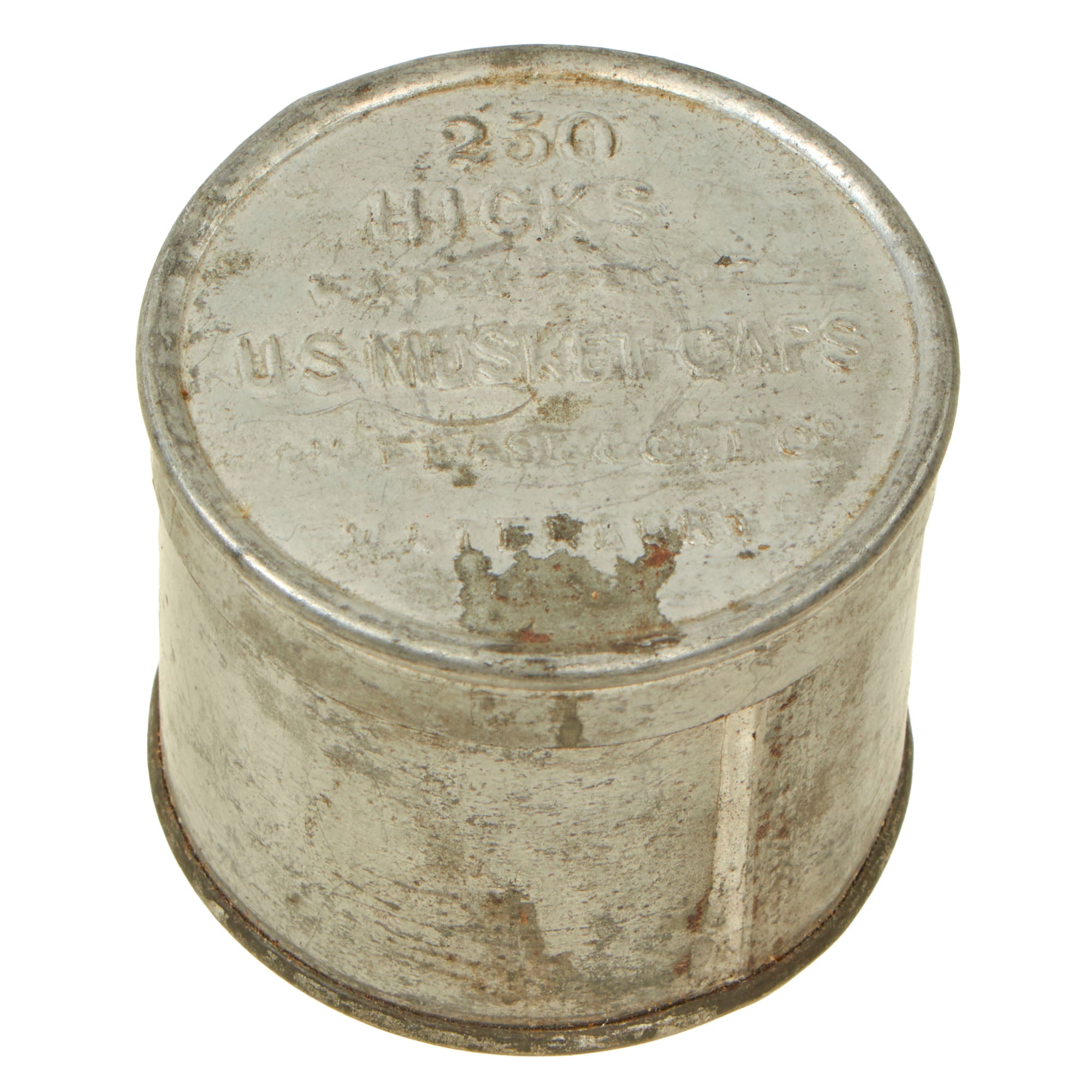 Original Item. Only One Available. This is a great piece of Civil War field gear, a large tin of 250 Hick’s Waterproof percussion caps. We have not counted to make sure there are 250 present, but it is about full. The lid of the tin reads: