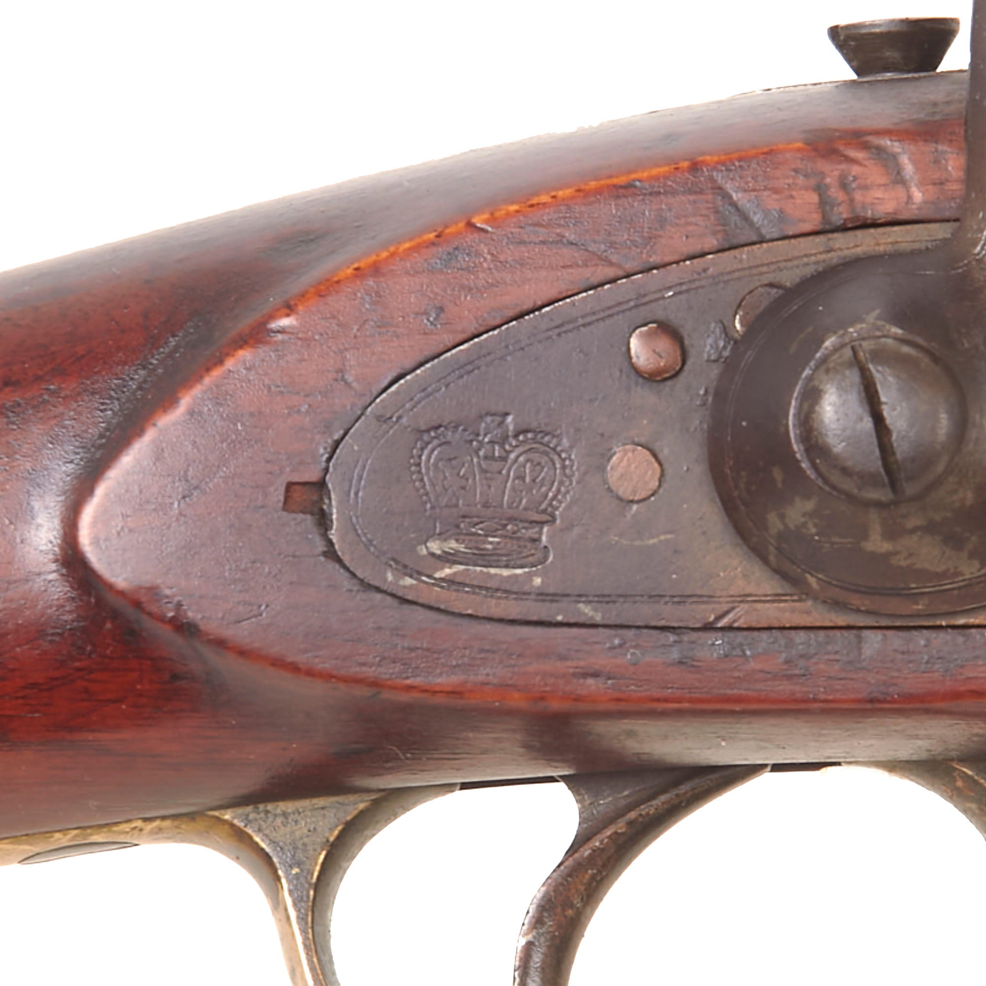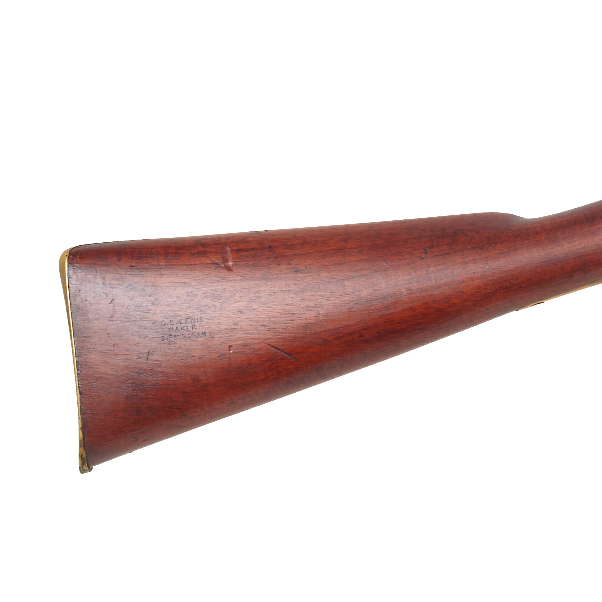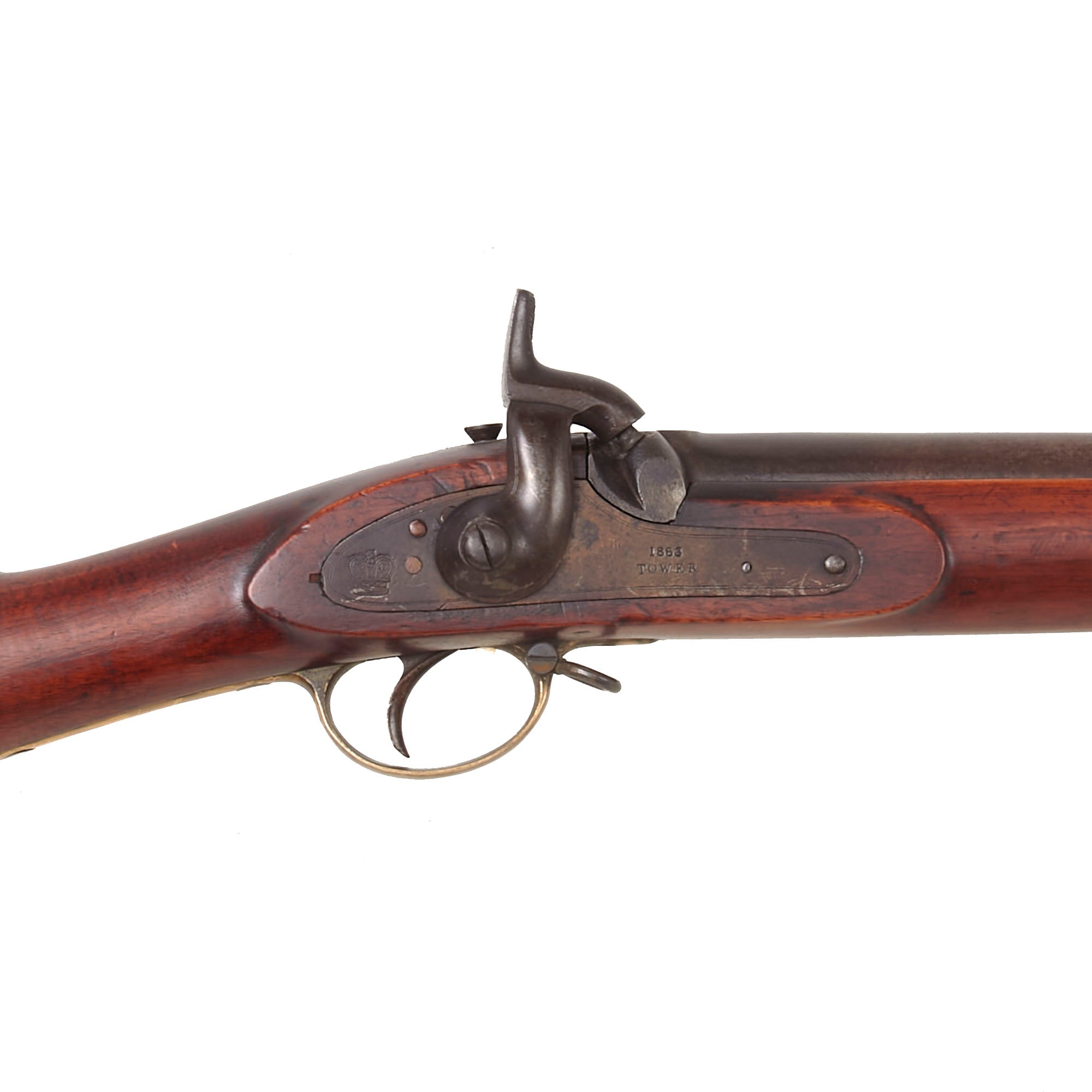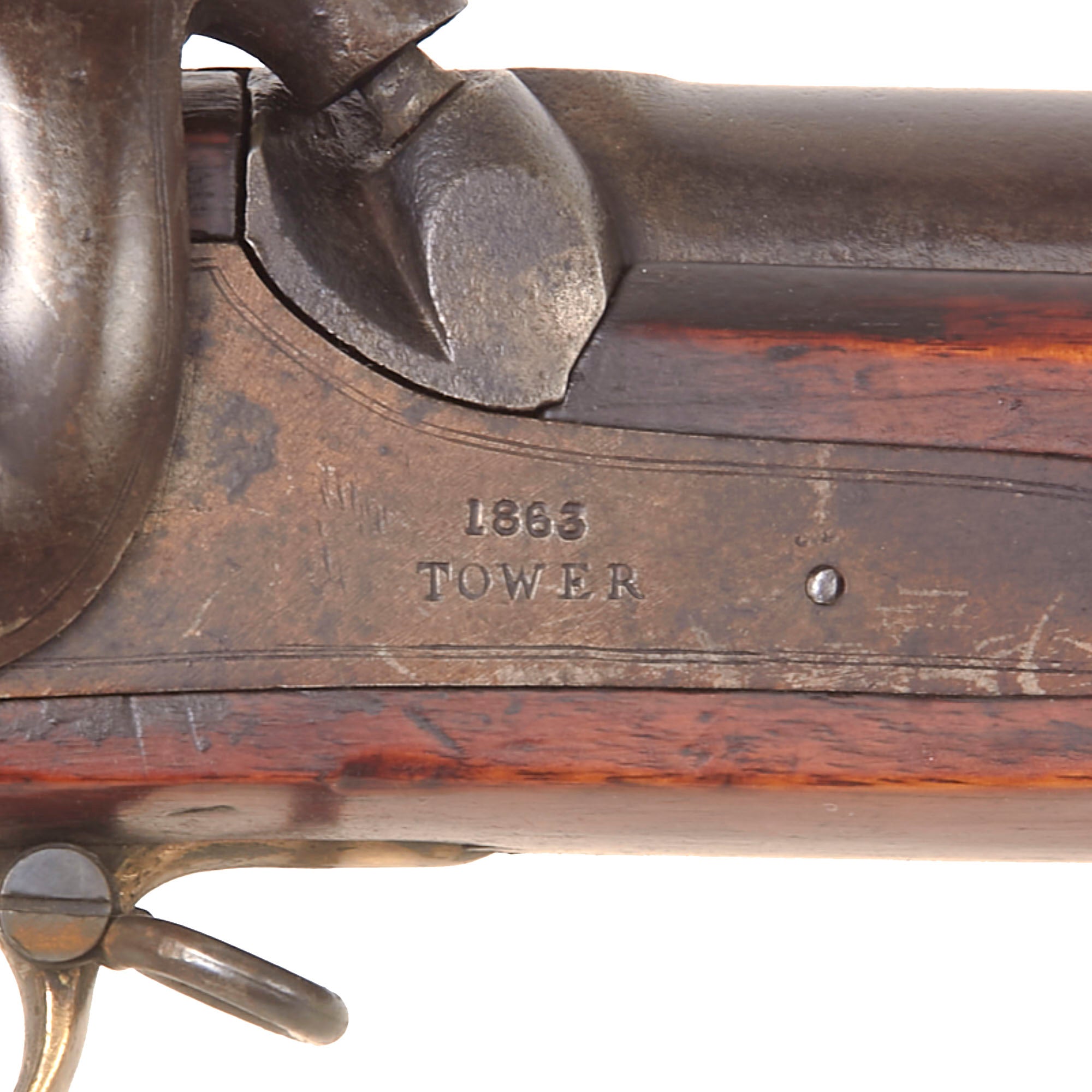 The lock is marked 1863 / TOWER at the bottom of the lock plate, and it is marked with a QUEEN'S CROWN to the rear of the hammer. However, there is NO V.R. under the crown. This indicates that this weapon was not intended for a British Military contract but was aimed at the Overseas market, most specifically the United States, who were embroiled in its most terrible Civil War. As a Confederate destined weapon it should have the right hand side of the butt stamped with a roundel stating "BIRMINGHAM SMALL ARMS TRADE", however this example bears another marking: