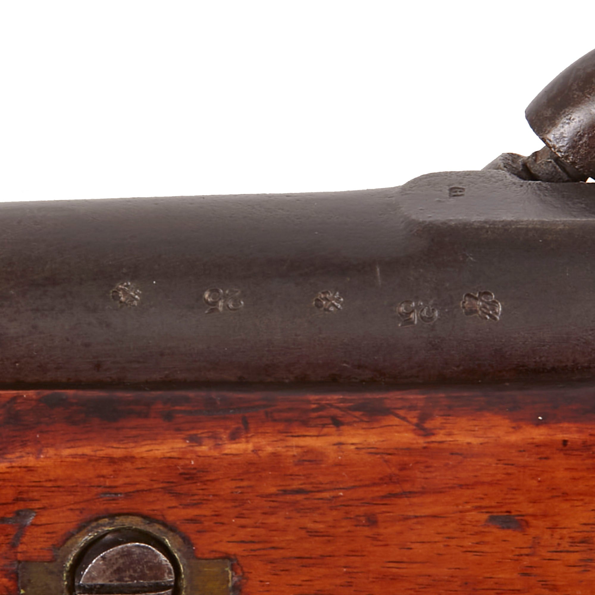 It is our understanding that this is another marking commonly seen on Confederate-linked P-1853 Enfield Rifles. The barrel bears British Proof Marks, which are still relatively clear. They are the correct Birmingham proof marks, including the CROWN / CROSSED SCEPTERS / BPC "proof" and CROWN / CROSSED SCEPTERS / V "viewed" marks. There is also the CROWN / BP definitive proof, and two 25 markings, indicating "25 bore" or about .571". There is also a CL stamping on the top of the barrel, probably for C Lewis. We have noted that the rear sight was removed long ago, which is a very common modification on Confederate Enfield rifles.