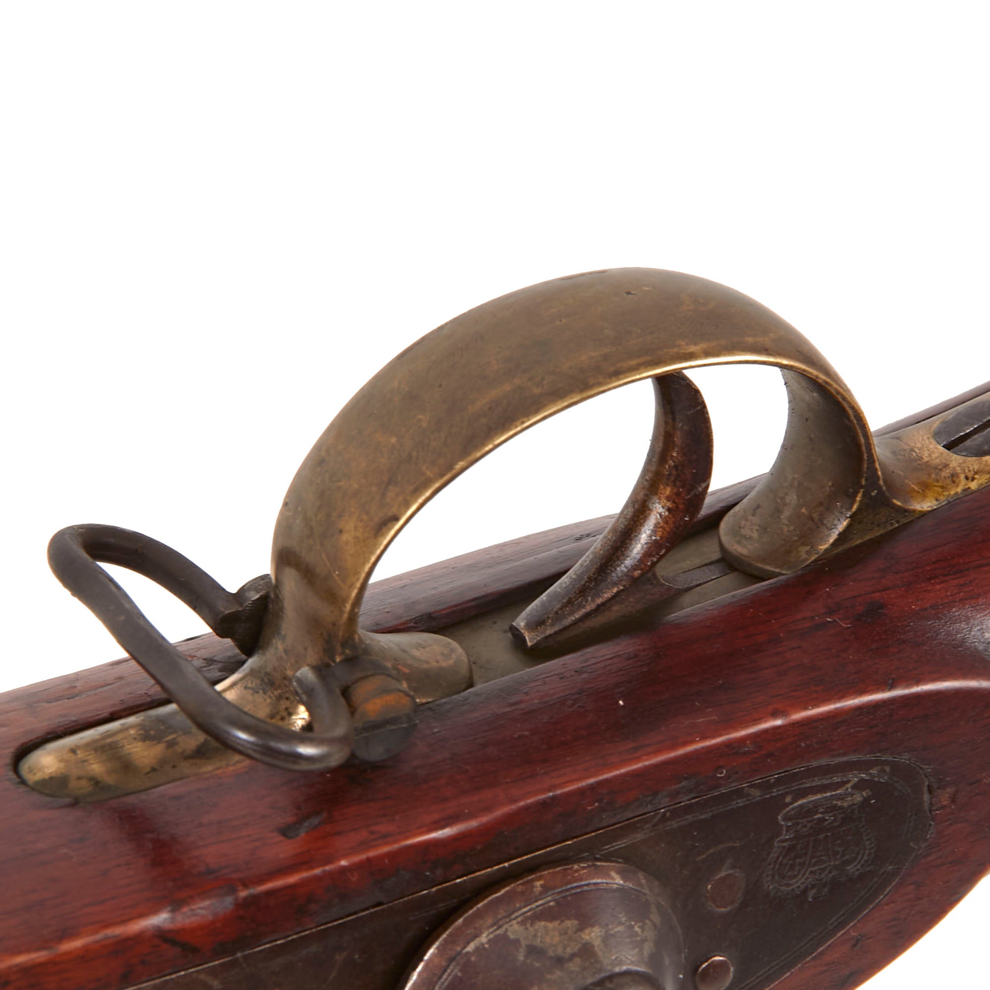 The rifle is in very good condition overall, and does not look like it saw extensive use during the war, or afterwards. The metalwork has a lovely brown aged oxidized patina, particularly on the barrel and lock, while the barrel bands saw a bit more oxidation, and were cleaned at some point, giving them a matte finish. The brass trigger guard, butt plate, and nose cap are all lovely. As mentioned previously the rear sight is missing, and the original cleaning rod looks to have been replaced during the period. Both sling swivels are present and move relatively easily. The lock is fully functional, and holds correctly at half cock, only firing at full. We did notice that the tang screw was out a bit, but not before photography, after which it screwed in correctly.