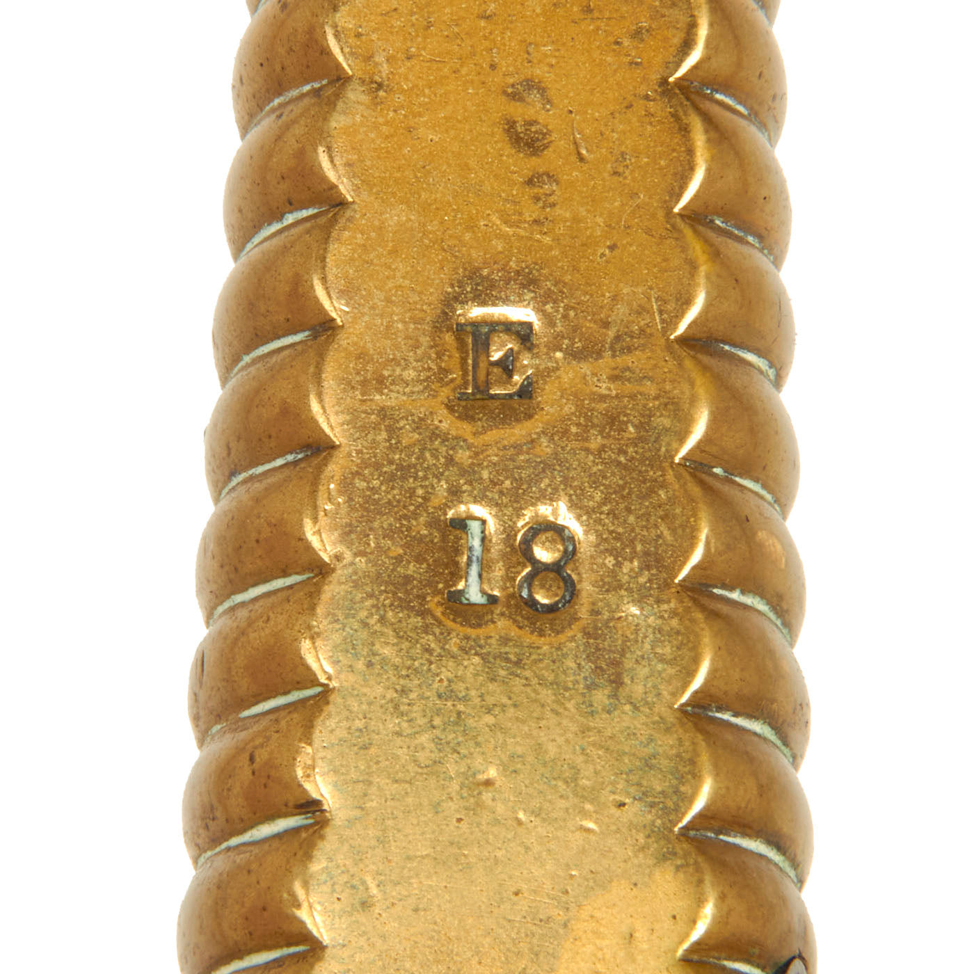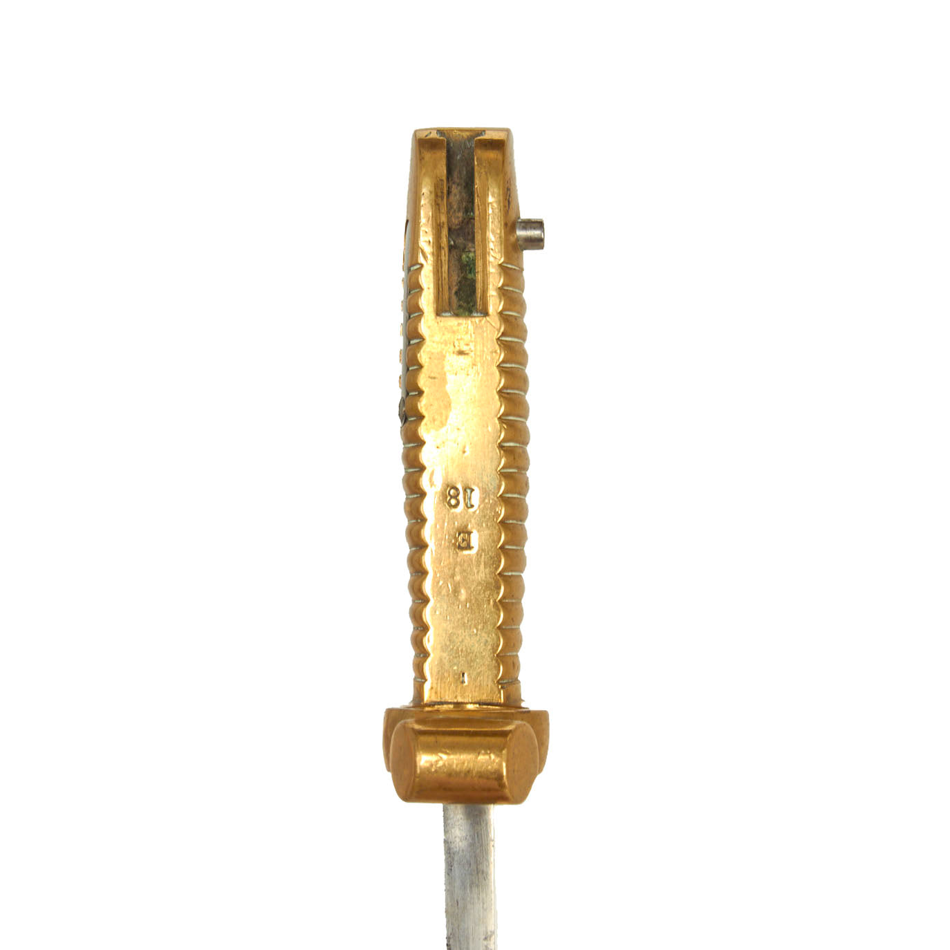 This example is in excellent condition with a lovely scabbard. There is minor peppering and staining to the blade, but there appears to be no extensive damage present. The lovely brass hilt has some minor scratching present but that’s expected with a service used bayonet that is almost 200 years old. There is what appears to be a rack number or rifle number stamped into the spine of the handle; E / 18. The scabbard is complete and solid, but there is finish loss and crazing on the leather portion. The rear seam stitch is still nice and tight and there are no folds or dents present.