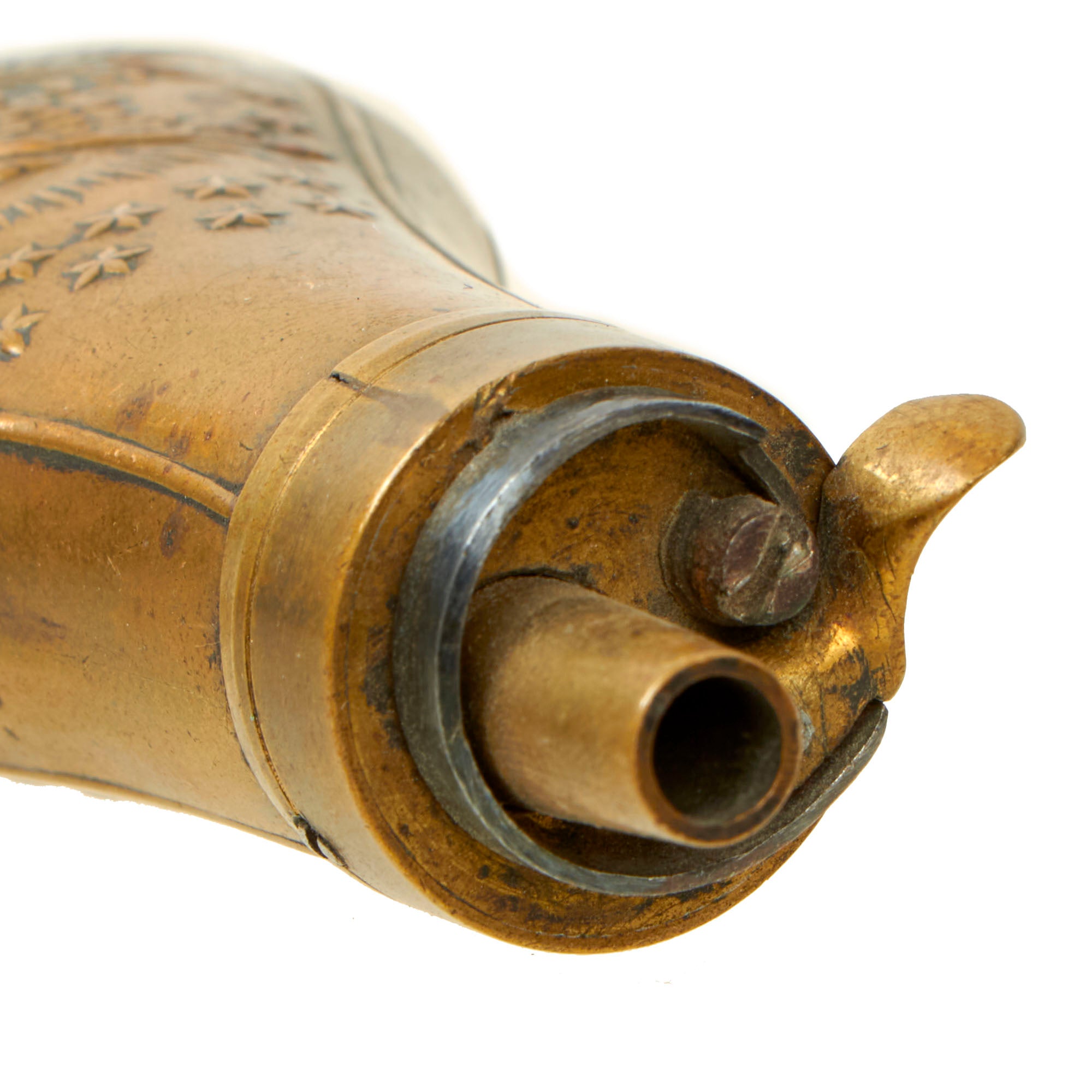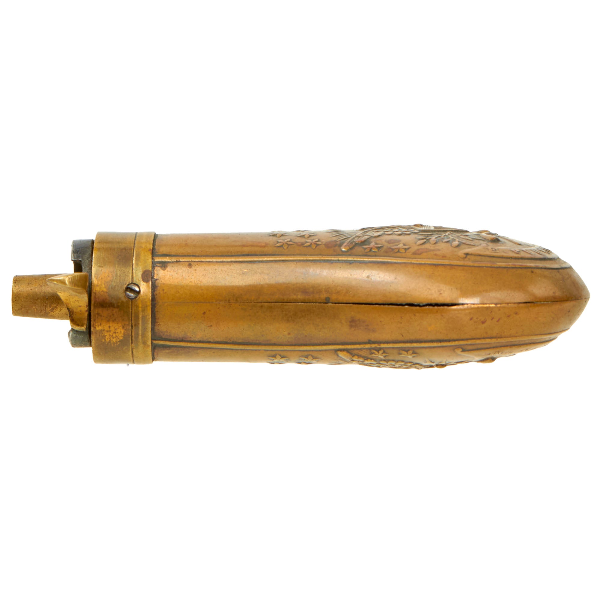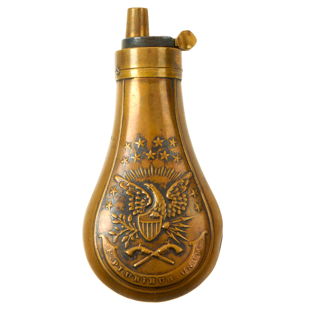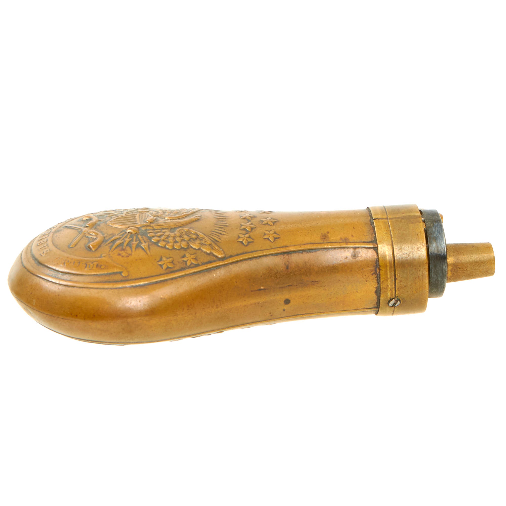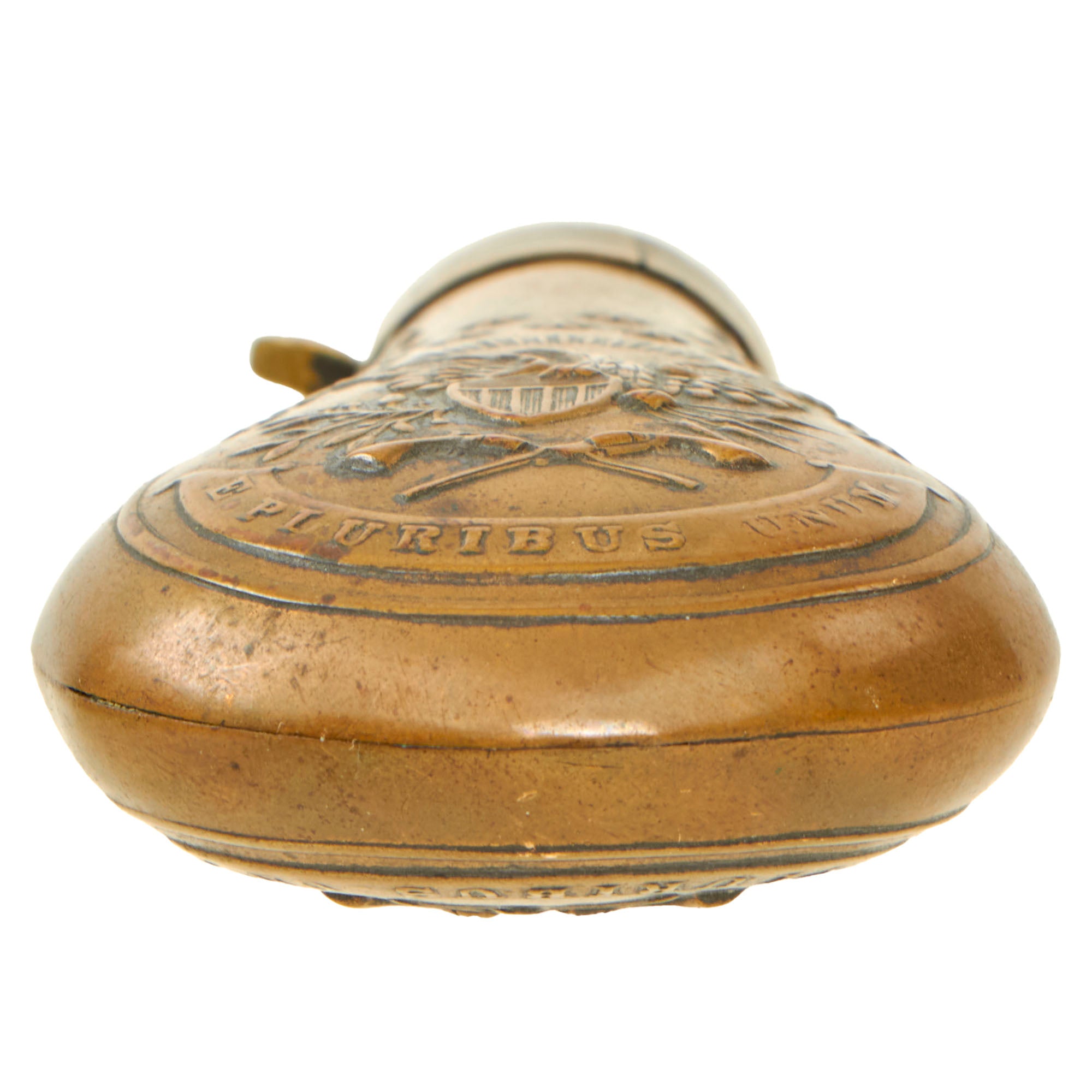 Original Items: Only One Set Available. Here we have a lovely U.S. Civil war copper / brass powder flask for a .31 Caliber revolver. The powder flask is a classic Colt pocket percussion revolver style, and has a lovely "Federal Eagle" with E. Pluribus Unum on both sides, with a spring loaded closure. The spout is screwed on both sides so it’s not easily removable, and the closure still works relatively well. The metal has patinated very nicely, giving it a fantastic look.