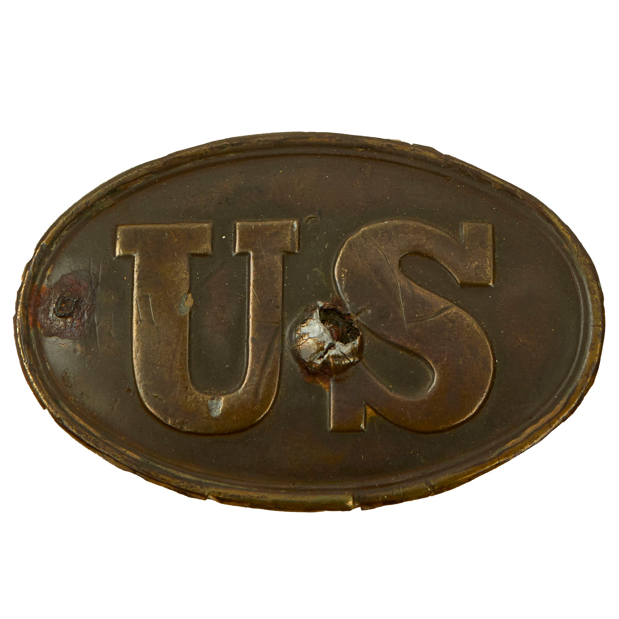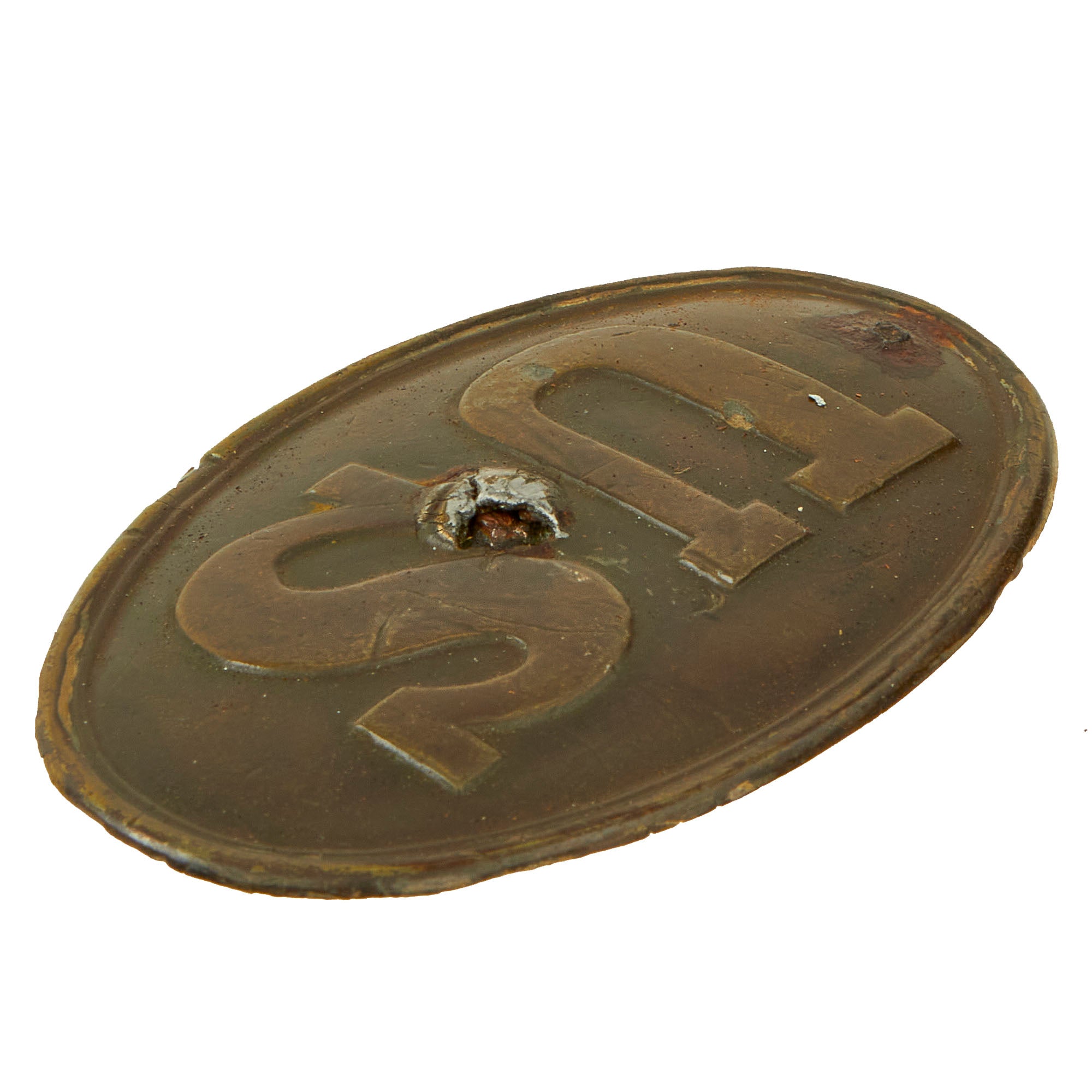 - Pattern 1861 Cartridge Box Plate: This is a genuine Pattern 1861 pattern Federal issue leather cartridge box front plate. The front plate is the standard brass with tin plating on the back, missing the two loops on the end for attachment. Normally it would be held onto the front of a cartridge box with a small leather strap. It has some slight denting on one side, a possible ricochet mark and finish loss, but overall looks incredible for the age and having been ground dug. The reverse side of the plate has a small Manassas label tag.