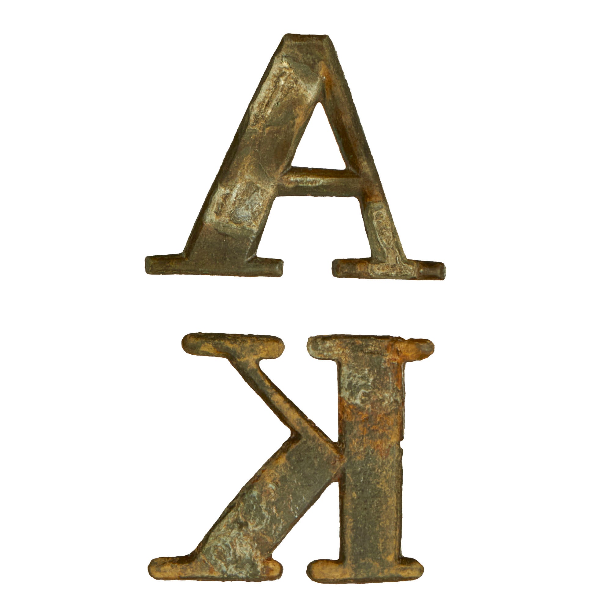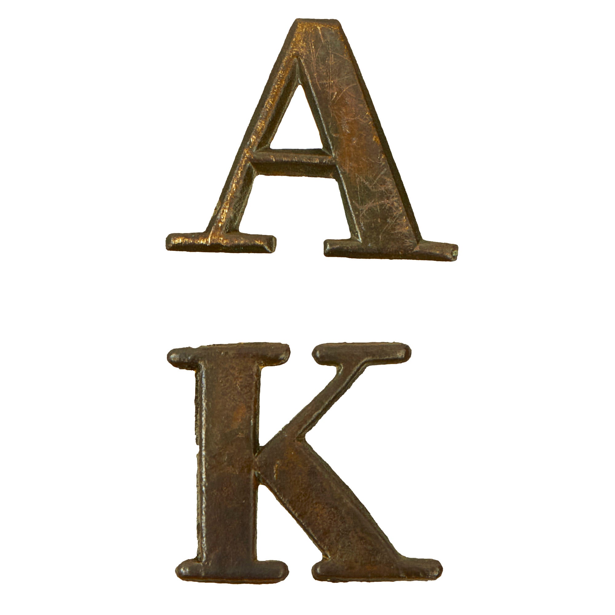 - x2 Company Letter Badges (K & A): Both are in good condition with nearly all of the finish missing and are presented without any extensive damage.