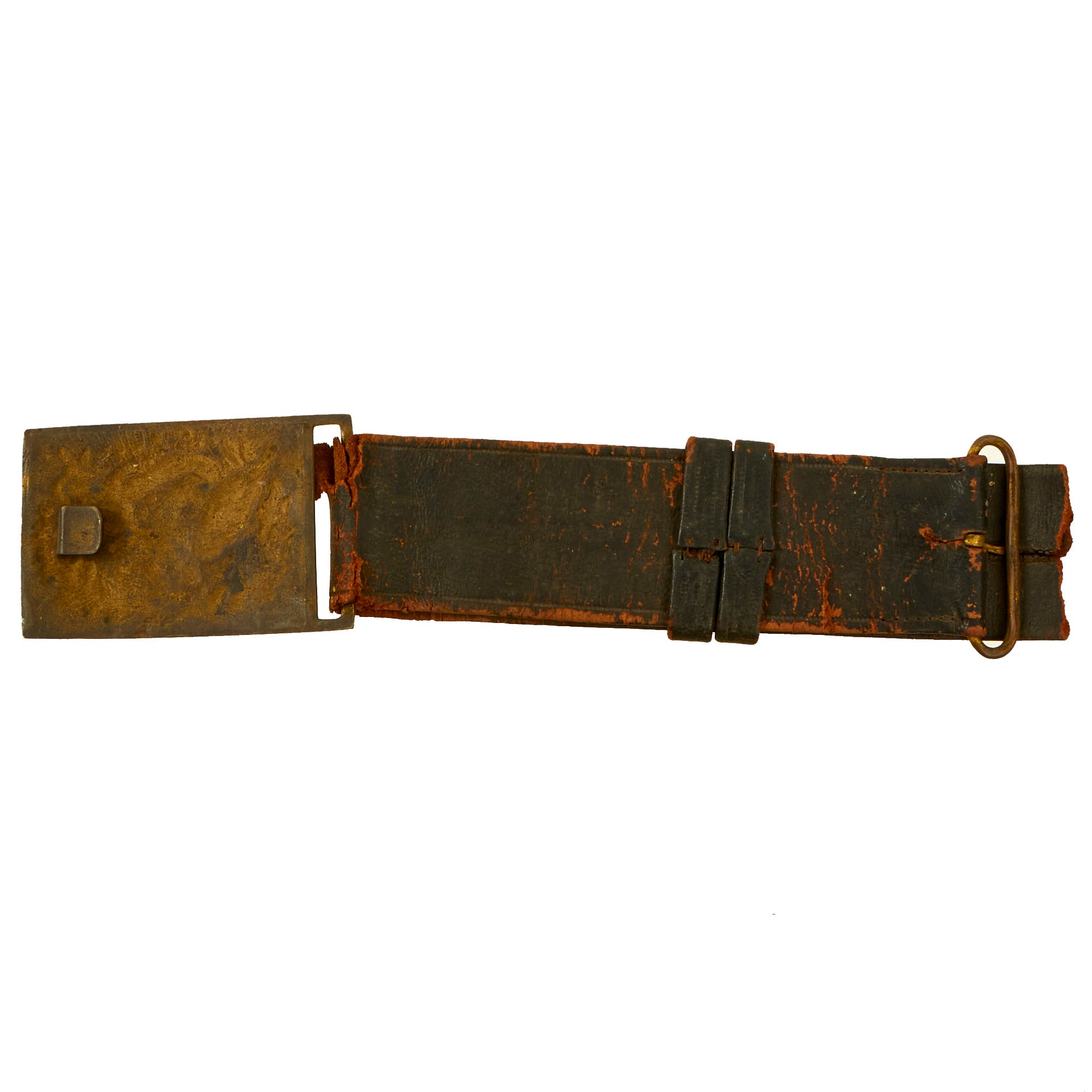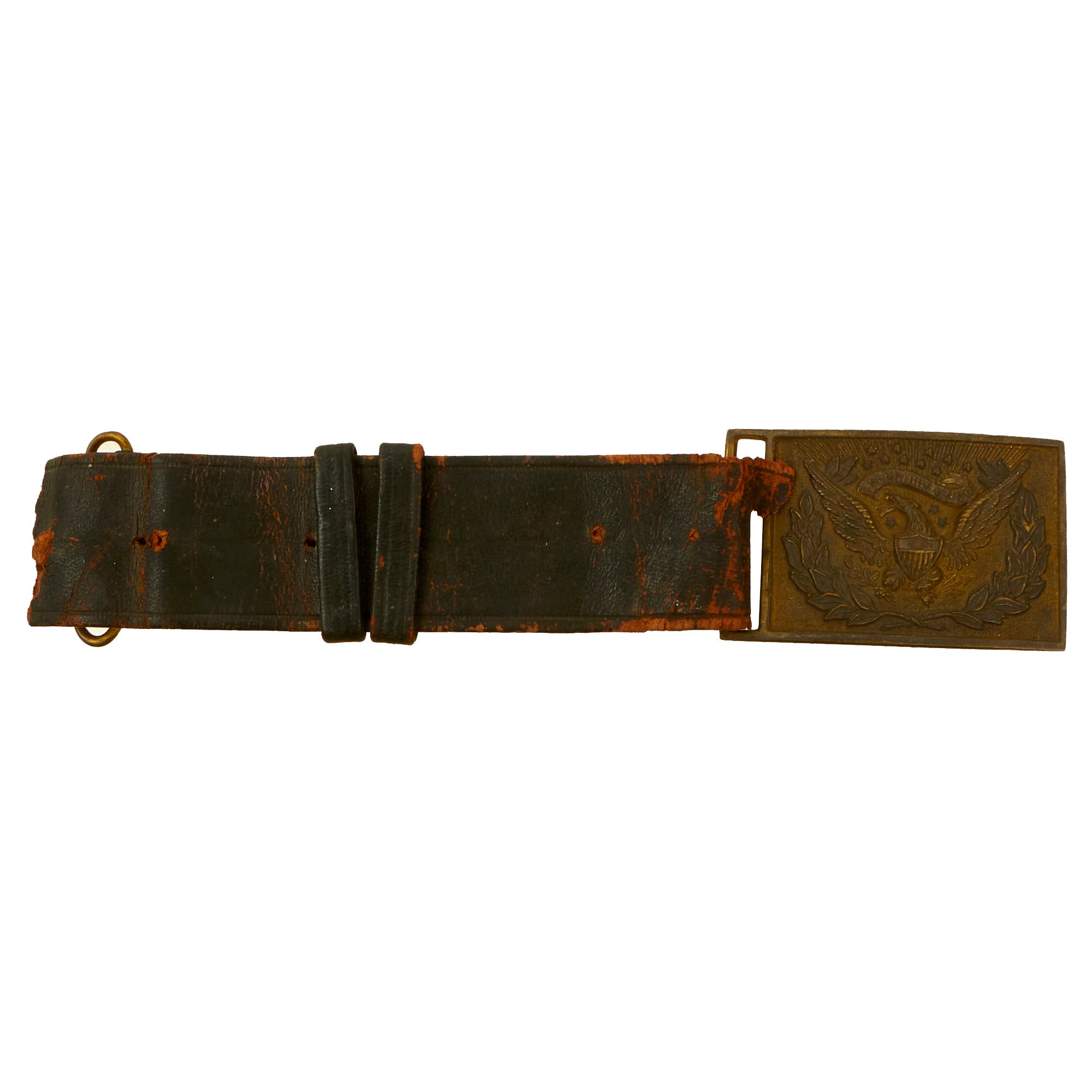 - M1851 Belt Buckle: The regulation 1851 pattern, brass, eagle waist belt plate is the rectangular, concave, detailed plate that measures approximately 83 mm long x 53 mm high, the cast brass plate has an integral tongue on the reverse and the one-piece, nickel-silver wreath terminating beneath the eagle’s wings is unfortunately missing all of the original finish. The plate face has an even patina and exhibits well-defined edges. All the brass hardware retains a nice, aged patina. Surprisingly enough the buckle still retains part of the original leather belt.