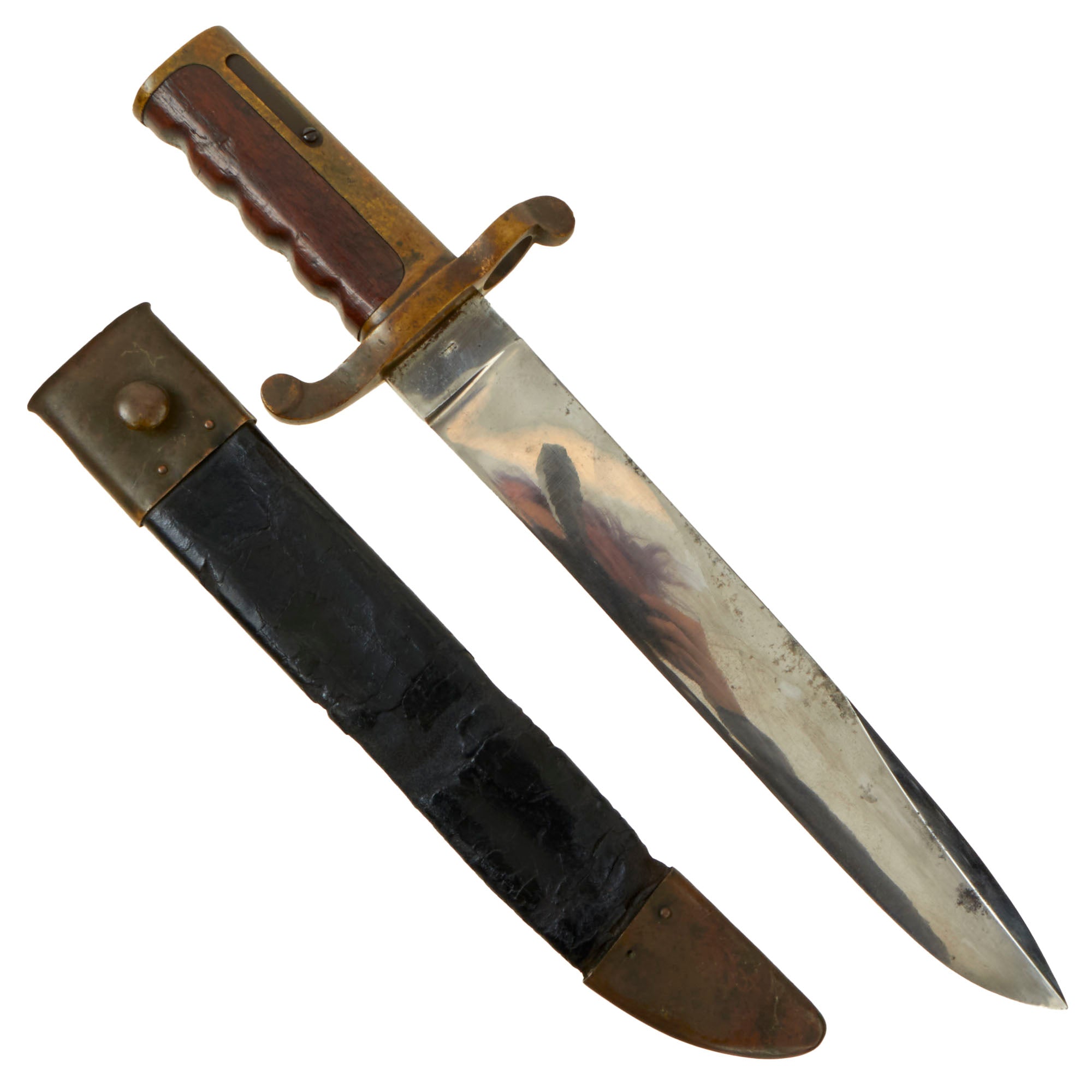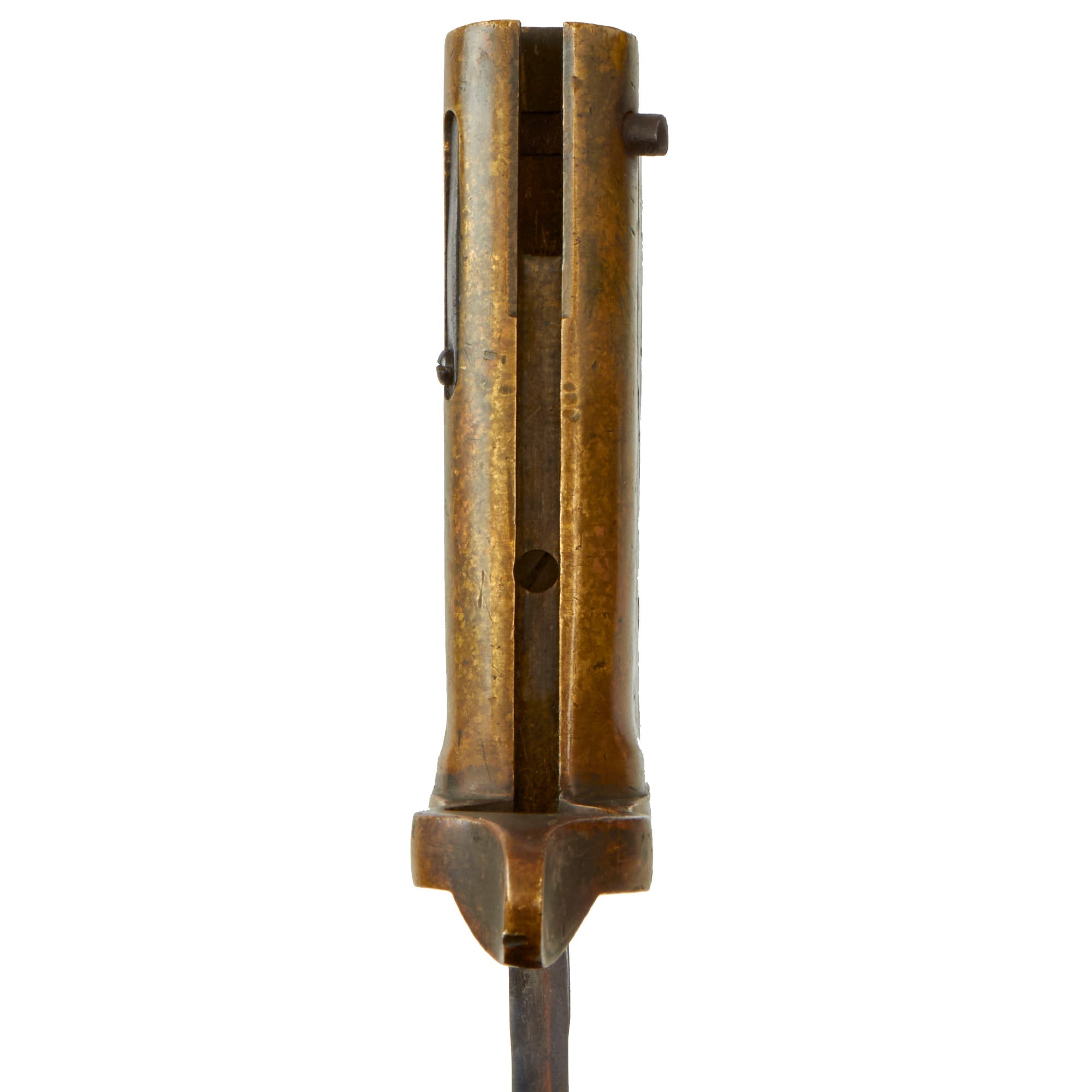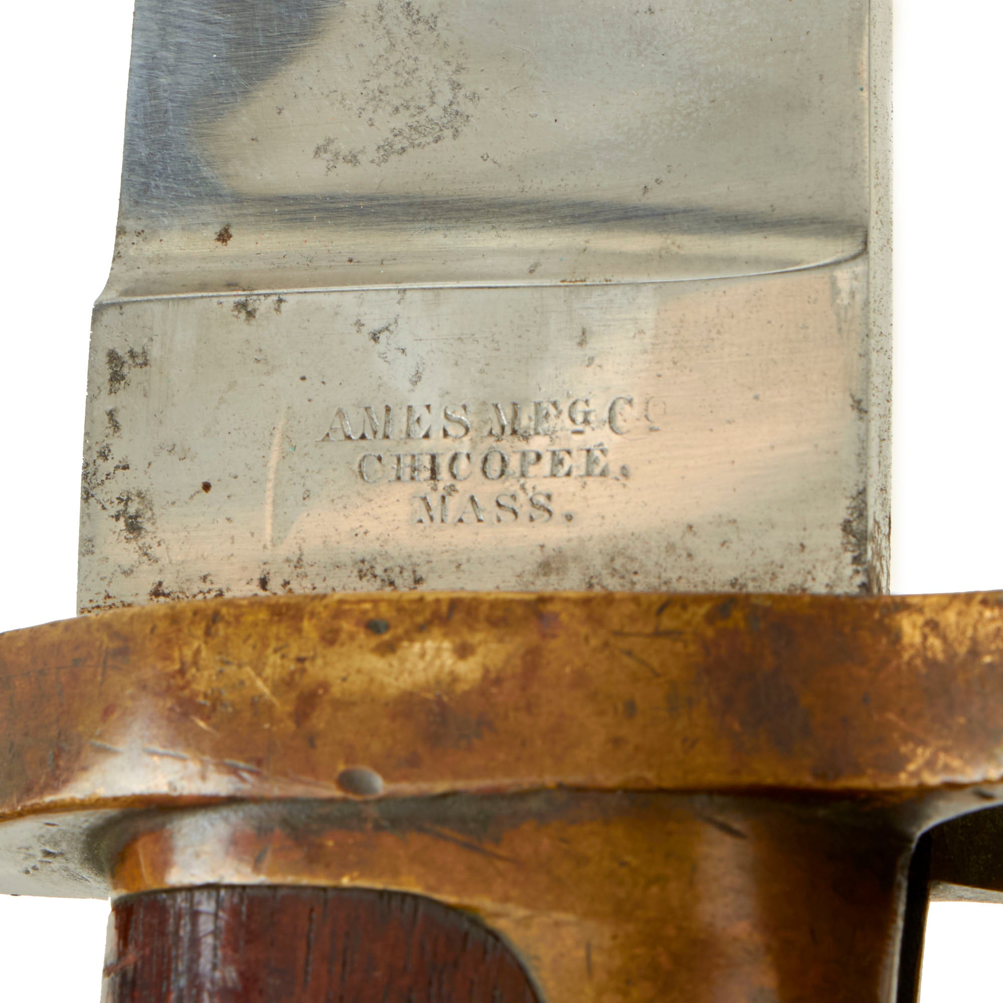 Original Item: Only One Available. Now this is a rare bayonet to come across! Designed in 1856 by U.S. Navy Admiral John A.B. Dahlgren for use aboard his ship, the USS Plymouth, this Ames-marked knife replaced the saber-style bayonet that was first issued with the Plymouth Whitney Rifle musket. The Dahlgren bowie knife bayonet is considered to be one of the best bayonet designs of the nineteenth century. First produced for the Navy by well-known arms maker Ames Manufacturing Co of Chicopee, Massachusetts in September 1861, this finely-crafted weapon features an unfullered, bowie-shaped spear point blade 11 ¾” long with a clipped point tip on the obverse side. Still quite sharp, the hefty, 3/8" thick steel blade is in excellent condition with just scattered areas of surface rust and pitting.