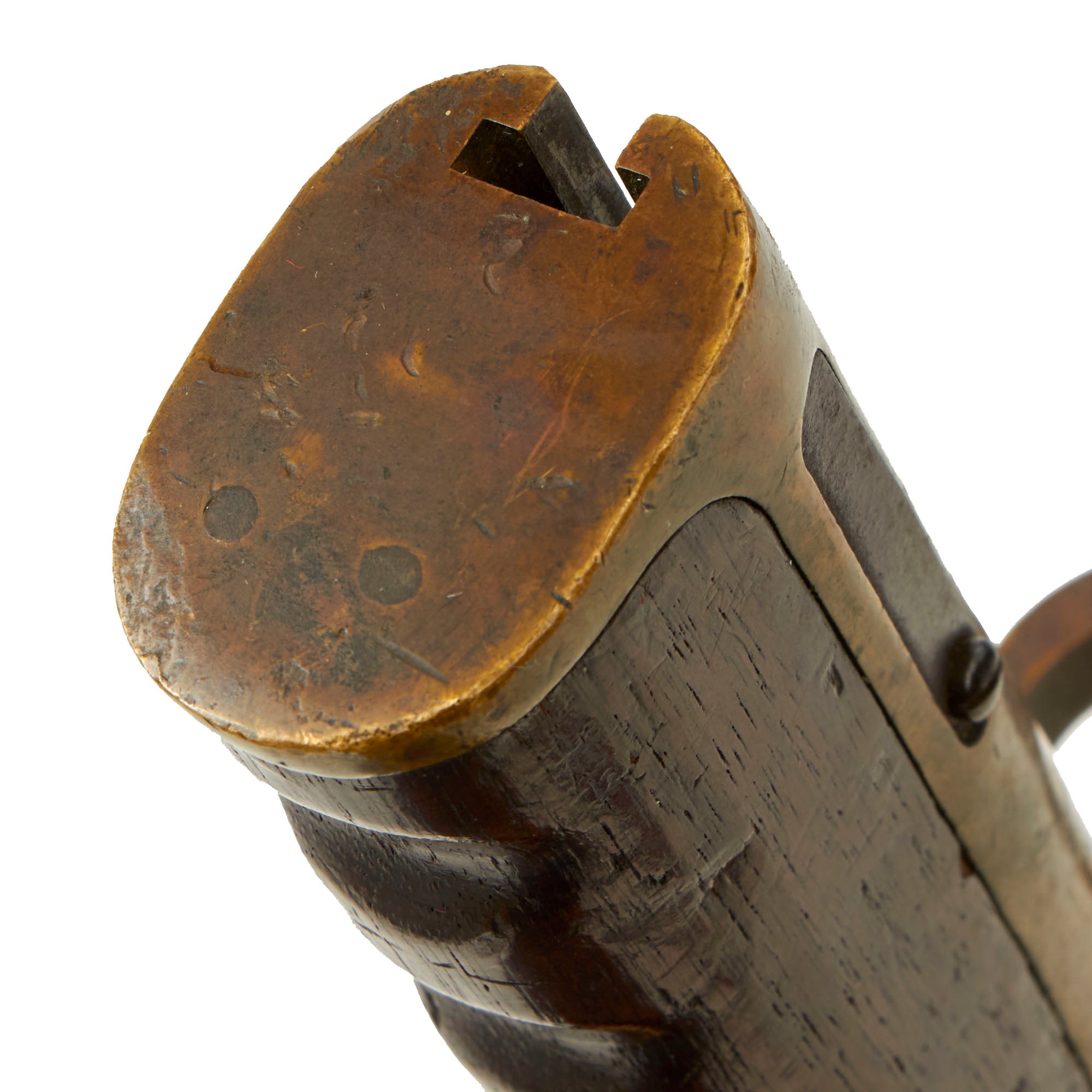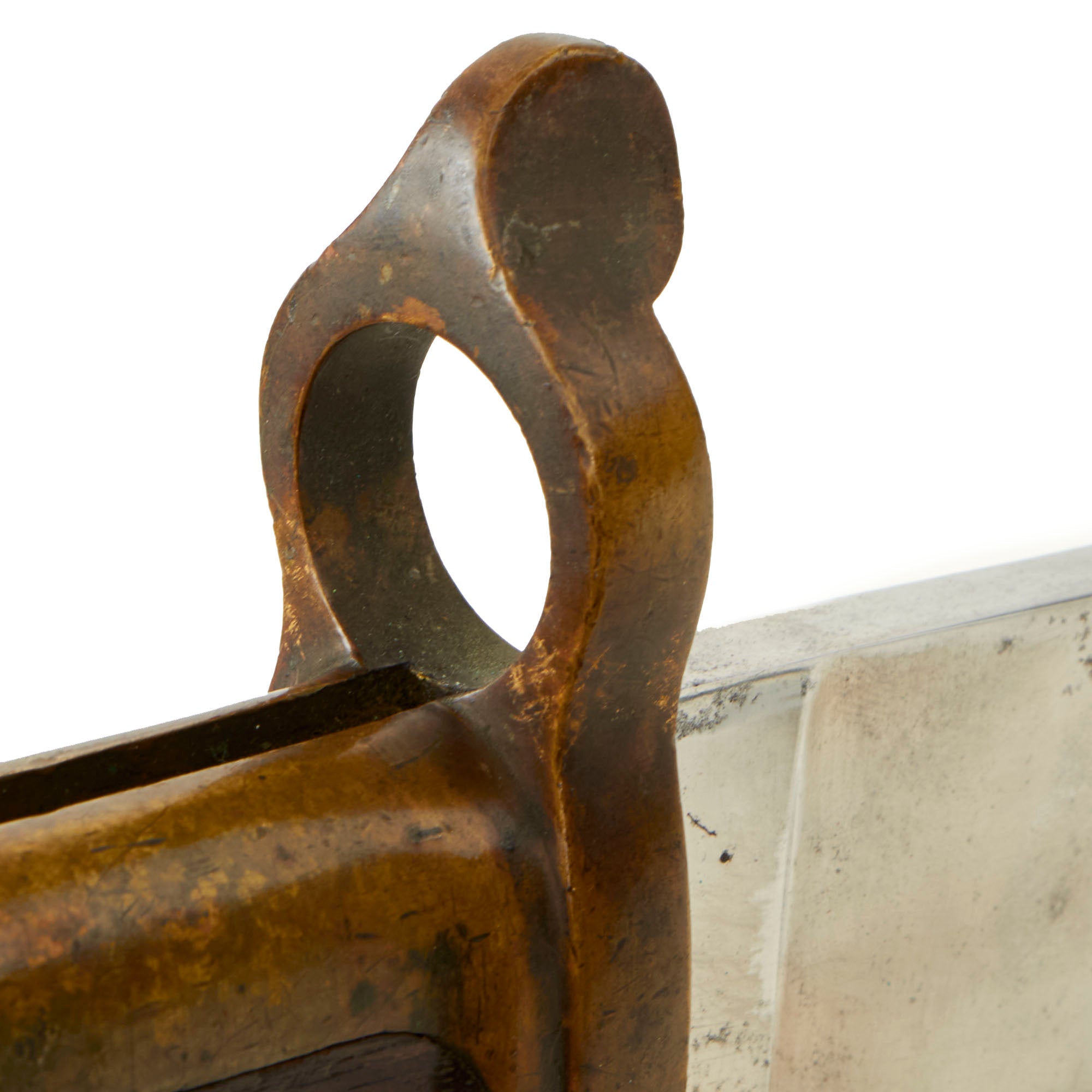 The knife has a one-piece pommel, guard and back strap of heavy brass with a one-piece walnut grip fitted between the pommel back strap and the guard. All brass has a lovely dark bronze patina with a few dark oxidation spots scattered about between the light dings and scuffs marks. Bottom of the walnut grip features four finger grooves for a positive grasp. Brass hilt is secured to the grips by a long brass wood screw vertically traversing the hilt. Admiral Dahlgren's own description of this foreboding weapon states "The special bayonet is a short, broad and stout knife of the well known bowie-pattern, the principal use of which I designed to be in the hand in close conflict as in boarding."