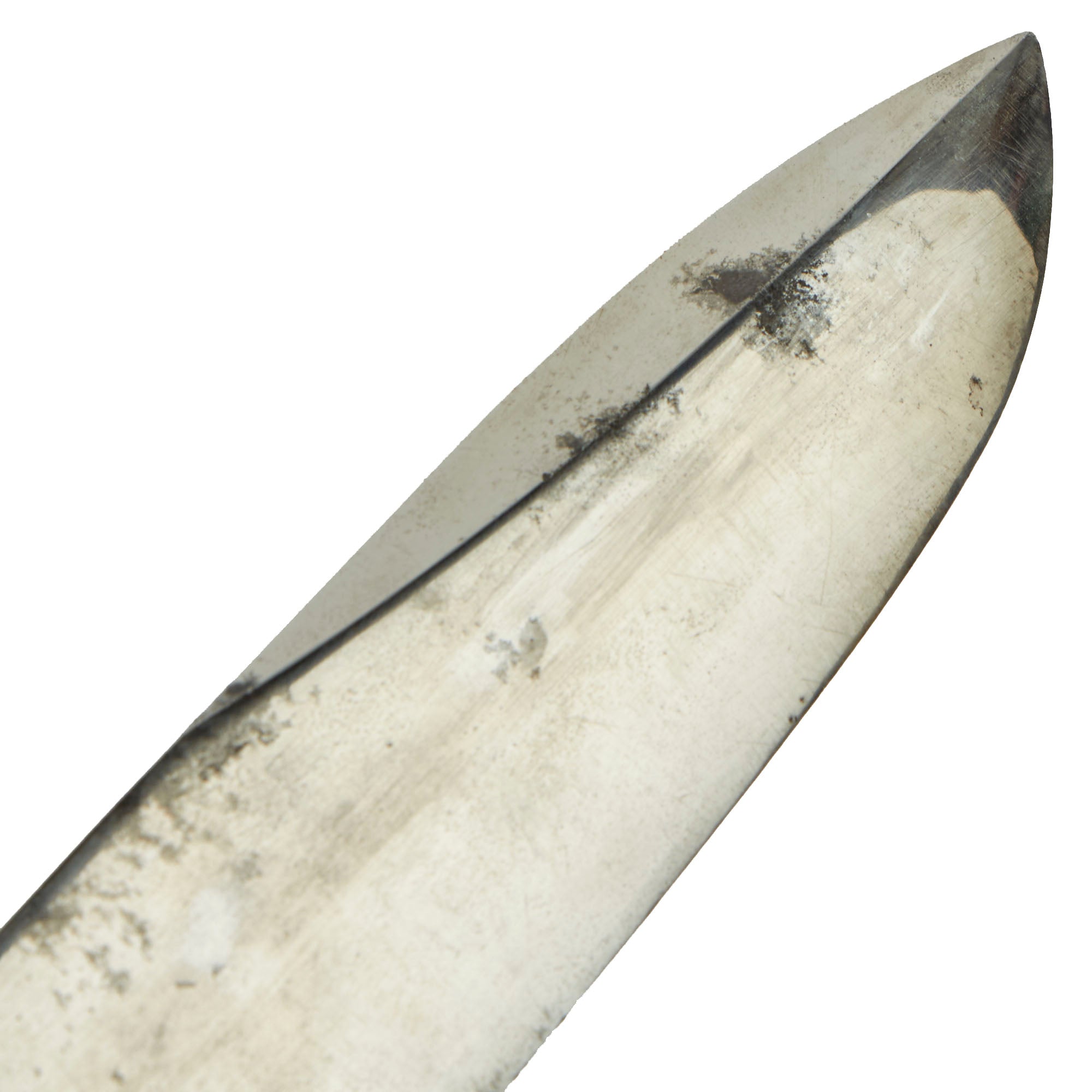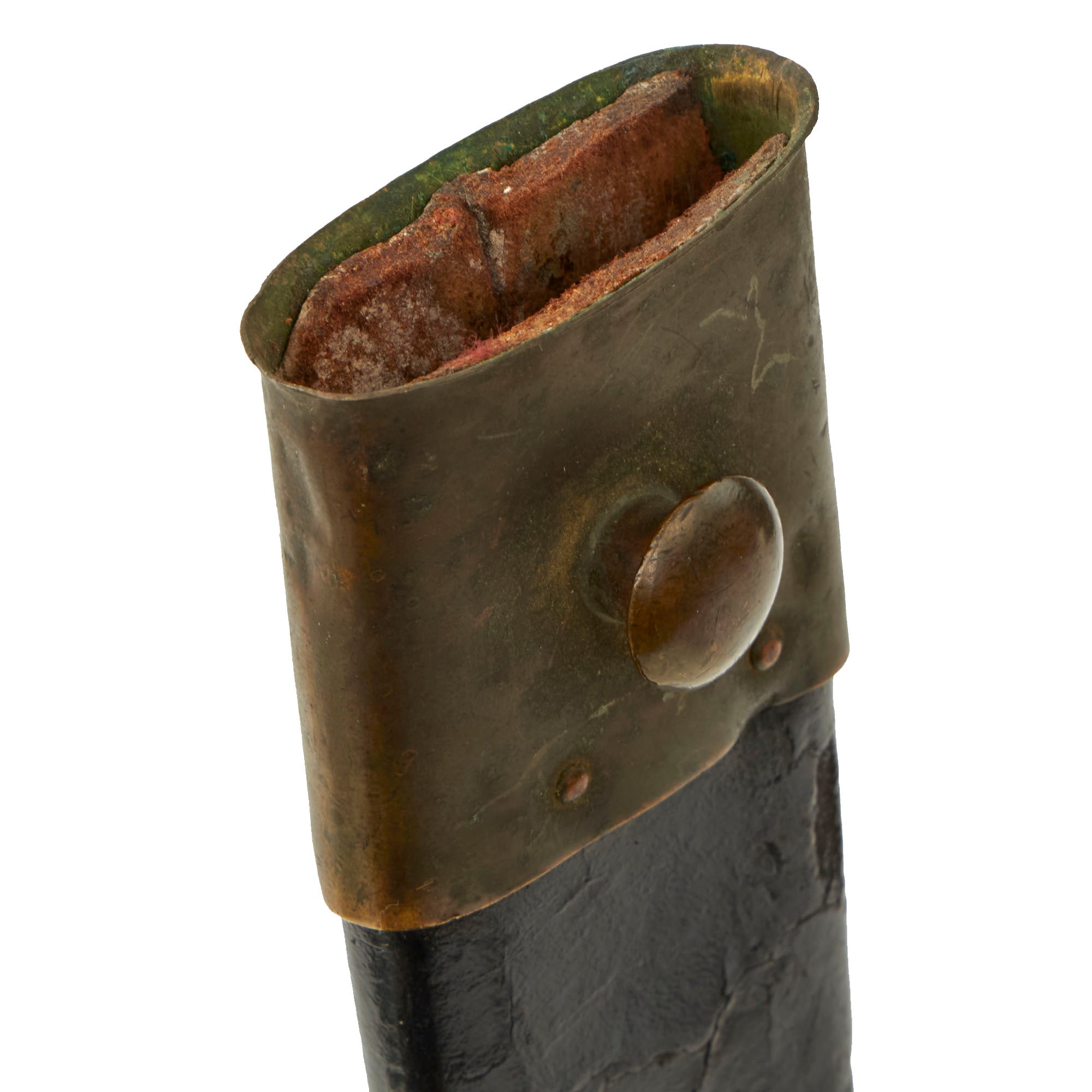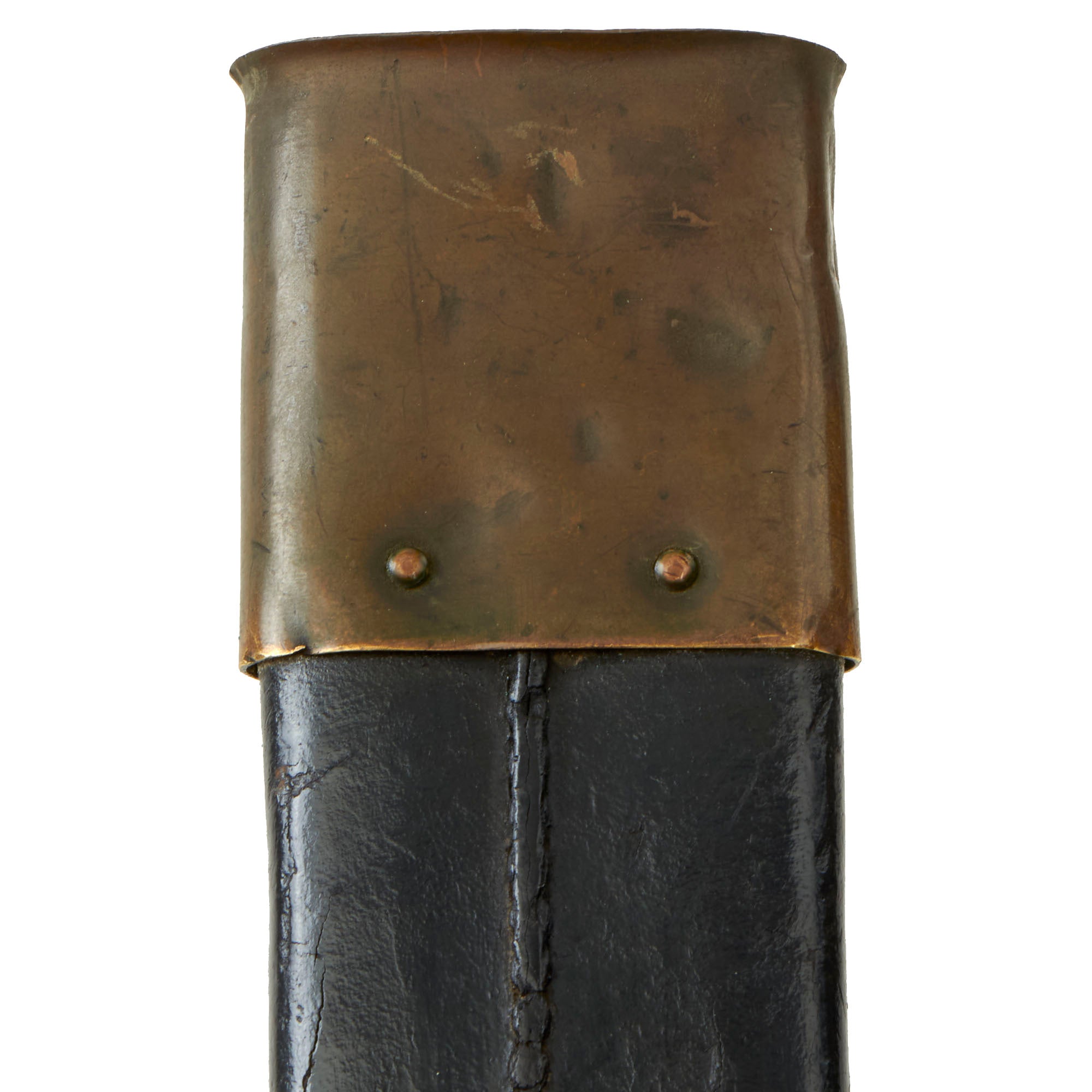 Included is the rare, original leather scabbard in unmarked, good condition but does have the expected wear and cracking to the leather. Both the throat and tip are constructed of brass while the sheath portion is of blackened bridle leather. Brass throat collar tightly secured with four thin brass rivets. Brass tip is just slightly loose but retains 3 of the 4 rivets.