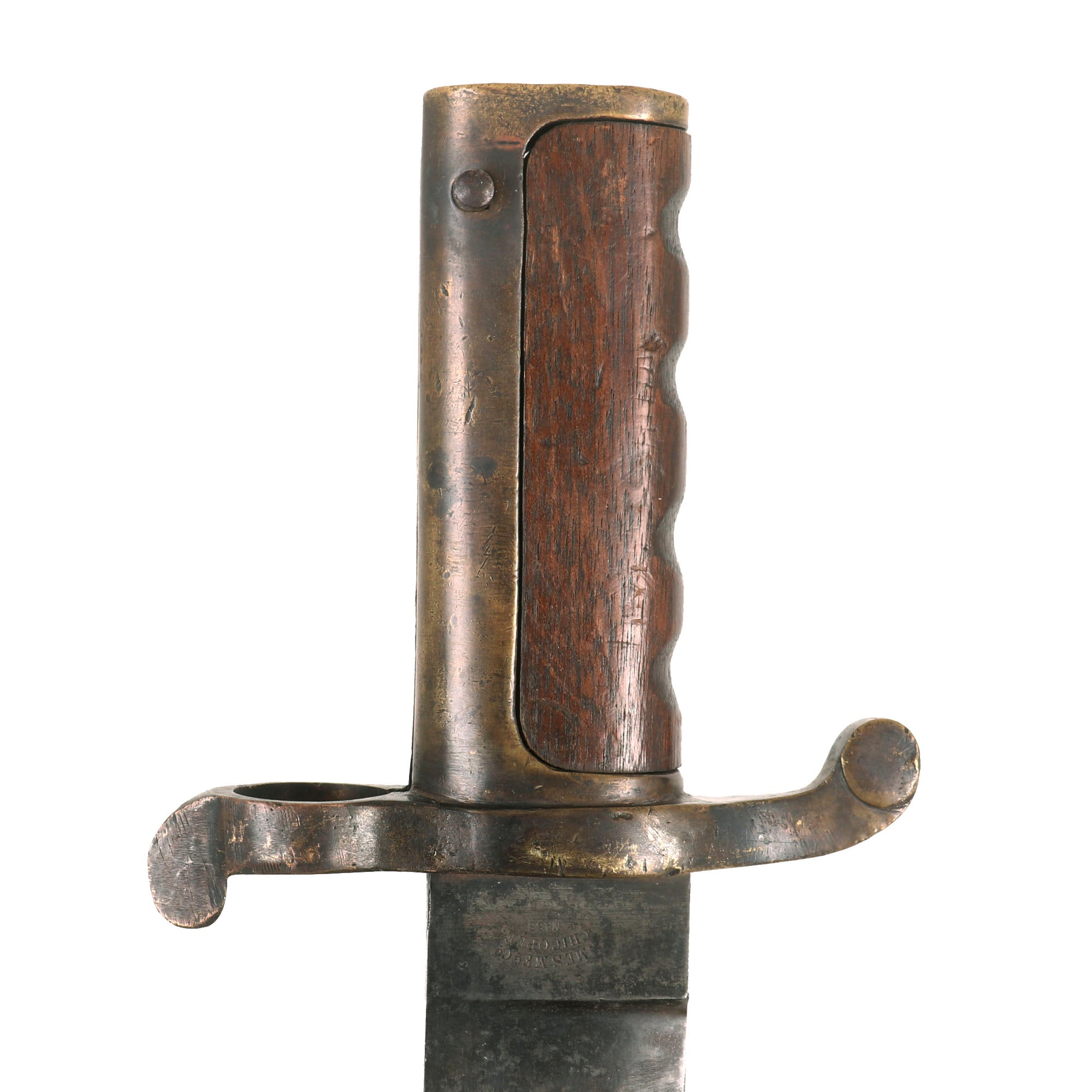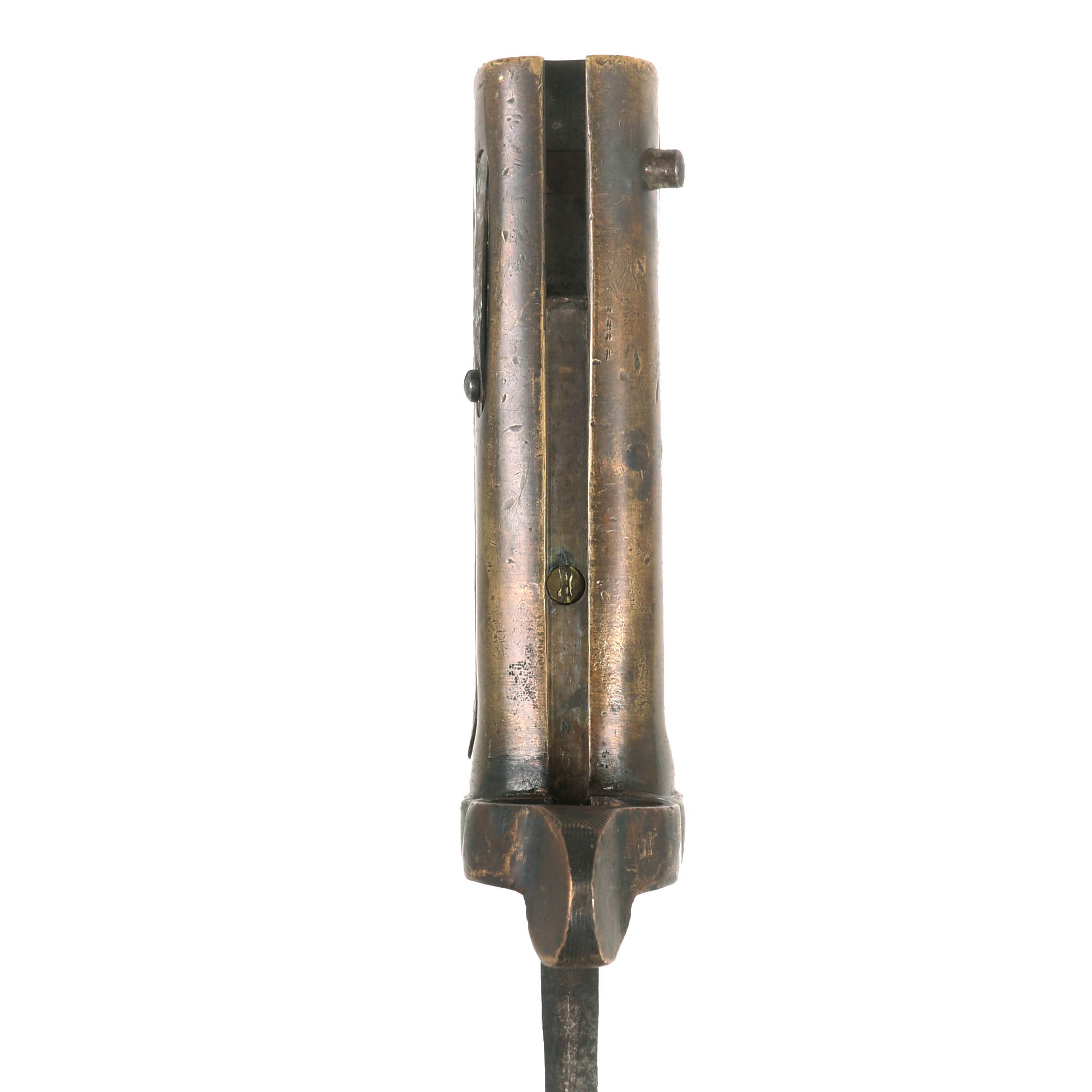 Original Item: Only One Available. Now this is a rare bayonet to come across! Designed in 1856 by U.S. Navy Admiral John A.B. Dahlgren for use aboard his ship, the USS Plymouth, this Ames-marked knife replaced the saber-style bayonet that was first issued with the Plymouth Whitney Rifle musket. The Dahlgren bowie knife bayonet is considered to be one of the best bayonet designs of the nineteenth century. First produced for the Navy by well-known arms maker Ames Manufacturing Co of Chicopee, Massachusetts in September 1861, this finely-crafted weapon features an unfullered, bowie-shaped spear point blade 11 ¾” long with a clipped point tip on the obverse side. Still quite sharp, the hefty, 3/8" thick steel blade is in excellent condition though the blade does have heavy darkening and staining on the blade, but is presented without extensive damage.