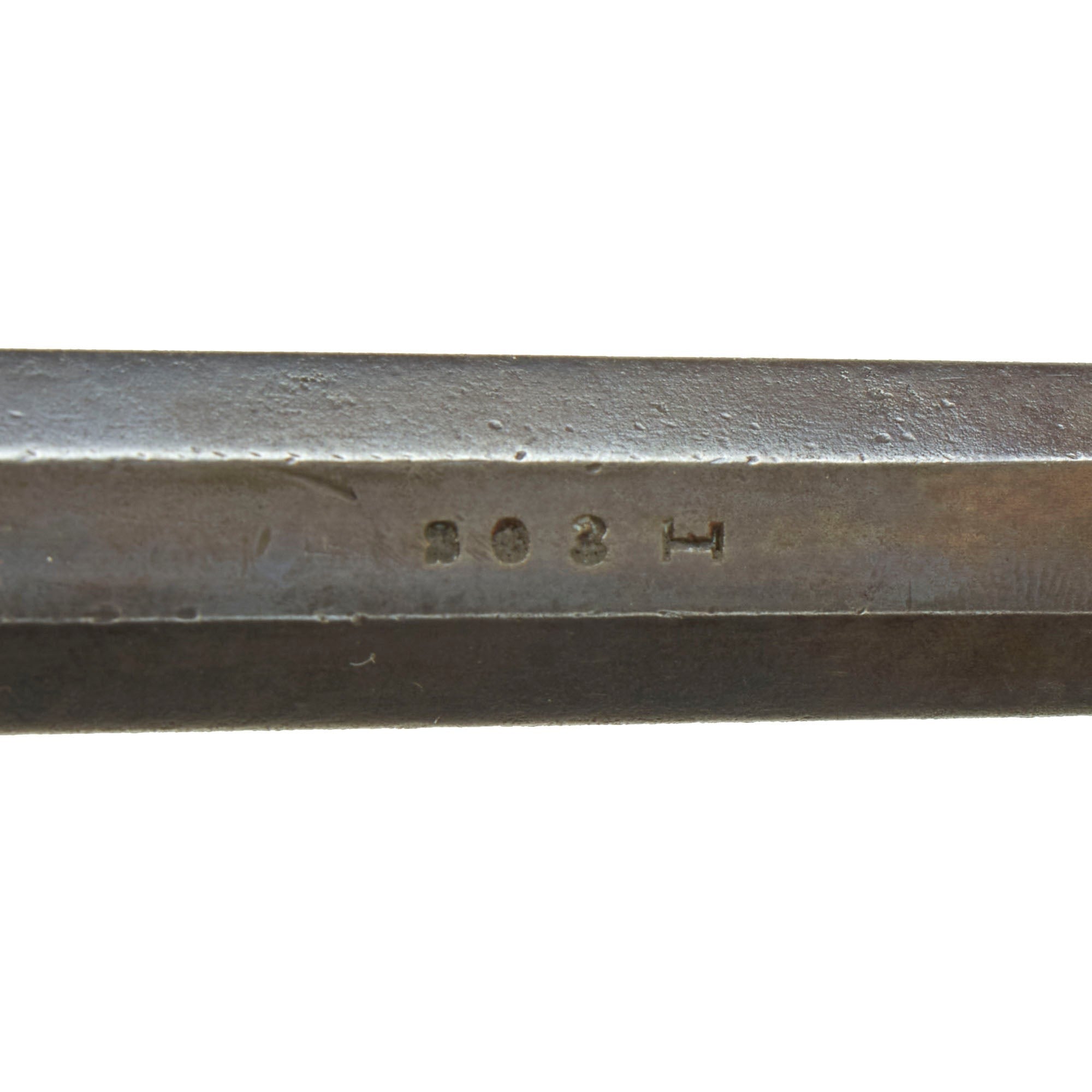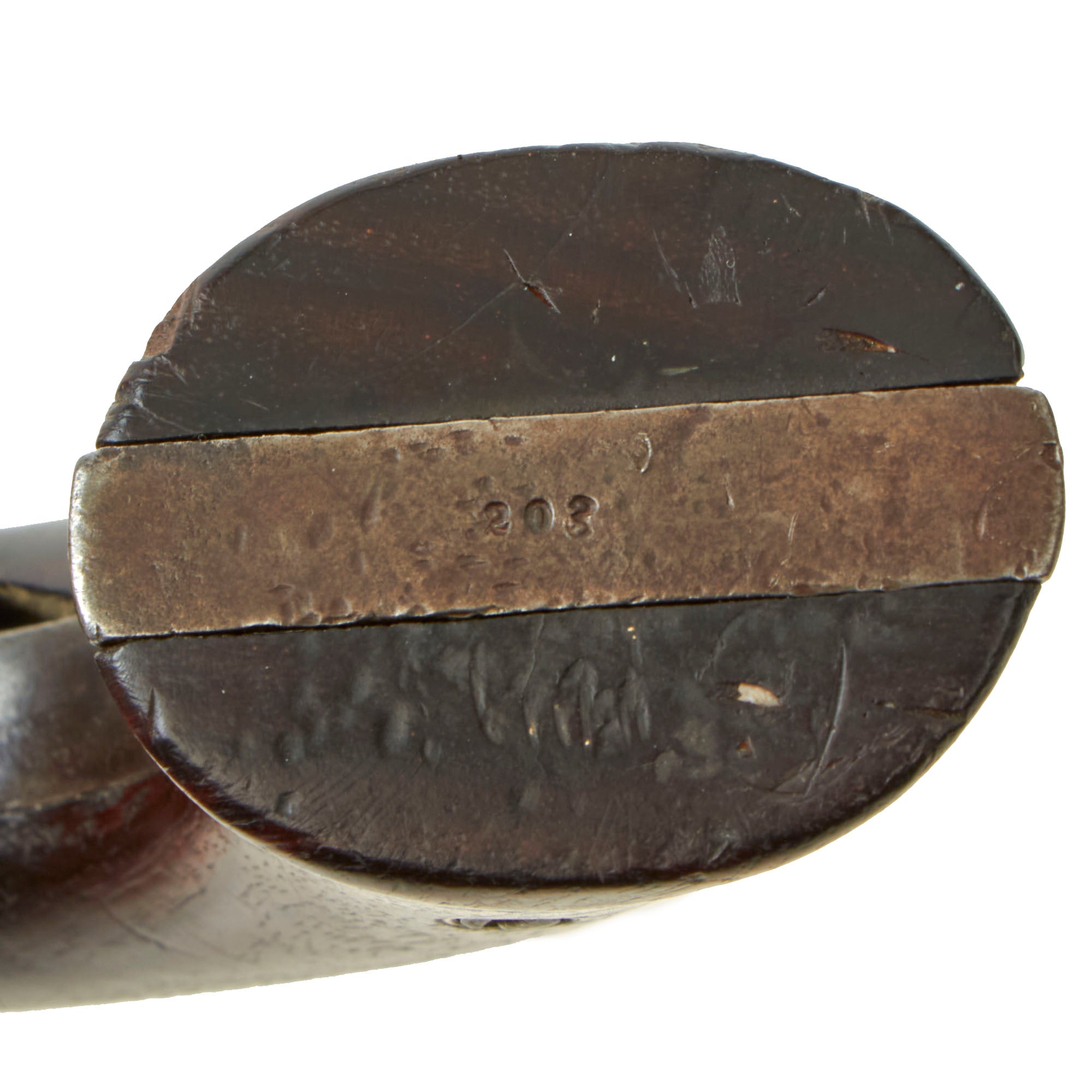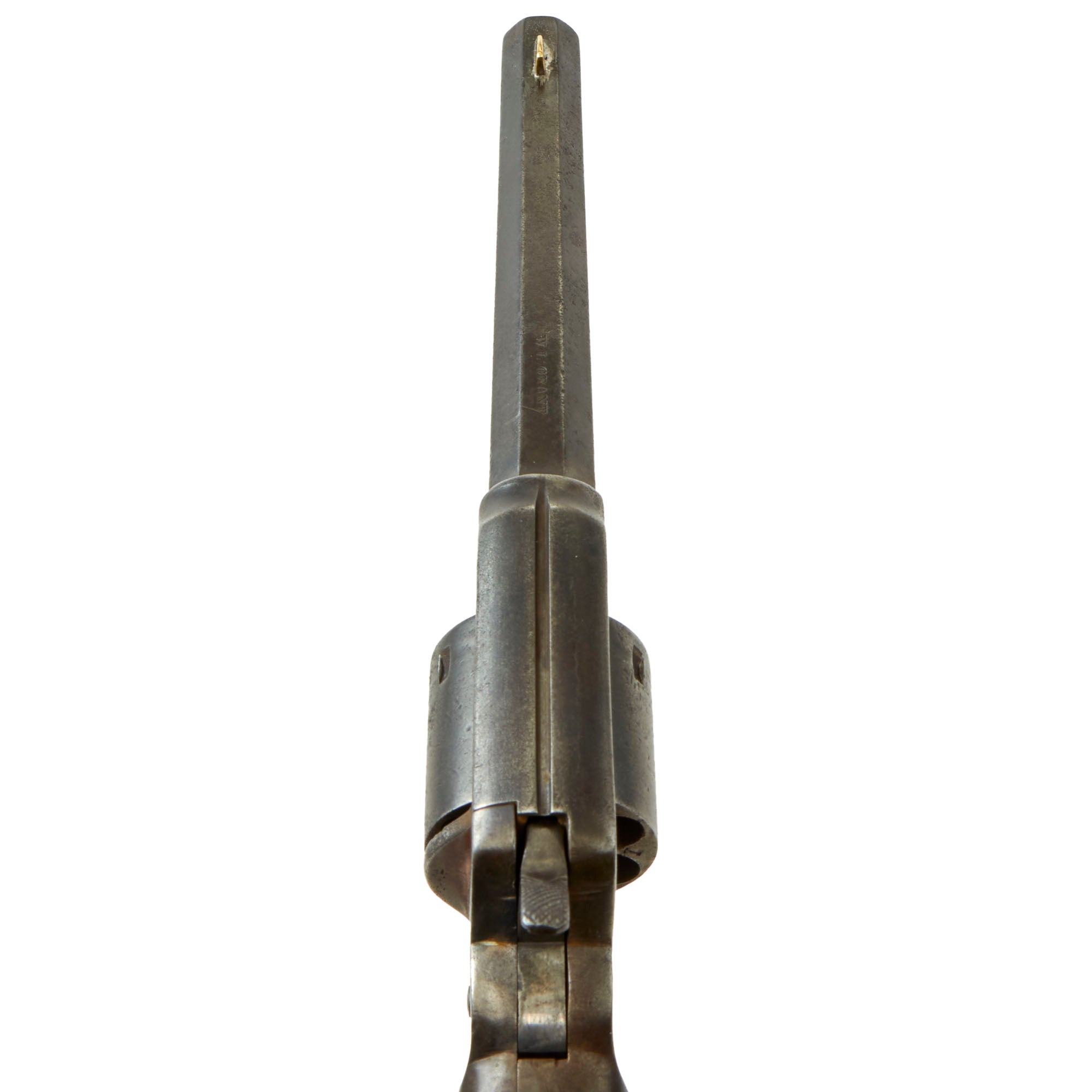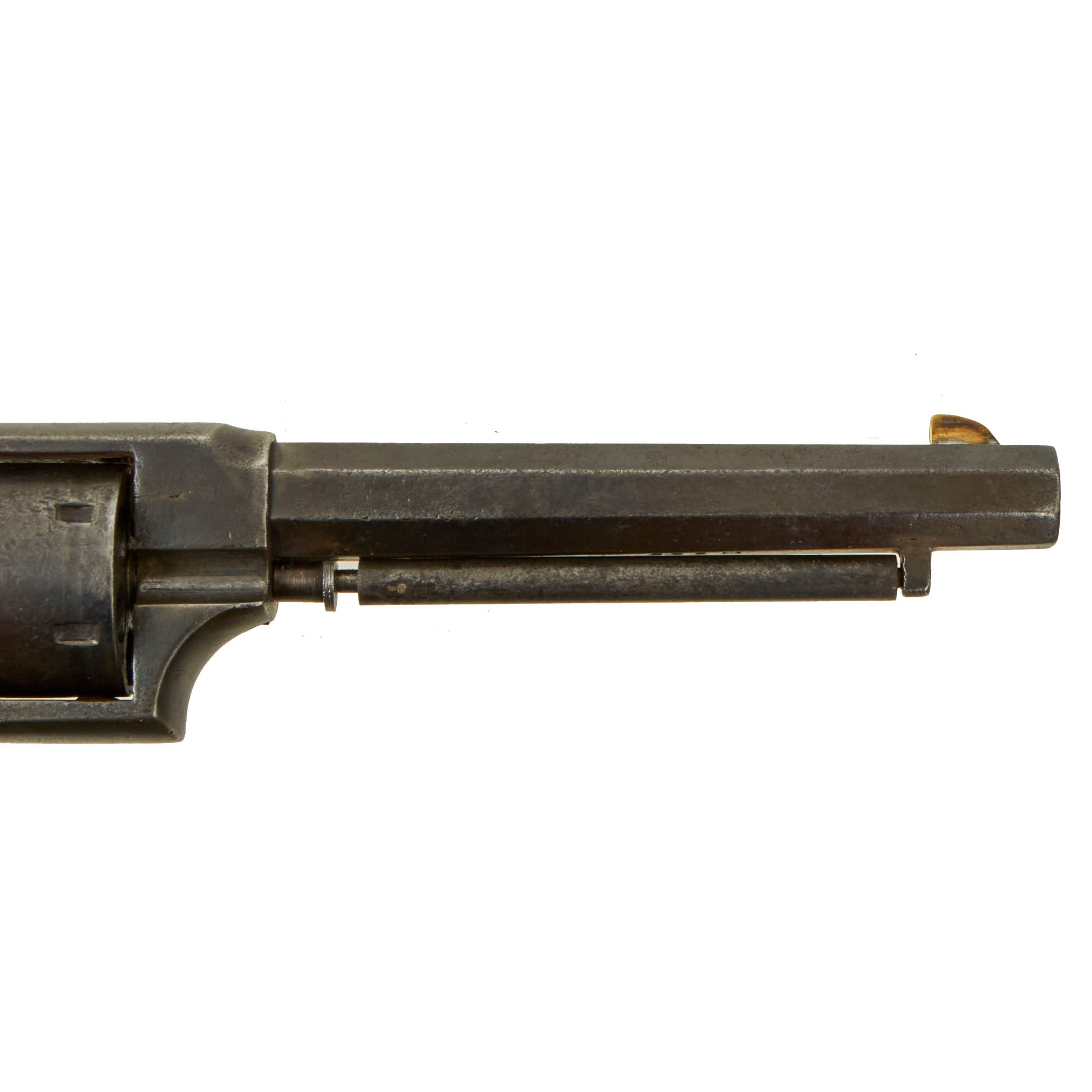 It is in lovely condition with a worn patina overall, and the grips showing a lovely dark red brown color with moderate wear on the exterior. They are quite striped, leading us to believe that they may be made from rosewood, and not the usual walnut. The revolver functions correctly, however action can be a bit finicky, as it is over 150 years in age. The cylinder lockup is relatively weak, as the lock is worn, so the cylinder can be rotated a good amount even at full cock. We checked the bore, and it is in very good condition, still showing clear lands and grooves, with some light to moderate overall fouling and wear. Definitely above average for a Civil War period black powder revolver. It still retains the spring-retained ejector rammer under the barrel, which are almost always lost.