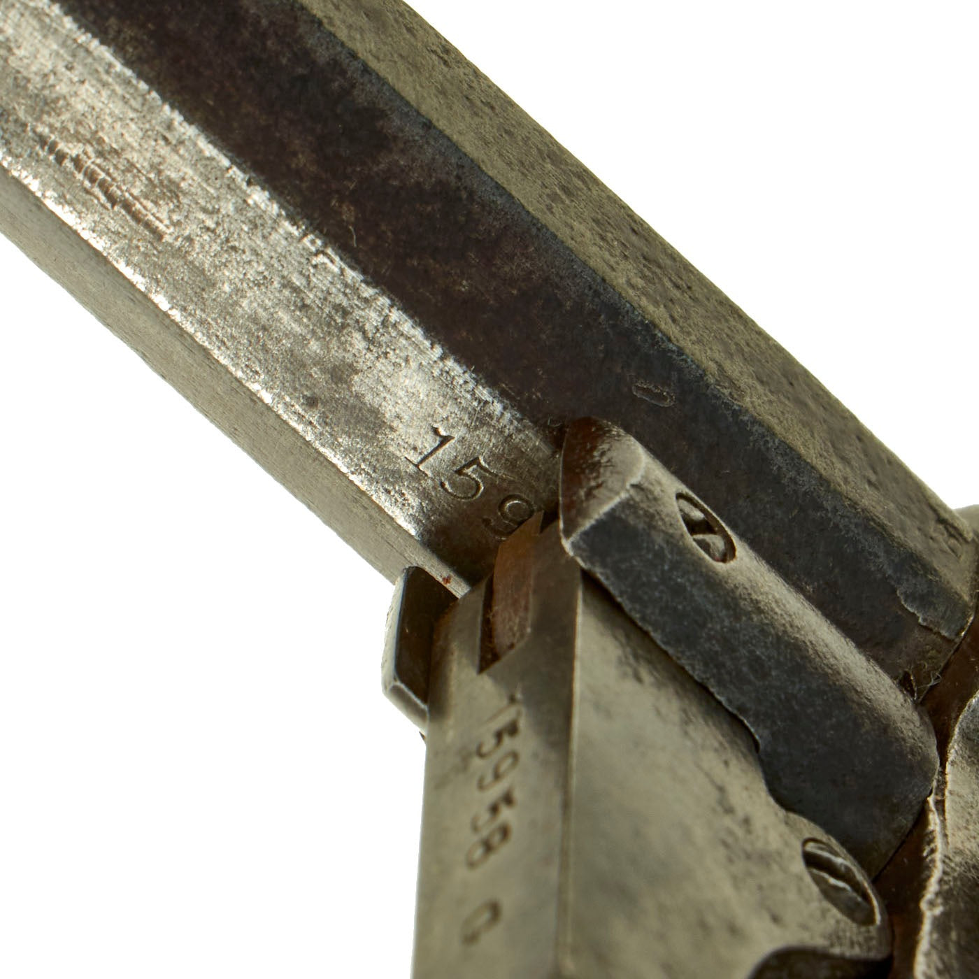 The underside of the barrel still bears original serial number 15958 under the loading lever, as well as on both components of the loading lever. This number is also stamped on the inside of BOTH grip scales, as well as on the back of the cylinder. That make this a very nice "ALL MATCHING" example, with no parts swapped out over the years! Revolvers in this serial number range were right at the changeover from the 2nd Model 3rd Type to the 4th Type, which only really involved the engraving on the cylinder. As the engraving is completely worn, there is no way to tell whether it is a 3rd or 4th type.