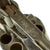 The revolver is fully functional, and the action works well, with good indexing and a strong cylinder lock up. We did not notice any of the usual finicky behavior we often see on revolvers of this age. All of the cap nipple cones are present, and show wear and oxidation from use. Five of 6 are clear, and it looks like one or two may have been replaced at some point. The bore shows strong lands and grooves, but also wear and powder fouling, typical of used percussion revolvers. The small brass trigger guard (correct for this model) has a pleasing aged patina.