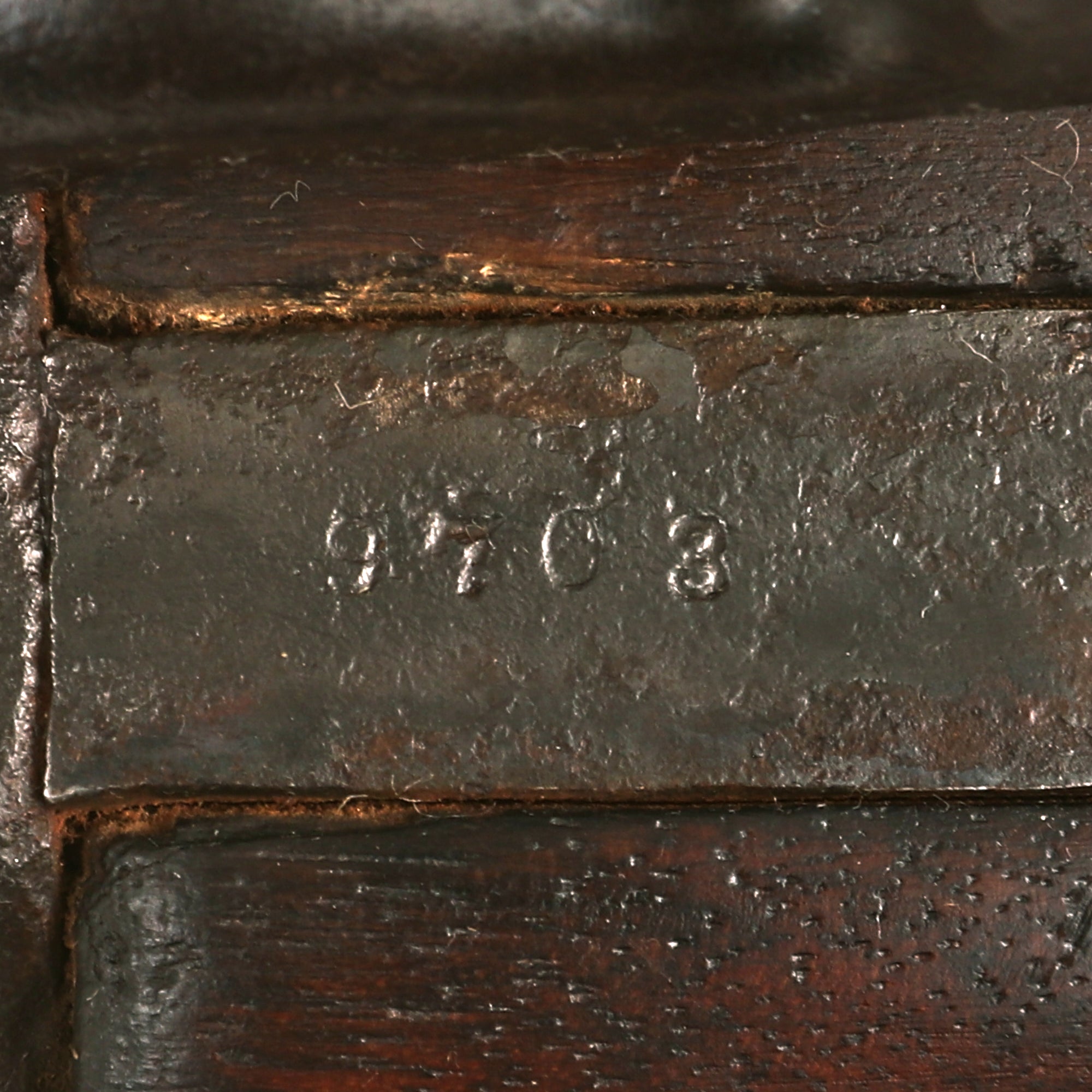 It is dated 1864 on the lock plate tail, and has the correct Federal Eagle with a U.S. banner to the right. Under the bolster is a U.S. / WHITNEY-VILLE stamping, indicating Whitney production. The barrel nocks form still has some markings, although the date is missing, but the serial number 9703 is clearly stamped onto the barrel tang. The left barrel facet is very faintly stamped with the standard V / P / Eagle's Head proof marks, and under this are the very faint initials of the ordnance sub inspector, F.C.W.. This is the marking for civilian inspector Frank C. Warner, who is listed as inspecting Remington M1866 .50RF Pistols, Whitney .36 Percussion Revolvers, Plymouth Rifles, and M1867 Remington Navy Carbines. There is also a very worn FCW boxed cartouche on the left side of the stock, although the letters are too faded to read, the shape of the cartouche is exact to other examples we have seen. The barrel band is still correctly "U" Marked, and the butt plate tang has a U.S. marking on it.